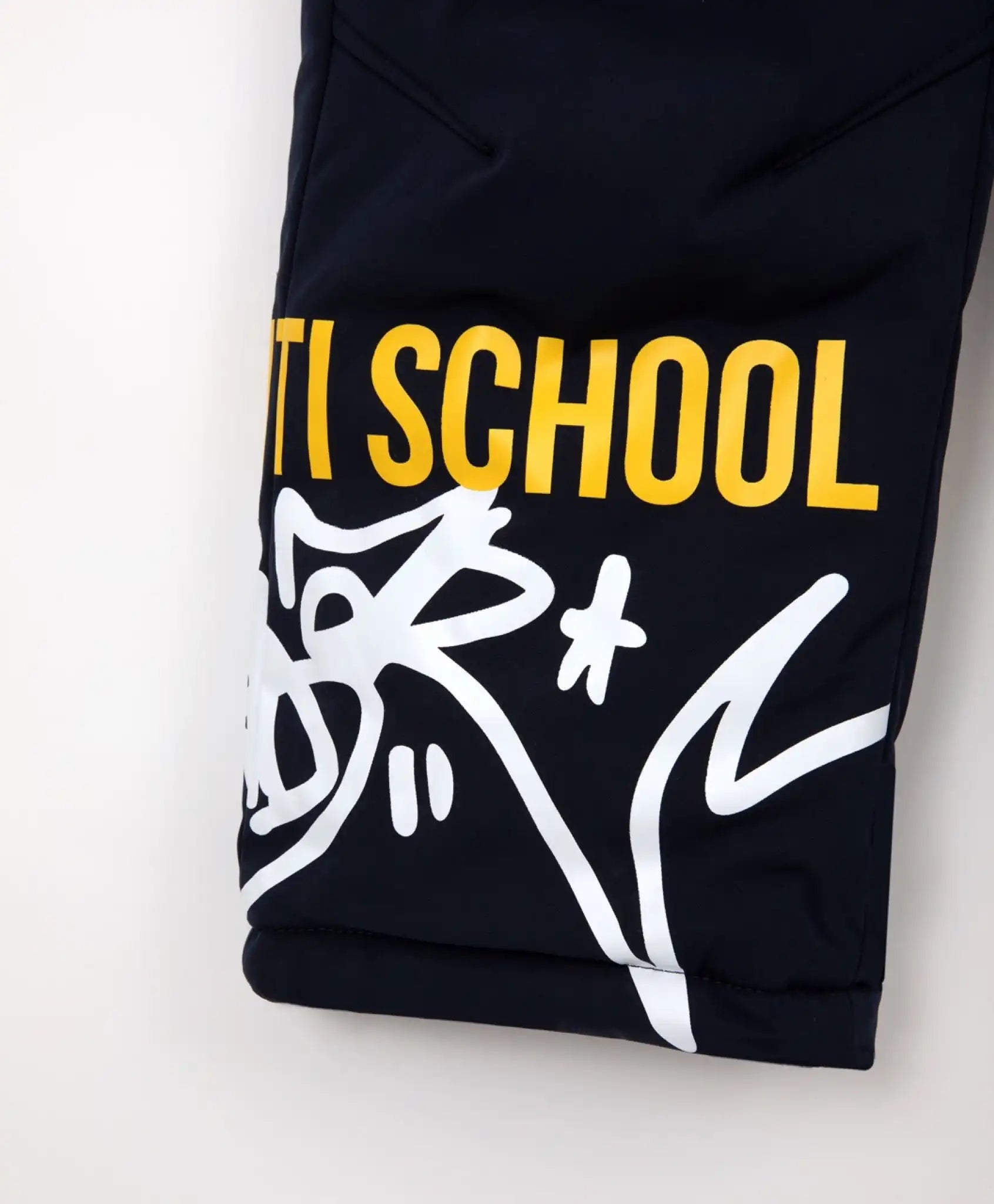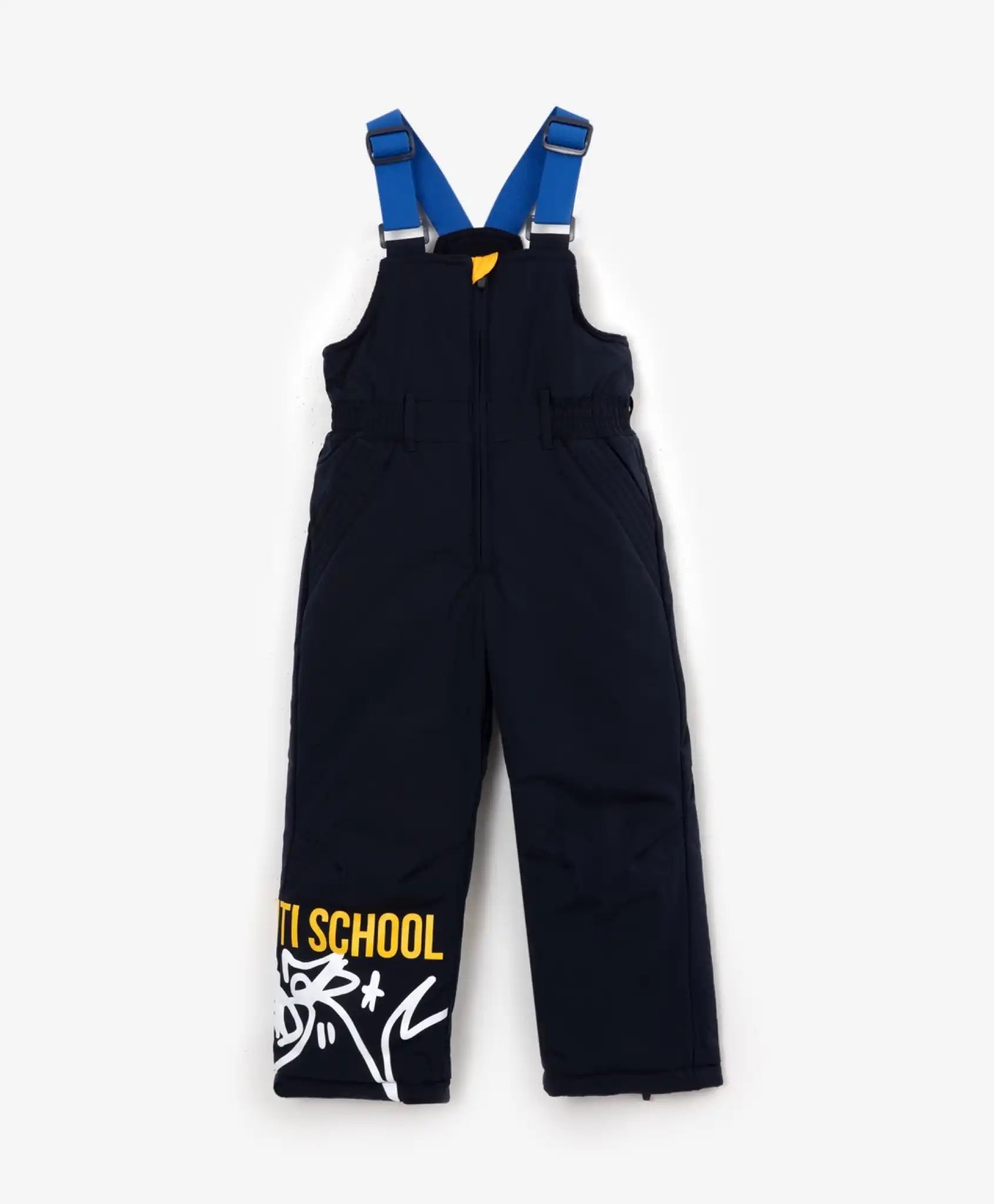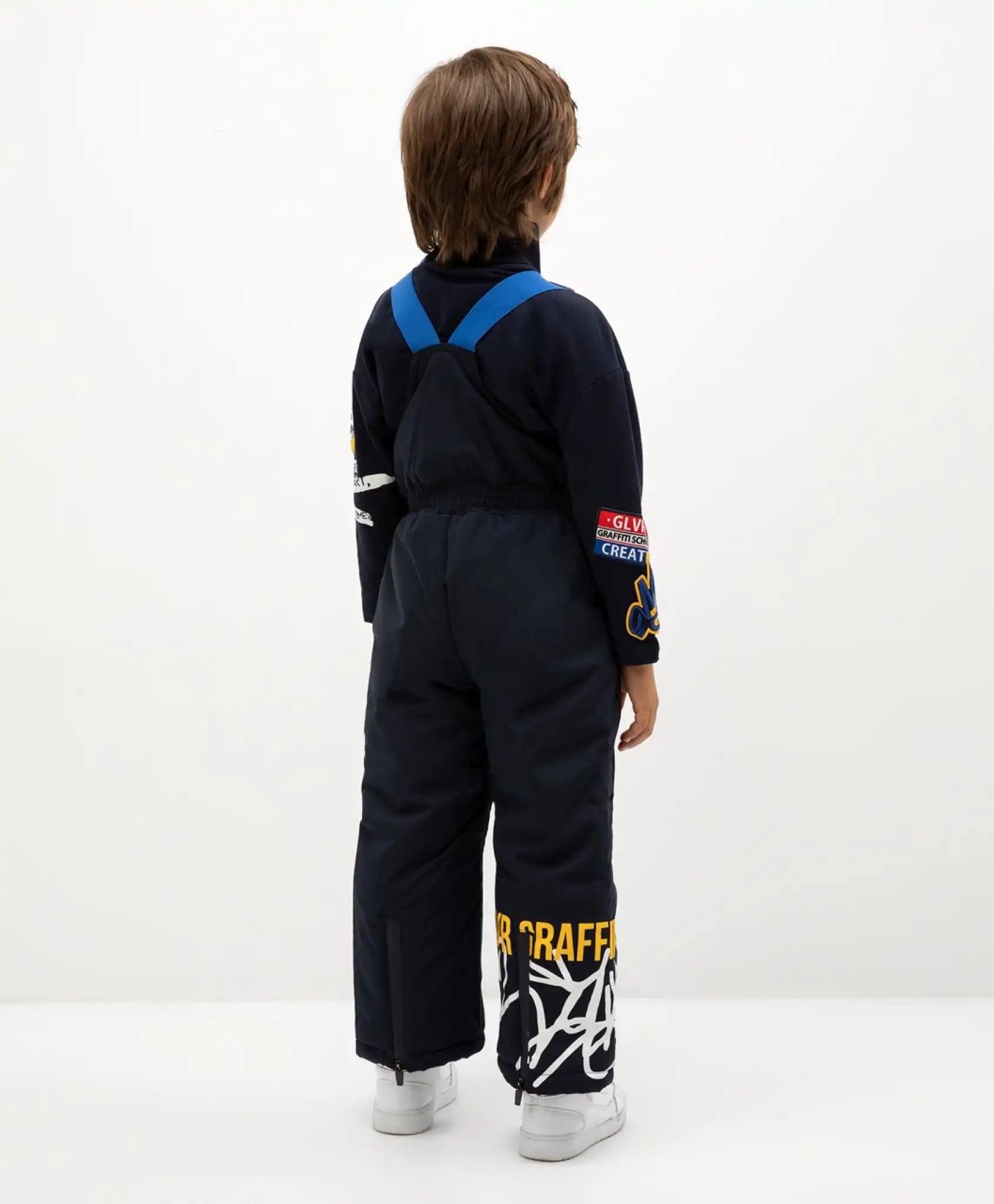 Salopeta albastră pentru copii, cu căptușeală superioară, este realizată din material mat impermeabil, fiind solidă, practică și ideală pentru plimbările lungi și active din sezonul rece. Designul modelului, evidențiat printr-un imprimeu tipografic vibrant, îl diferențiază de modelele clasice și permite crearea unor look-uri unice pentru băieți. Bretelele elastice reglabile adaugă un aer sportiv. Buzunarele conturate completează designul salopetei. Fermoarele profilate din partea inferioară permit purtarea cu încălțăminte de diferite dimensiuni și înălțimi. Modelul este decorat cu un steag personalizat și elemente din plastic.