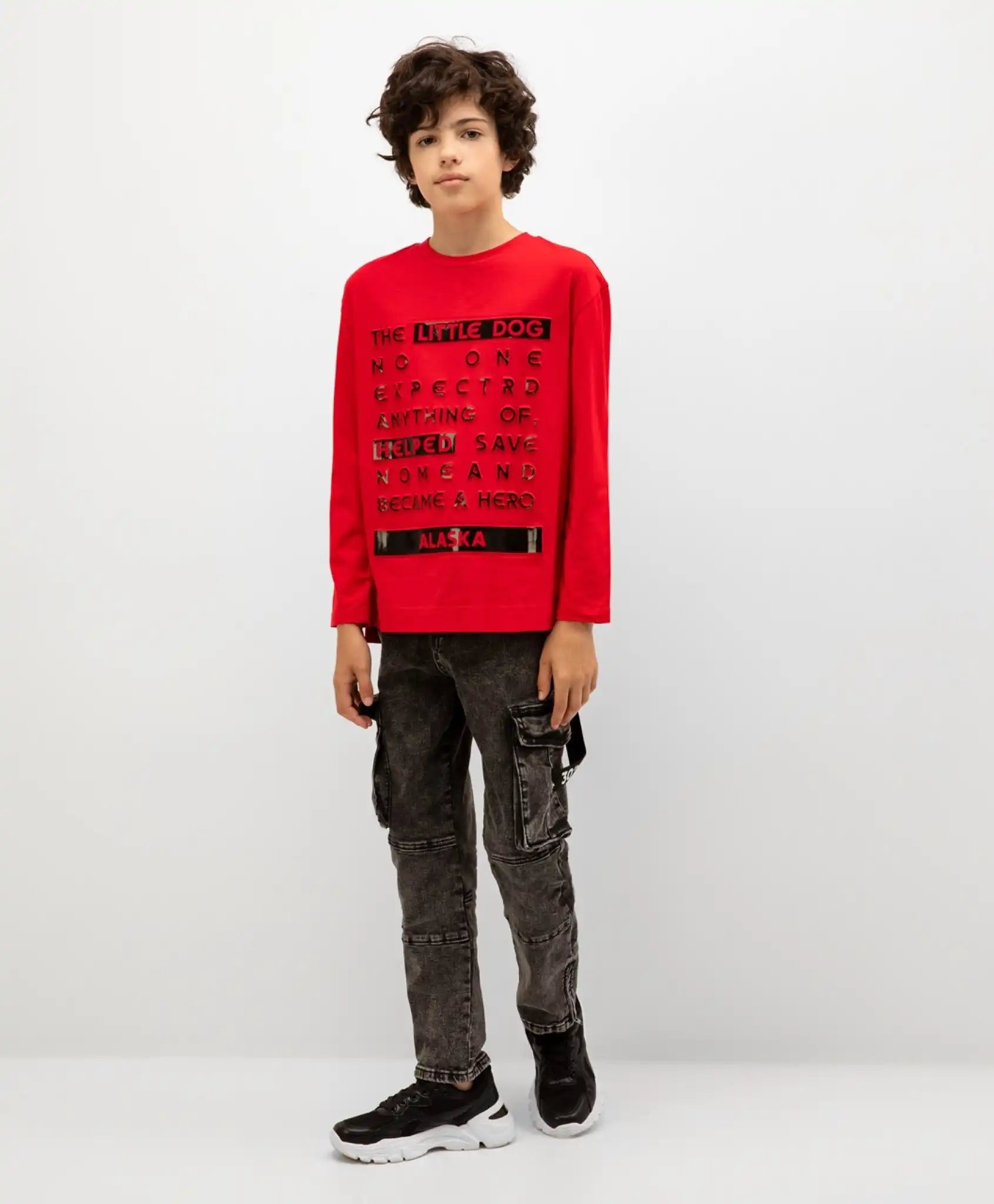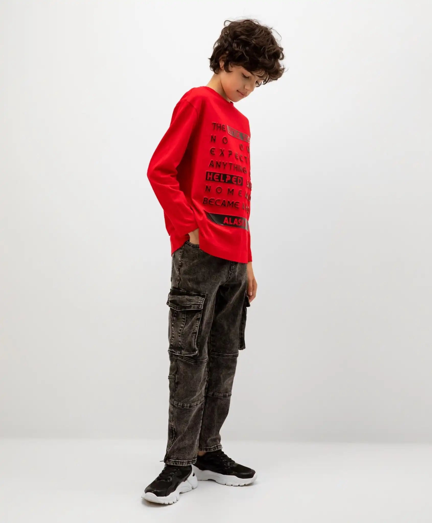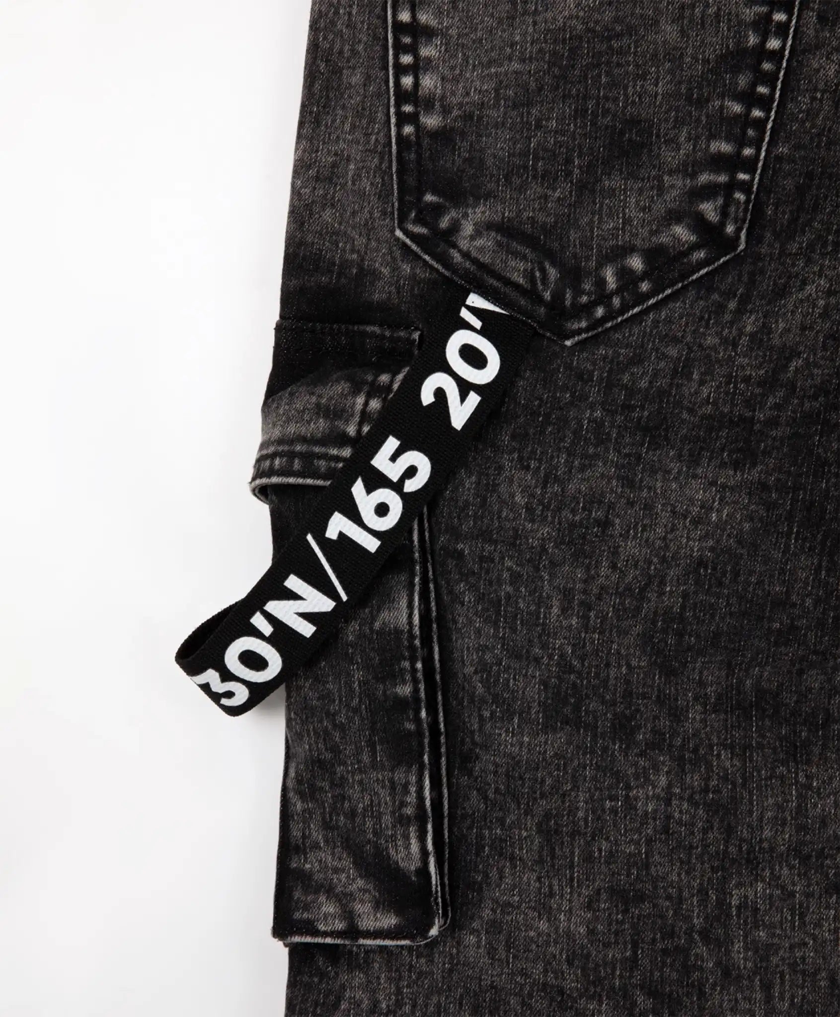 Blugii gri cu efect marmor sunt stilizați, atrăgători și convingători. Designul modelului, bazat pe buzunare mari, împărțirea orizontală a secțiunilor și elemente decorative interesante, contribuie la crearea unei imagini adolescentine îndrăznețe. Blugii sunt dotați cu fermoare metalice funcționale pe cusăturile laterale, o bandă tricotată cu imprimeu și un petic din cauciuc cu litere în relief tridimensionale.