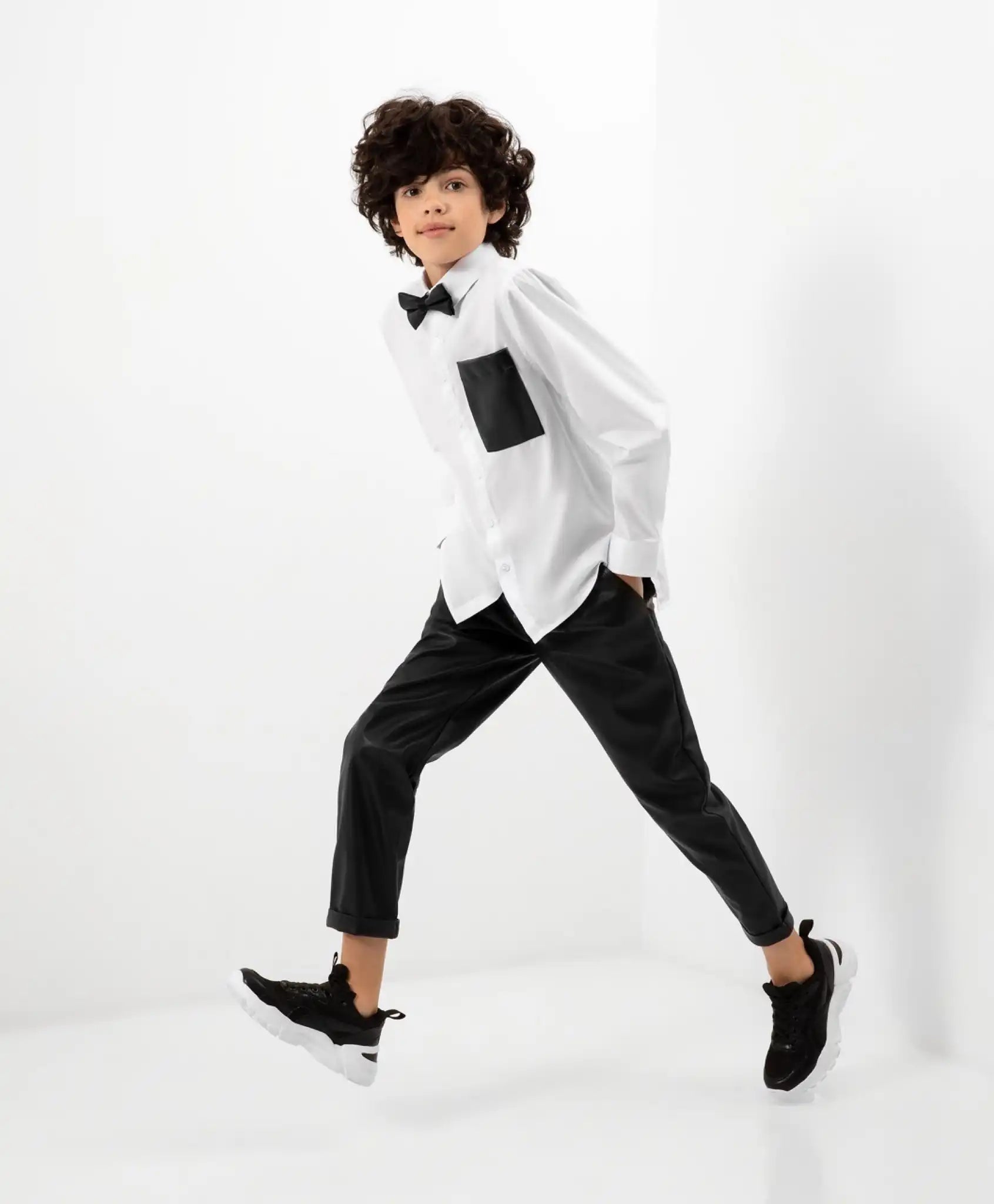 Pantalonii negri din piele ecologică subliniază stilul modern al băiatului, bazat pe confort și libertate de mișcare. Foarte practici, ușor de întreținut și purtat, pantalonii cu talie elastică și manșete pot completa atât o ținută elegantă, cât și una casual, perfectă pentru fiecare zi.