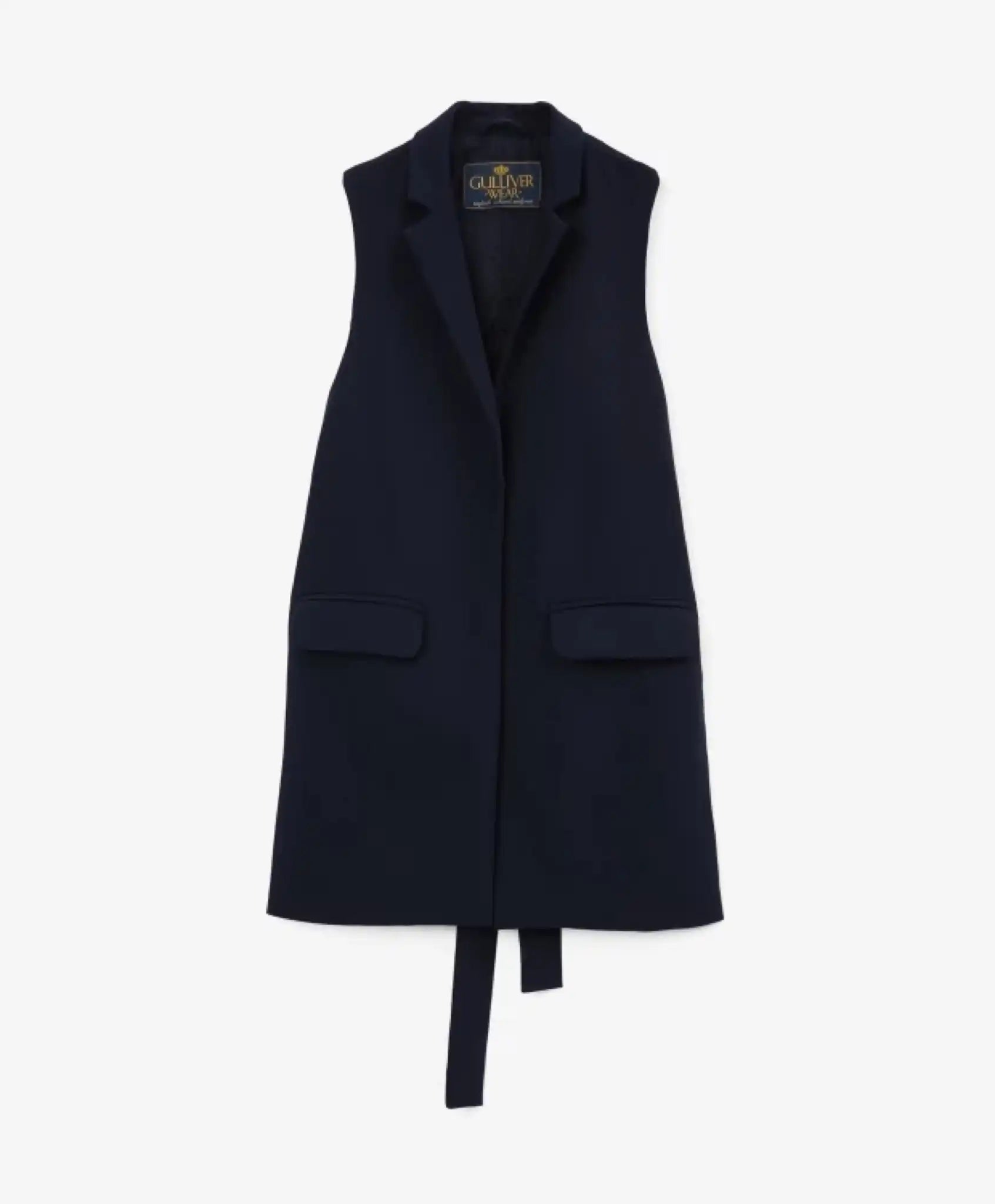 Vestă textilă albastră este o piesă îndrăzneață, extravagantă, creată în conformitate cu codul vestimentar business. Designul modelului se bazează pe contrastul puternic dintre lungimea părții frontale și a celei din spate. În combinație cu o bluză albă sau o cămașă, vestă contrastează frumos prin textură și culoare, punând accent pe proporțiile moderne din ținuta unei fete. Alegerea inedită a designului este completată de o curea care poate fi legată într-un nod lejer. Elegantă, sobră și sofisticată, această vestă va evidenția personalitatea puternică a fetei și îi va asigura un look de veritabilă fashion icon.