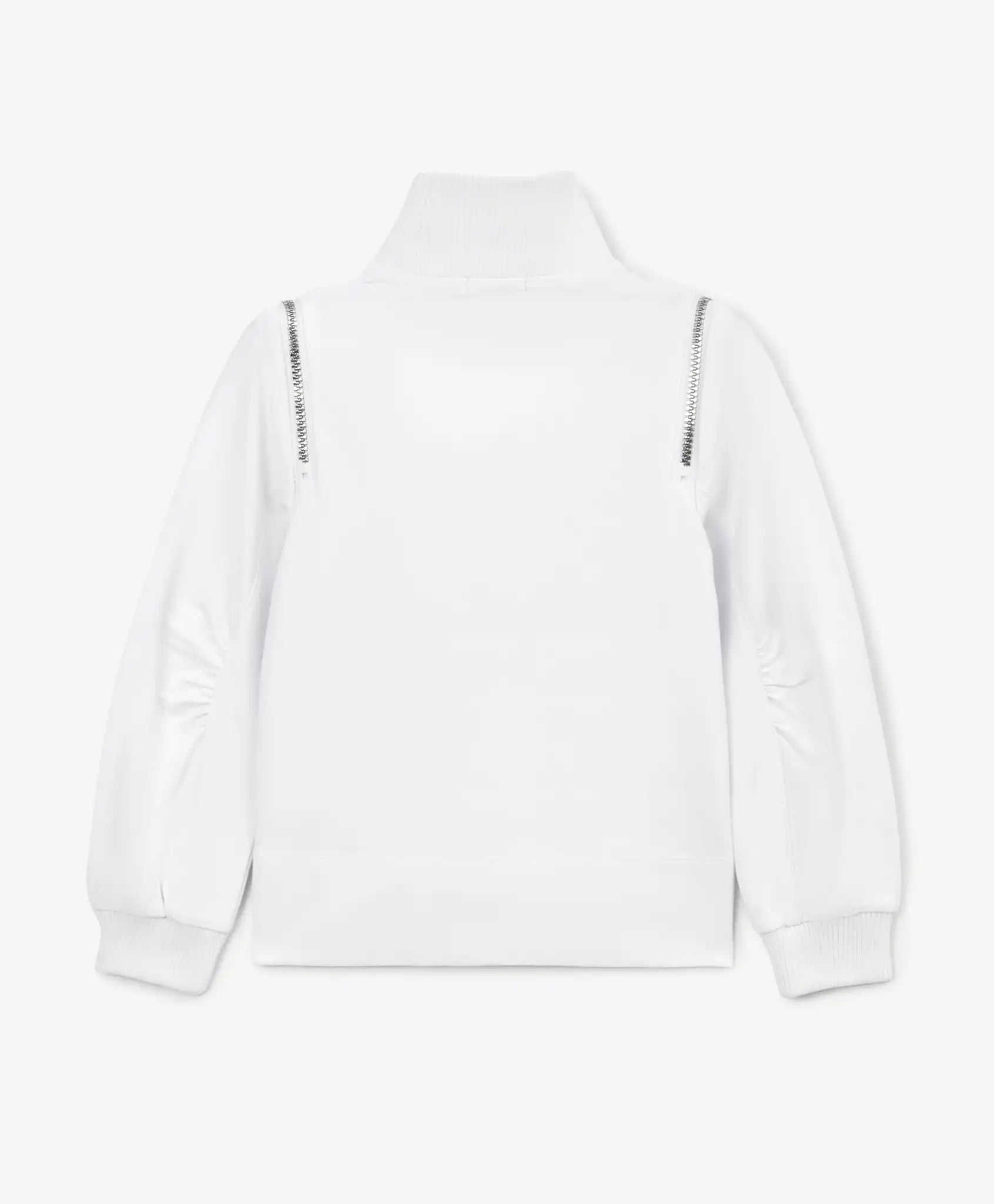Hanoracul lăptos, din material subțire, este cea mai bună alegere pentru a evidenția un stil de toamnă nonconformist și îndrăzneț. Designul său neconvențional îl face extrem de interesant și diferit de modelele clasice. Fermoarele metalice decorative, integrate în mâneci, reflectă tendința actuală de incorporare a accesoriilor metalice în îmbrăcăminte. Pe interior, fermoarele sunt acoperite cu plăcuțe tricotate pentru a proteja pielea copilului. Ușoarele deschideri din mâneci creează un efect volumetric estetic. Designul modelului include un imprimeu contrastant cu litere stilizate.