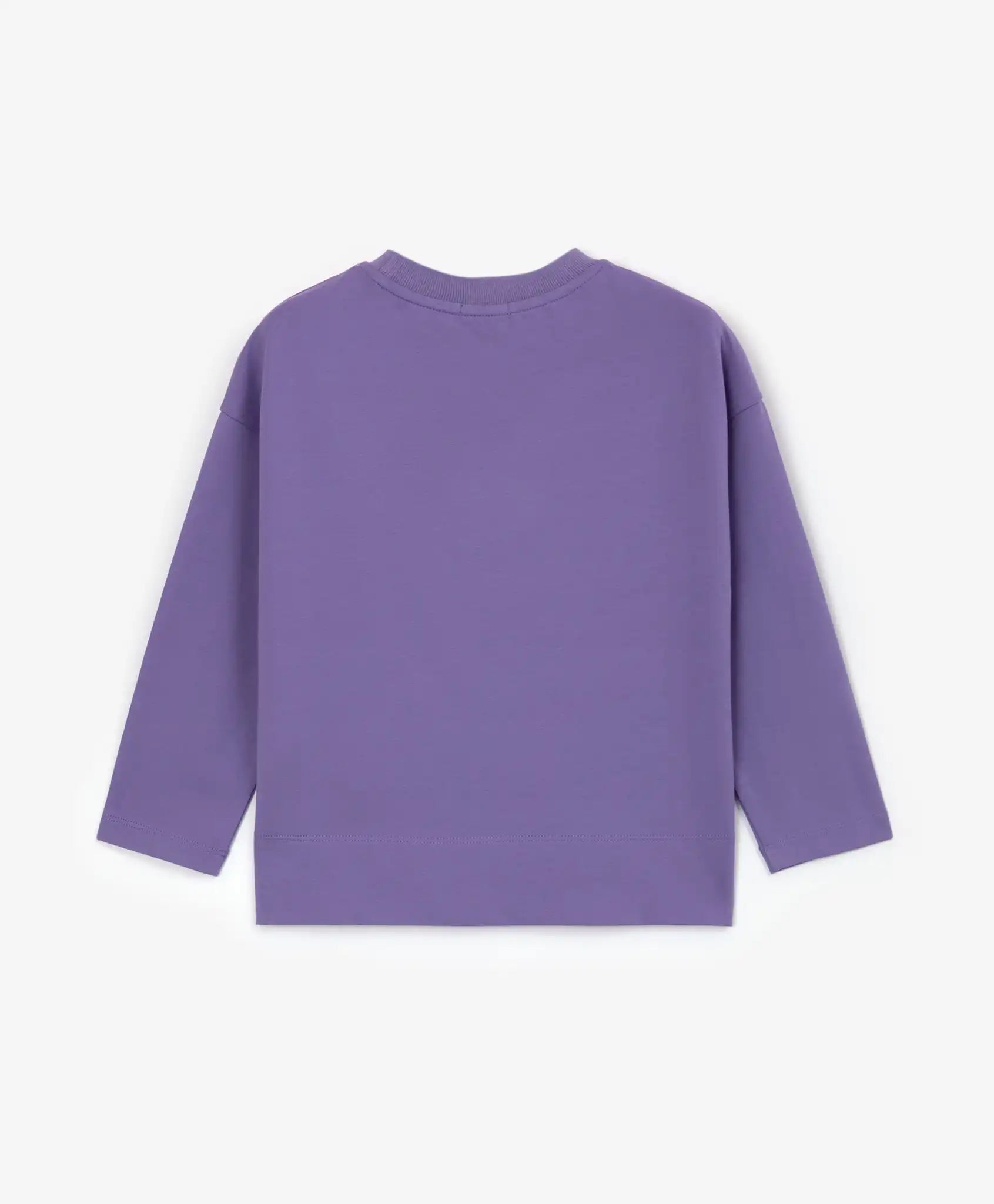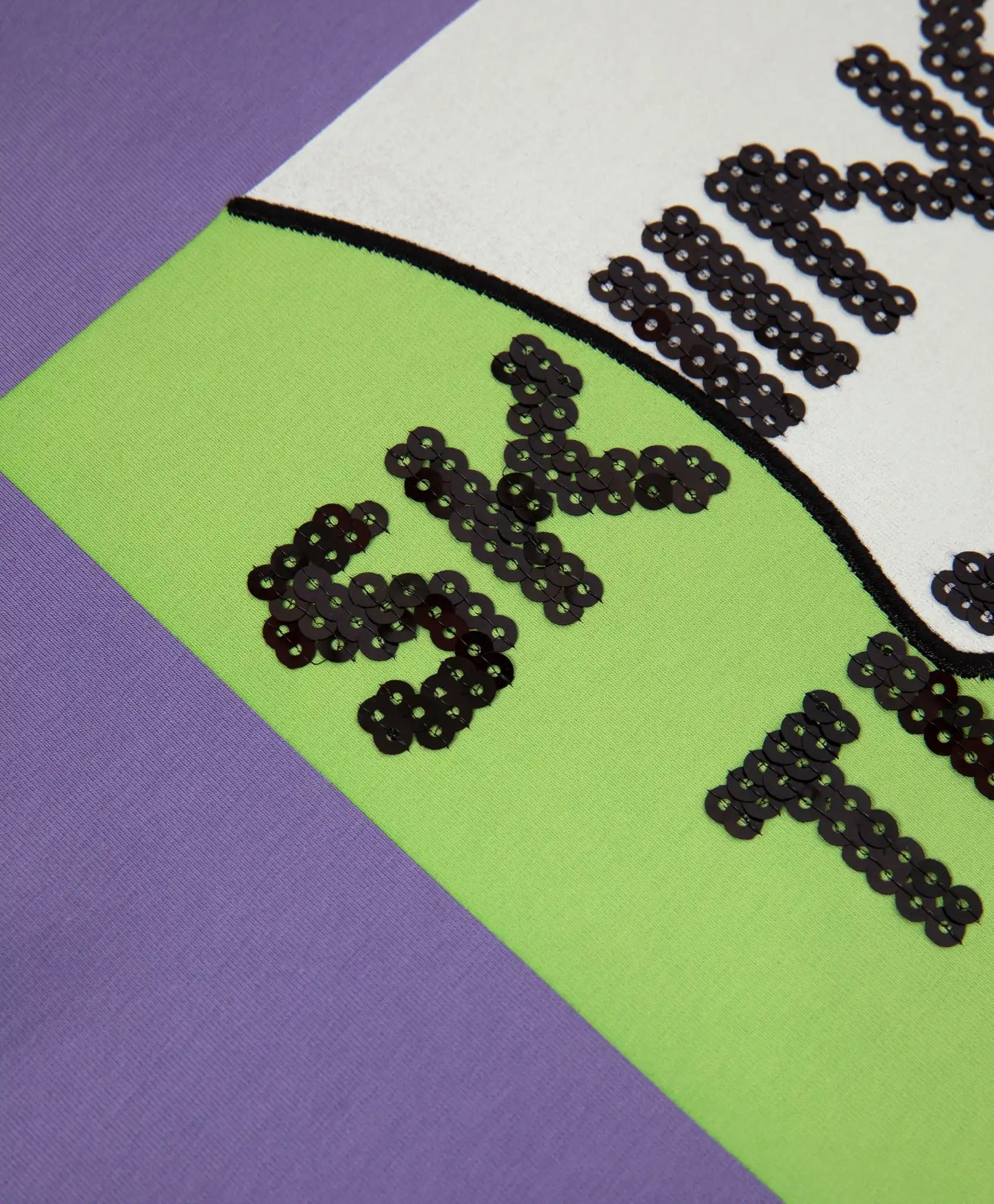 Tricoul cu mânecă lungă într-o nuanță modernă de liliac este un punct de atracție în stilul de toamnă. Croiala oversize, umerii ușor lăsați și linia spatelui coborâtă creează un look contemporan. Decorul expresiv, realizat printr-o combinație de trei tehnici – imprimeu, broderie și paiete – adaugă prospețime și originalitate modelului.