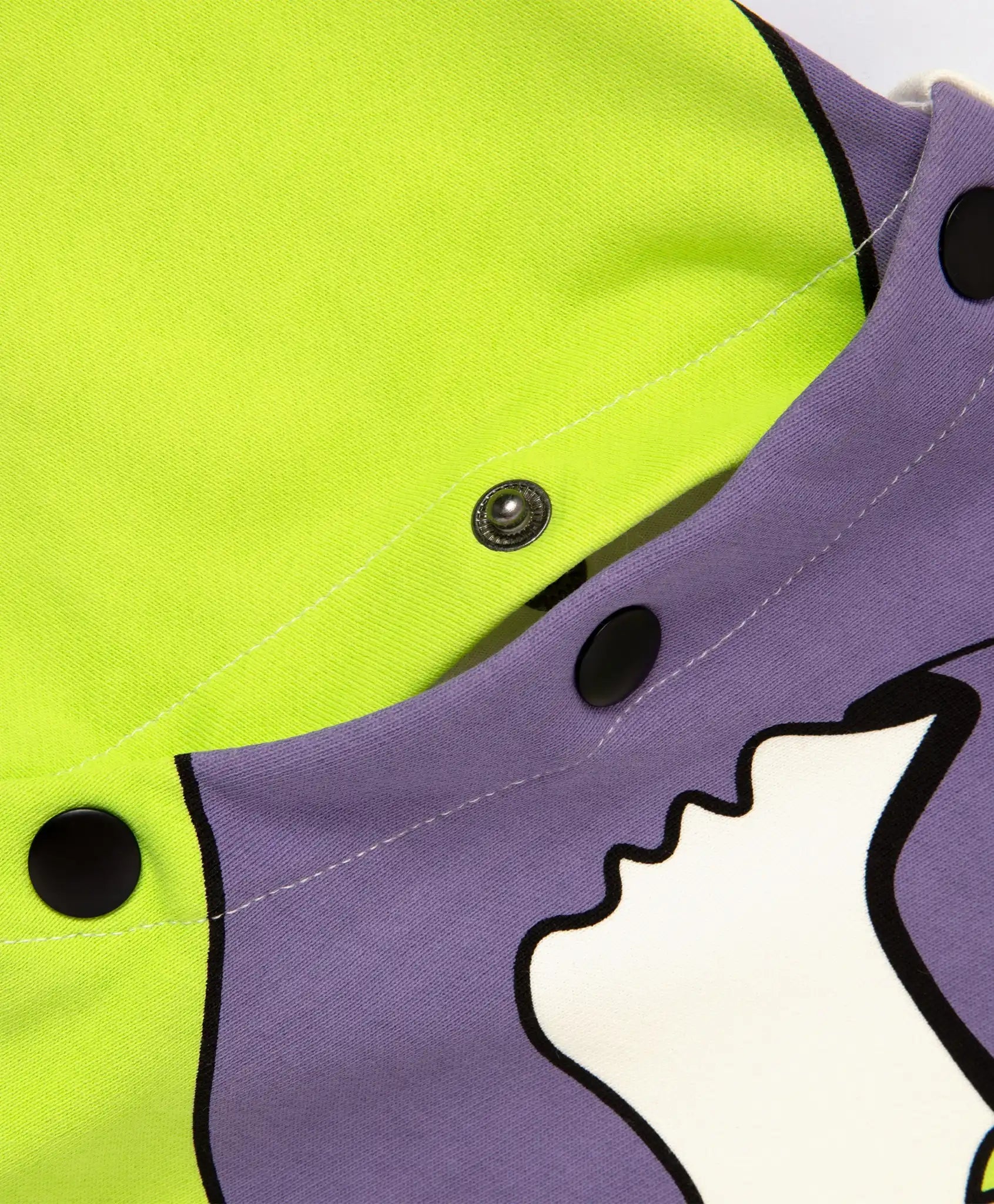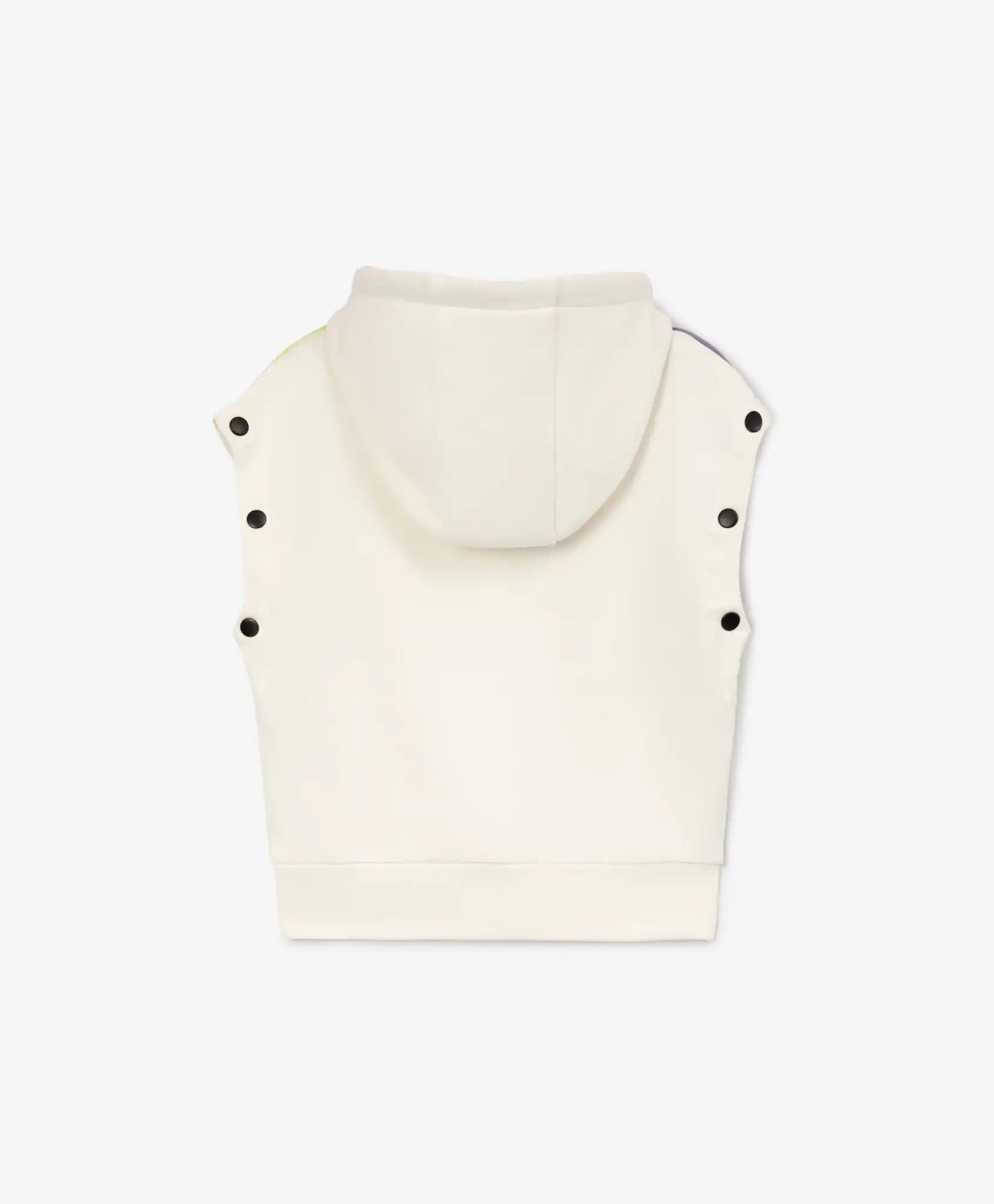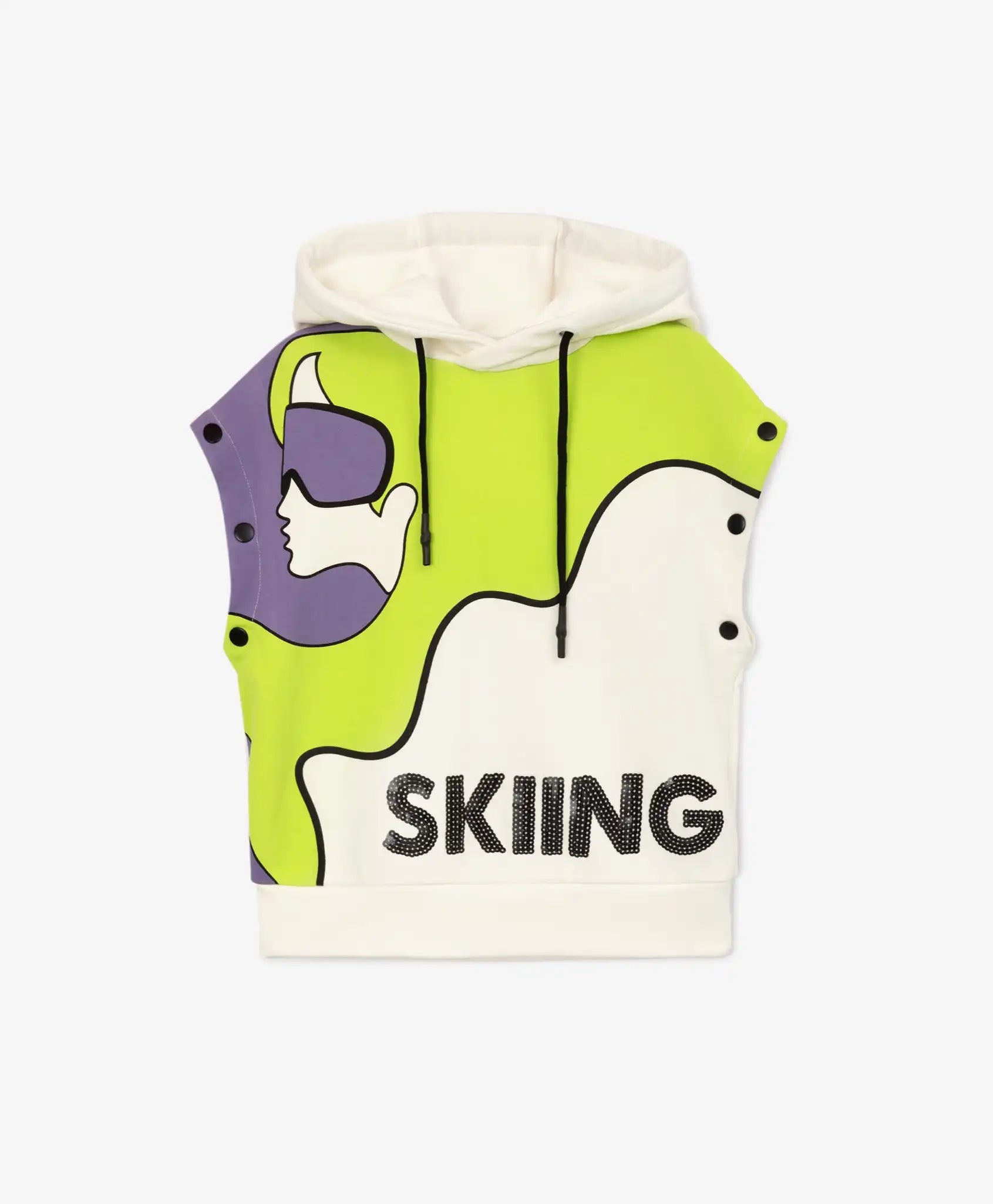 Hanoracul din French Terry este un transformer spectaculos! Mânecile detașabile, prinse cu nasturi, permit crearea unor look-uri variate, fie ca hanorac, fie ca vestă. Croiala lejeră și voluminoasă de tip bomber asigură proporții moderne, evidențiind combinațiile armonioase dintr-un outfit stratificat. Designul este îmbogățit cu un imprimeu expresiv dispus asimetric și un decor tipografic din paiete mate, adăugând un aer îndrăzneț și neobișnuit, făcând hanoracul extrem de atractiv pentru fete.