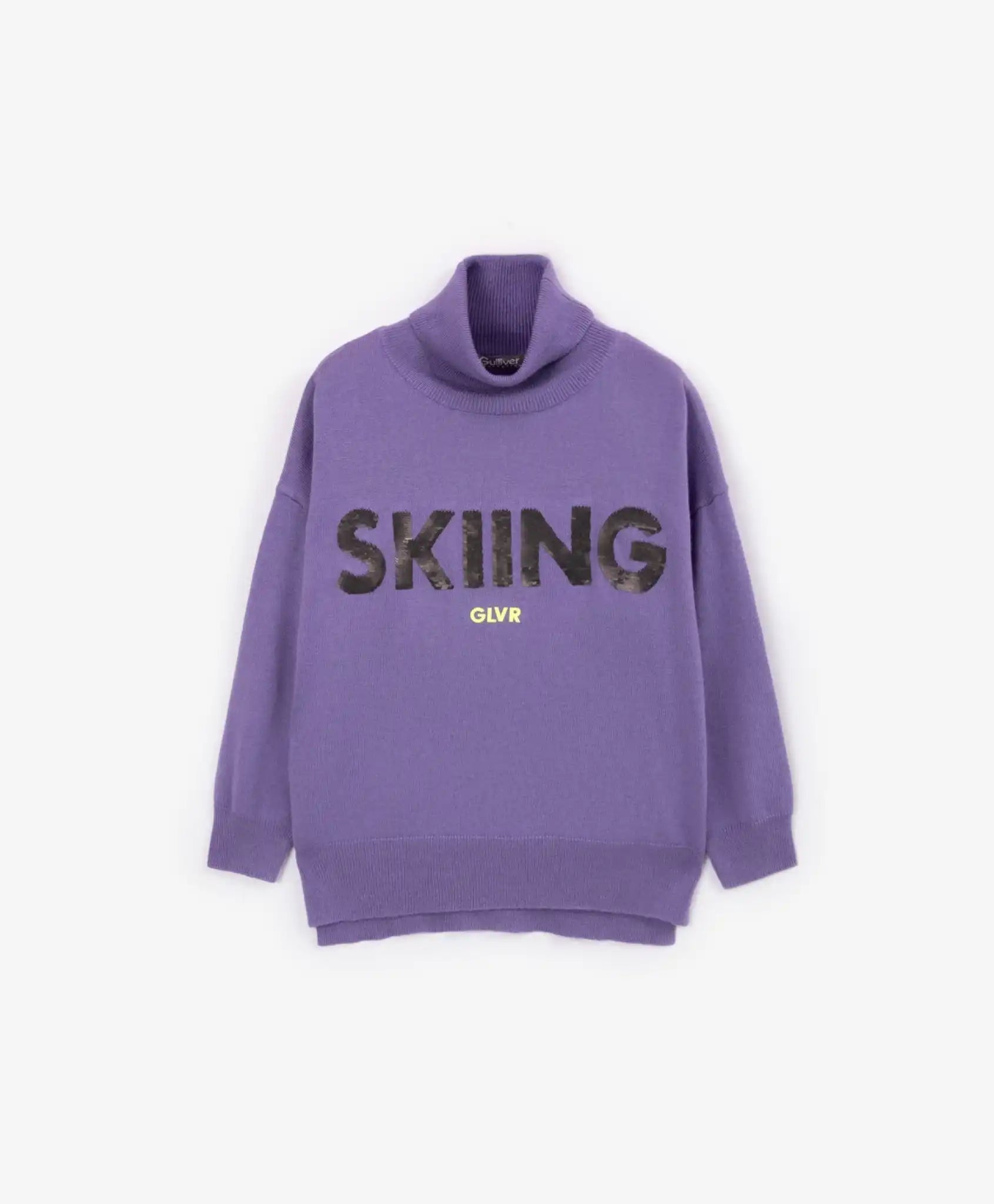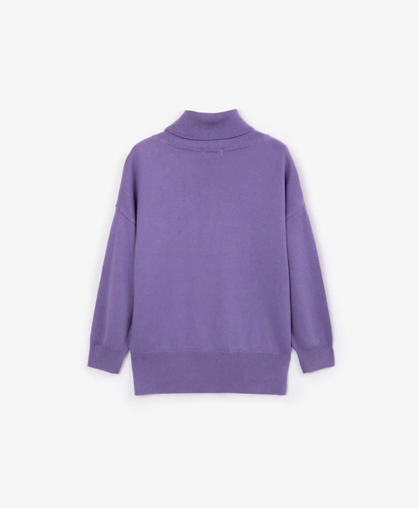 Pulover tricotat, într-o nuanță modernă de violet, este o piesă vestimentară călduroasă, moale și interesantă. Forma sa contemporană, lungimea și volumul generos îl fac foarte confortabil. Elementele decorative, compuse din paiete alb-negru (efect antistres) și un imprimeu scris strălucitor, conferă modelului originalitate și expresivitate. Compoziția triplă a firului, plăcută la atingere, elimină iritațiile pielii, fiind esențială pentru confortul în utilizare.