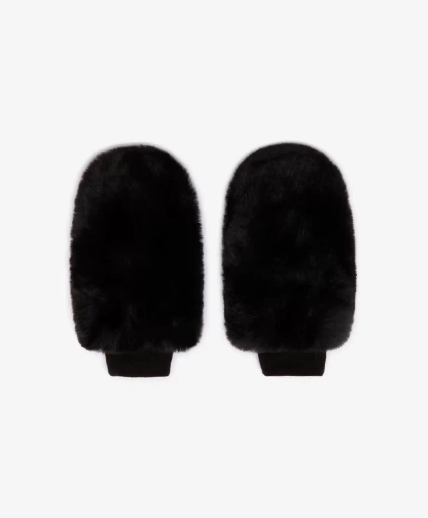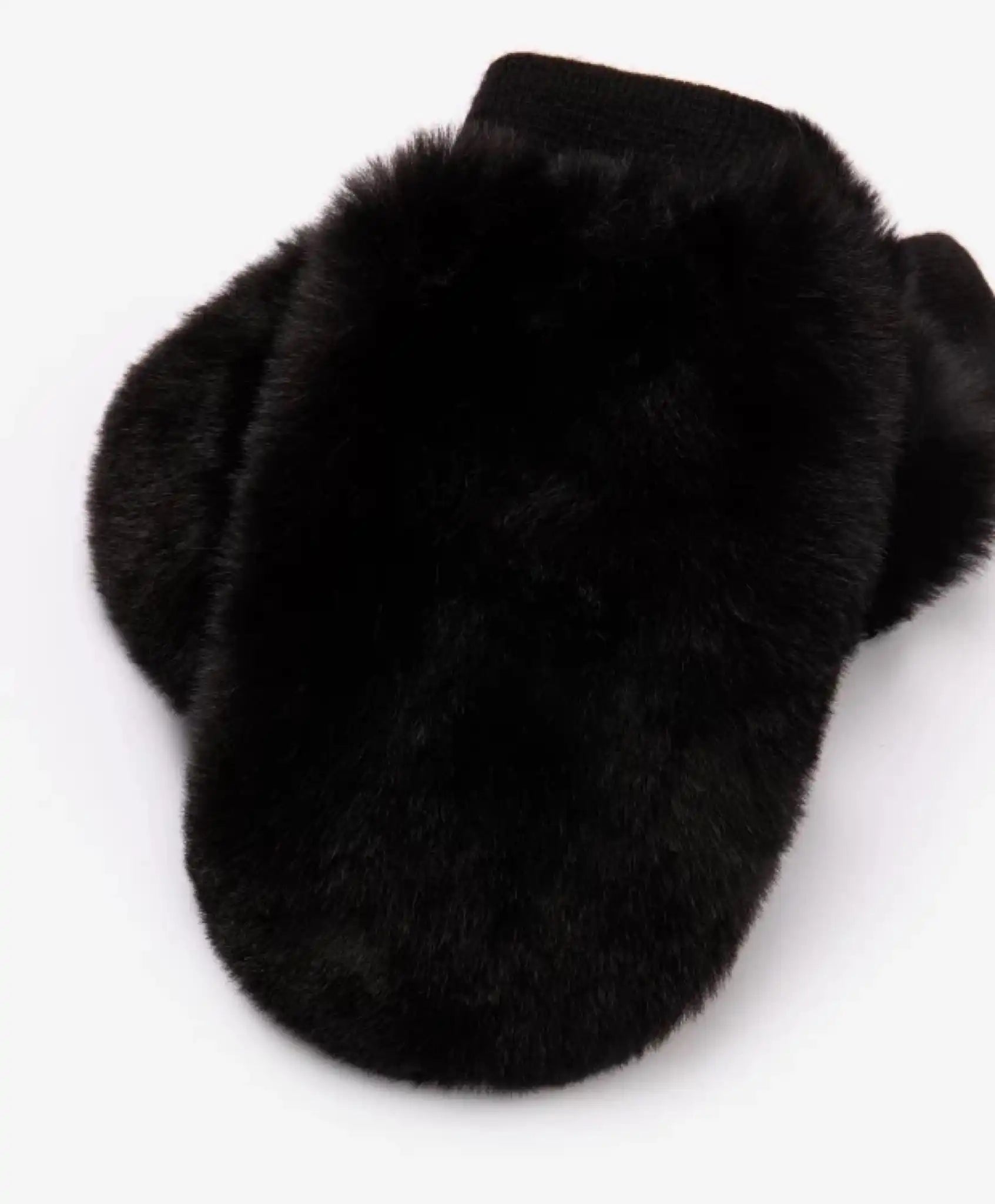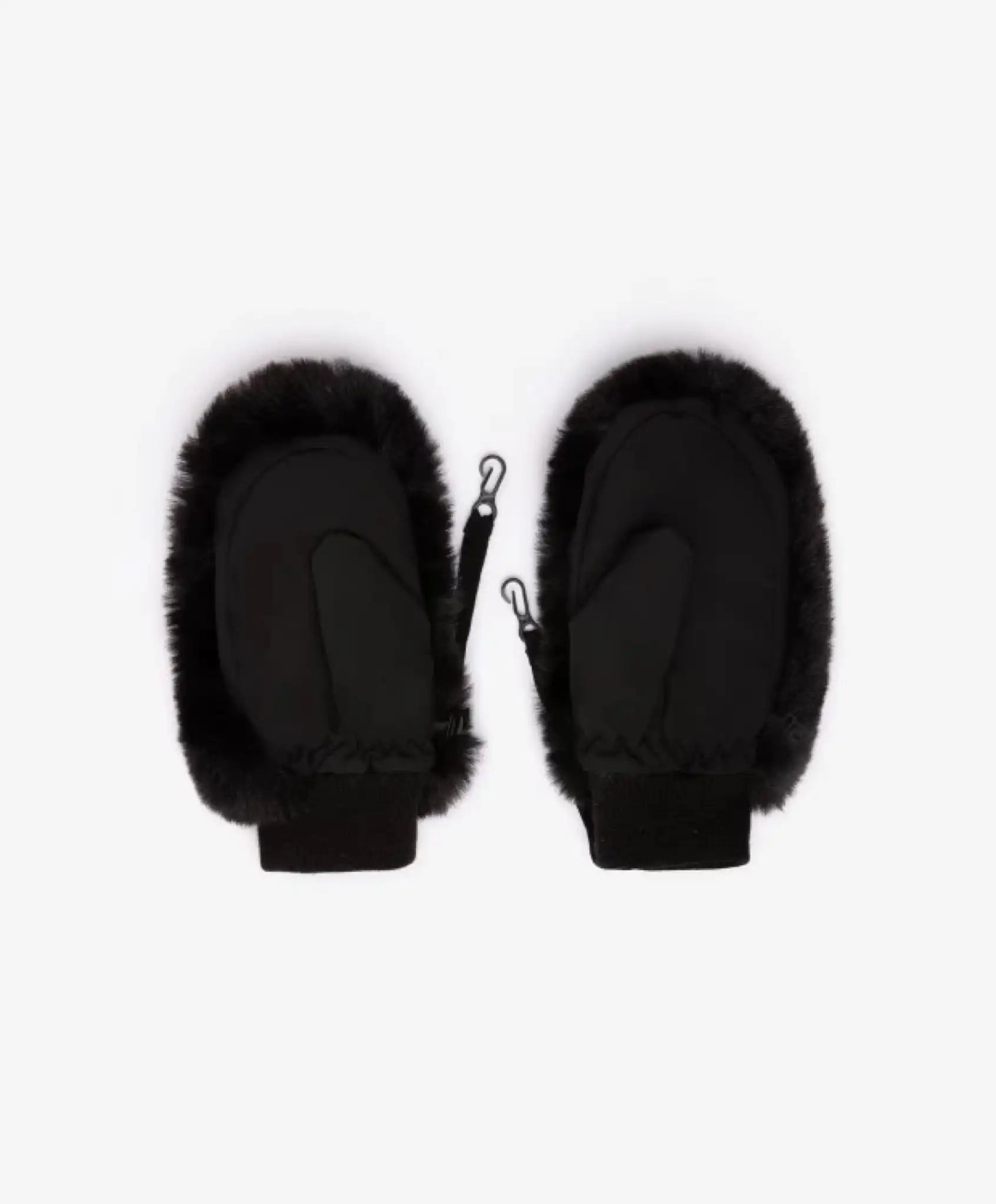 Mănușile negre căptușite din material impermeabil arată modern și neobișnuit datorită unui detaliu de design inedit: combinația dintre materialul rezistent la apă și blana artificială, asemănătoare mutonului dens și mătăsos. Contrastul texturilor dintre partea superioară pufoasă și palma din material impermeabil oferă un aspect elegant și confortabil. Manșetele tricotate asigură o fixare fermă pe încheietură. Pentru a preveni pierderea mănușilor, acestea pot fi atașate la jachetă sau palton cu ajutorul carabinierelor și curelei elastice.