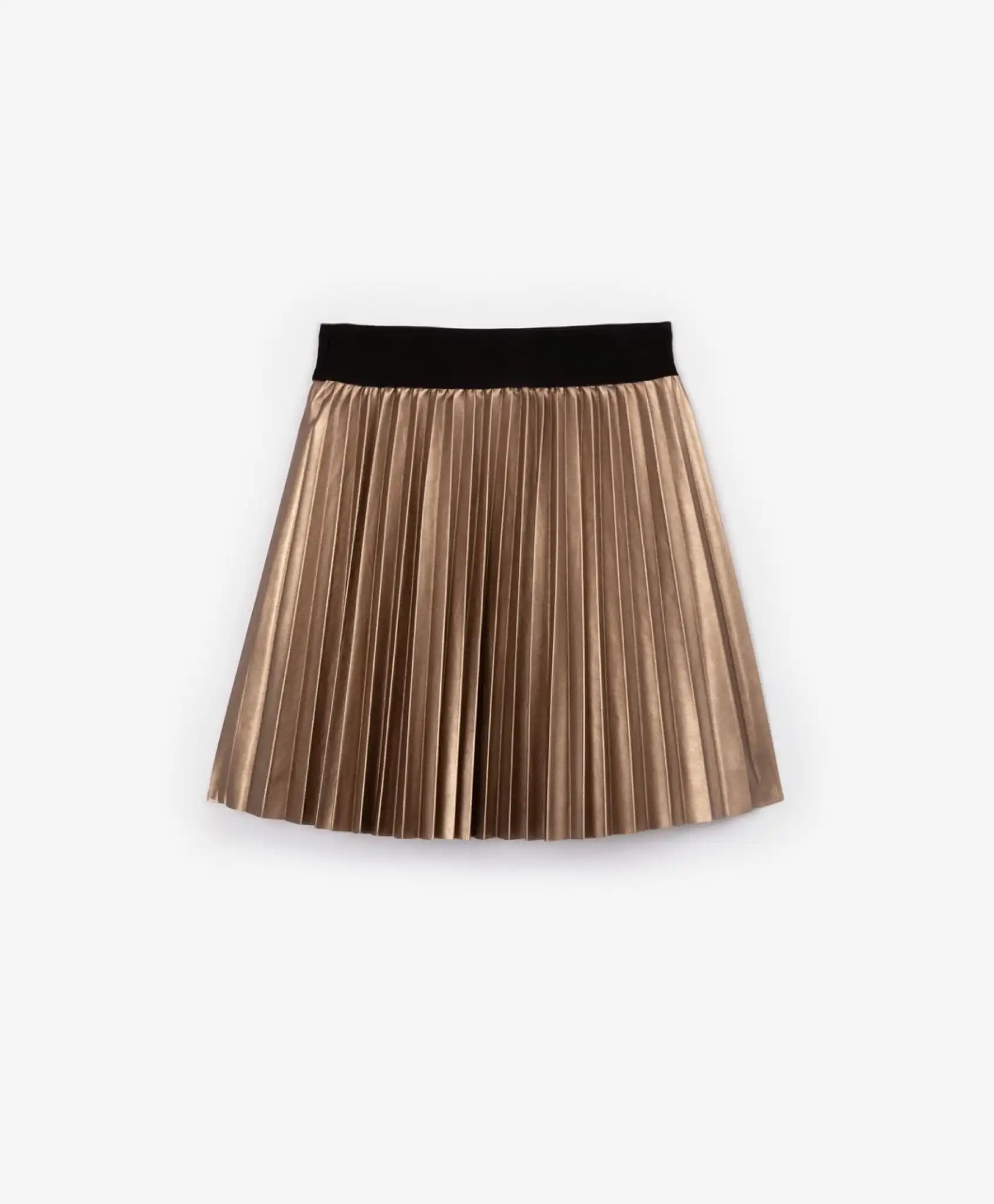 Fusta plisată arată întotdeauna stilat, elegant și rafinat! Confecționată din piele ecologică aurie moale, cu o textură lucioasă expresivă, această fustă va aduce prospețime și modernitate în garderoba unei fete. Betelia elastică lată asigură confort și lejeritate la purtare. Căptușeala mătăsoasă permite o alunecare plăcută a materialului în timpul mișcării.