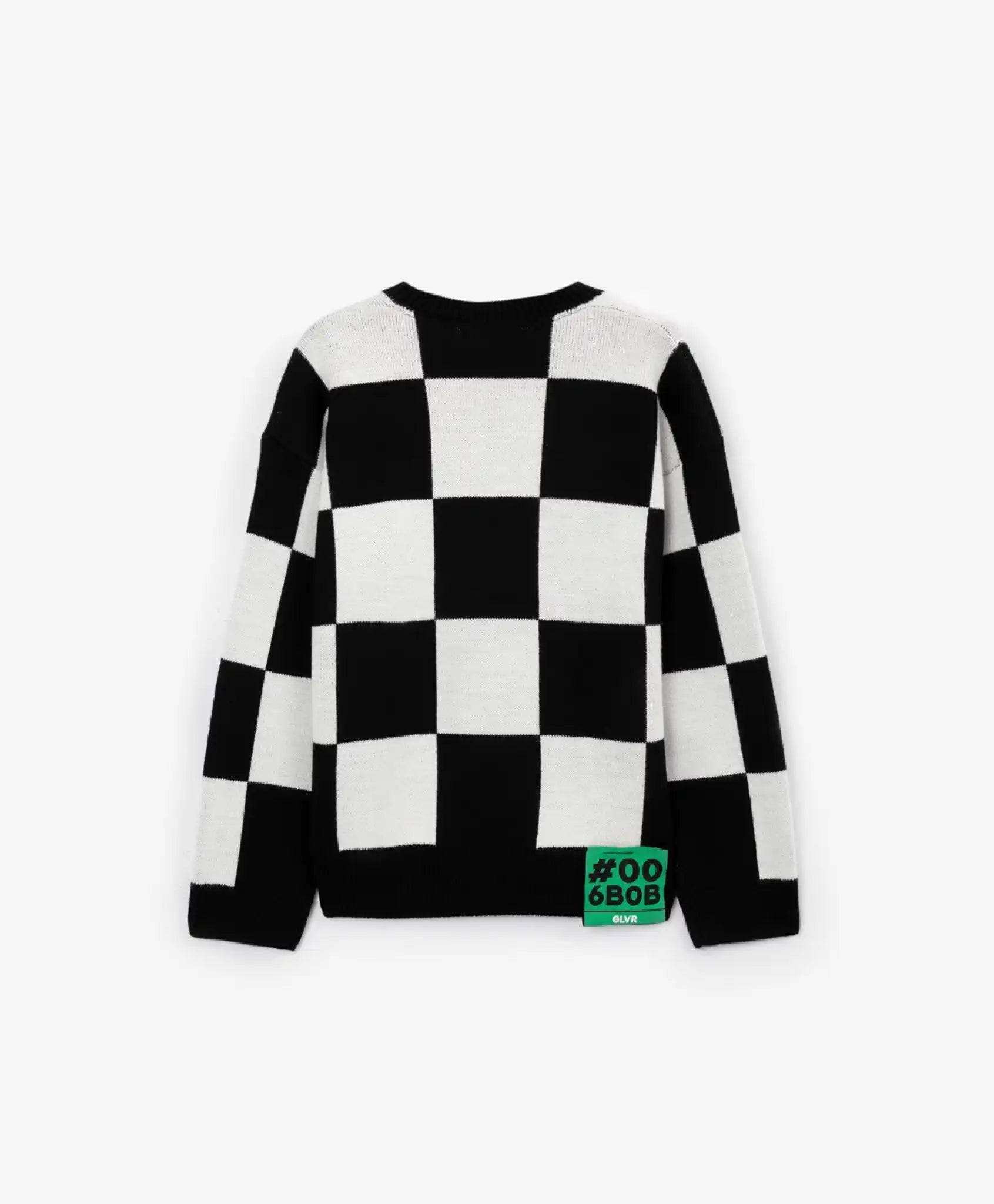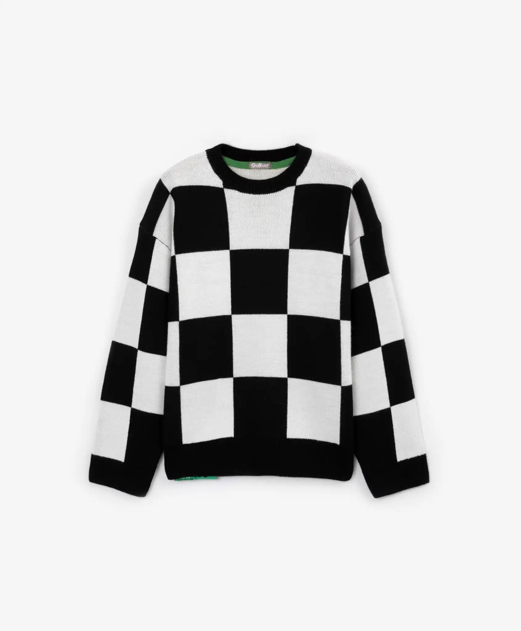 Pulover tricotat voluminos, cu croială lejeră și umăr lăsat – nu doar o variantă confortabilă și călduroasă pentru iarnă, ci și o oportunitate de a arăta expresiv, interesant și chiar extravagant. Carourile alb-negru de dimensiuni mari atrag atenția. Designul minimalist nu exclude detaliile interesante care conferă modelului trăsături individuale. În aspectul puloverului a fost utilizată o etichetă jacquard lată cu grafică tipografică informativă. O etichetă verde aprins, situată pe marginea inferioară a spatelui, servește drept accent de culoare care subliniază unicitatea modelului. Puloverul este confecționat din fire moi cu lână parțială, garantând căldură, confort și o senzație plăcută la atingere.