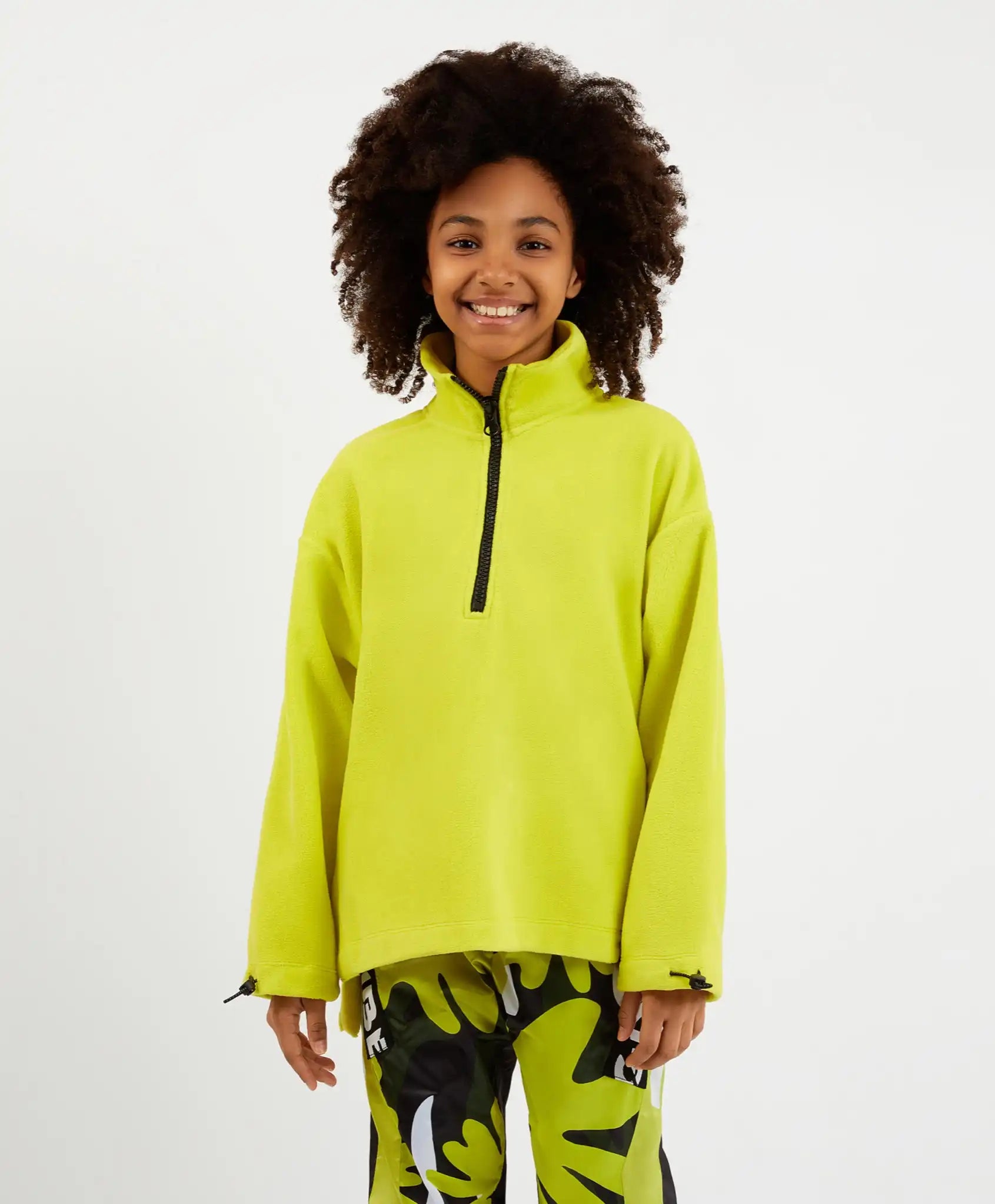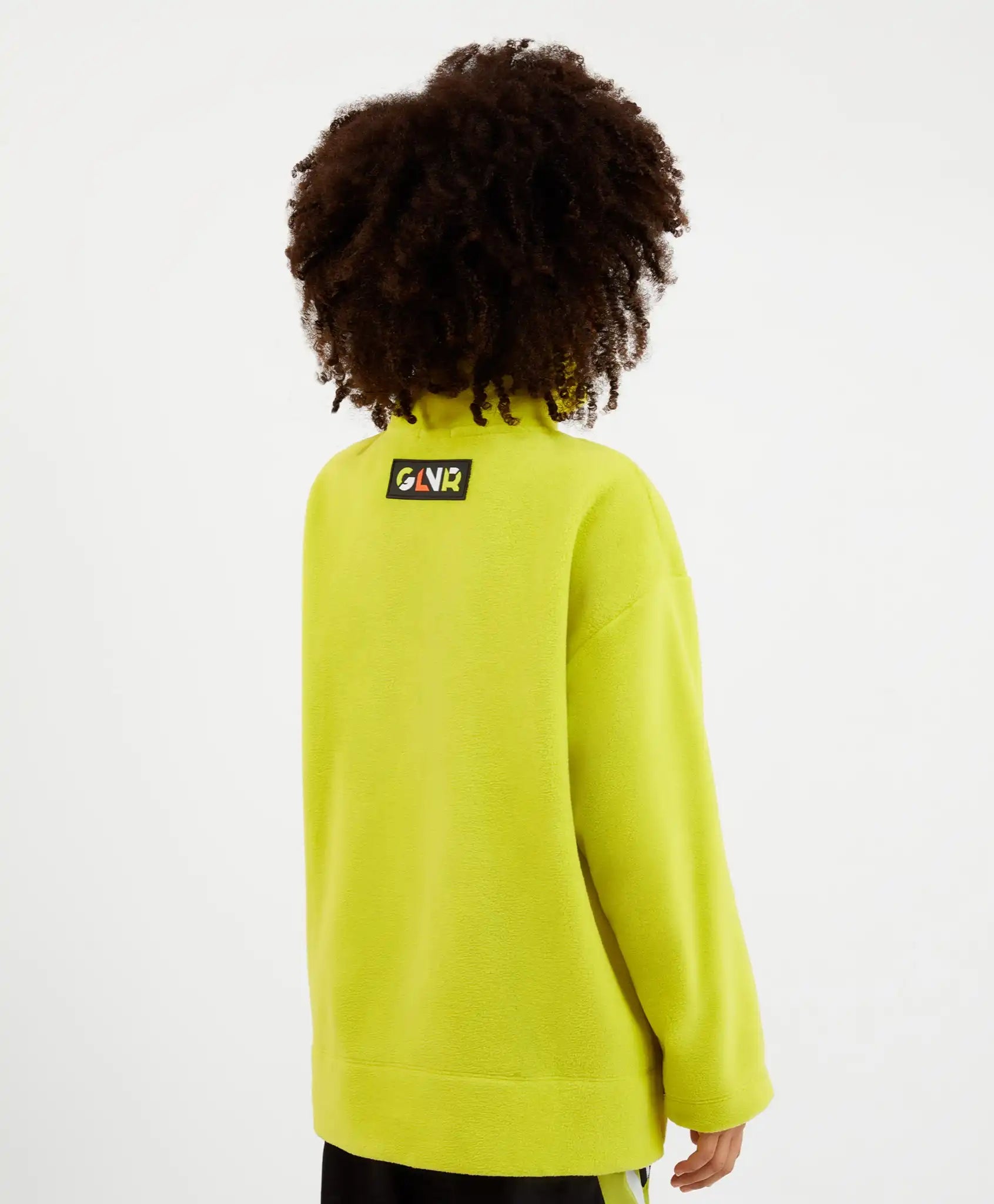 Hanorac fleece cu guler înalt și fermoar tip tractor – soluția ideală pentru activități dinamice în aer liber. Foarte moale și plăcut la atingere, acest hanorac fleece este expresia confortului și căldurii, esențiale în sezonul rece. Nuanța vibrantă de lime îl transformă într-un element de accent. Decupajele înalte de pe cusăturile laterale permit integrarea modelului într-un look sportiv, stratificat. Designul include un chevron din cauciuc cu elemente tipografice voluminoase, o bandă cu opritori pe mâneci și un steag cu QR code ce direcționează către site-ul Gulliver.