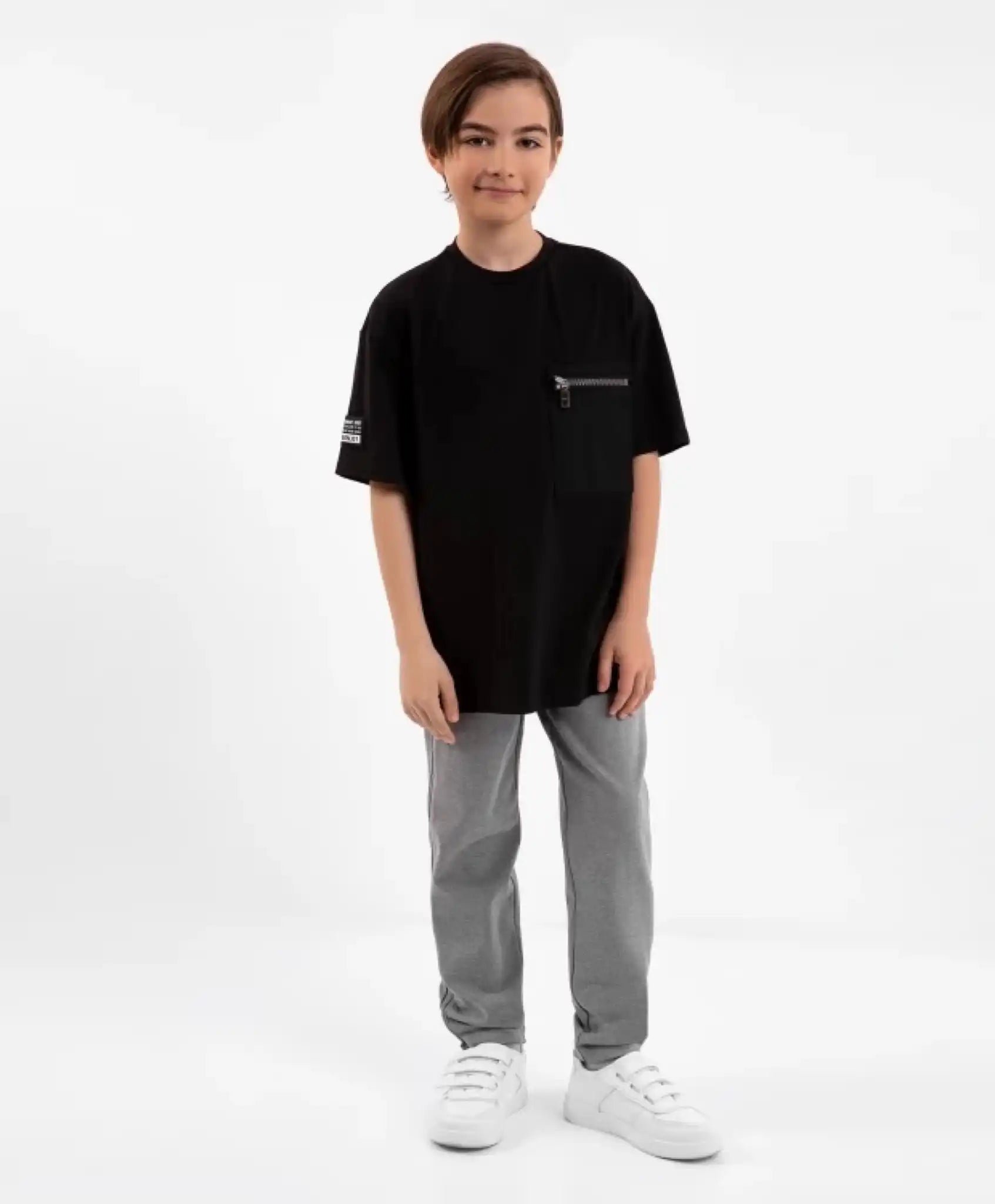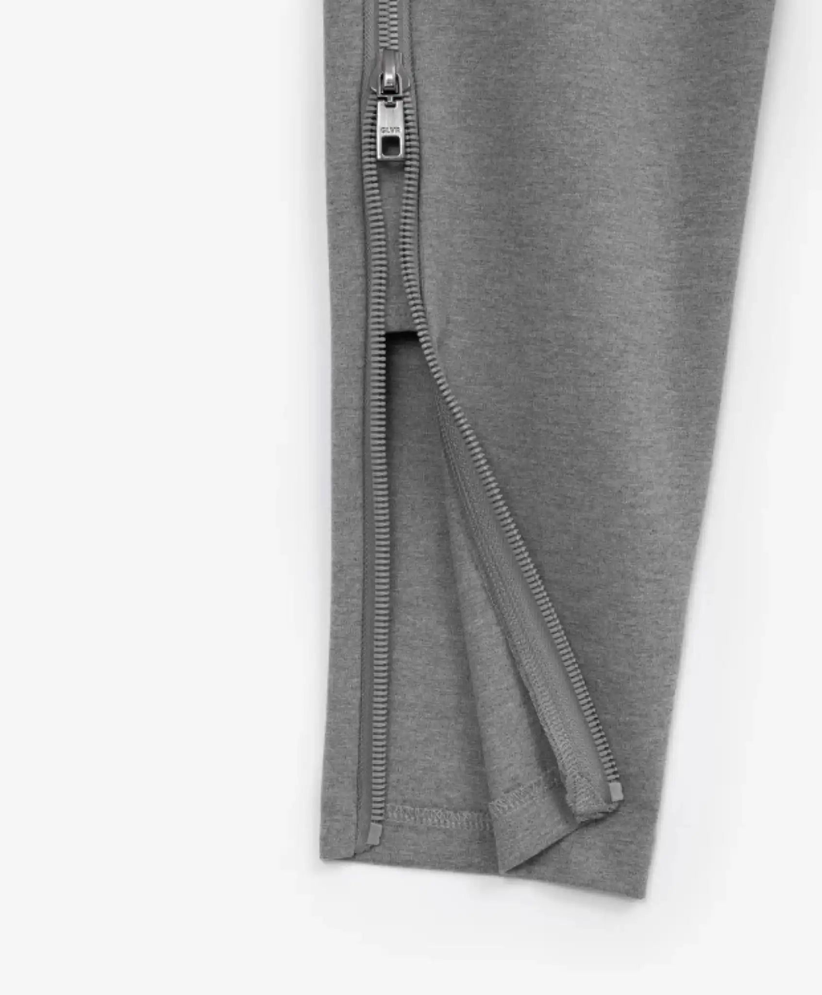Pantalonii gri din tricot, confecționați din jerseu, sunt o alegere practică și confortabilă! Designul modelului se axează pe cusăturile laterale, unde sunt integrate fermoare mari din plastic, care conferă pantalonilor un aspect modern și neobișnuit. Fermoarele, asortate cu culoarea materialului de bază, nu creează un contrast puternic, ceea ce este important pentru instituțiile de învățământ cu un cod vestimentar strict, dar oferă modelului un caracter individual și o estetică sportivă. Fermoarele pot fi deschise de jos în sus, iar cusătura laterală este prevăzută cu o bandă interioară, creând un efect interesant atunci când sunt descheiate. De asemenea, fermoarele pot fi deschise doar în partea inferioară, oferind iluzia unei tăieturi înalte. Designul pantalonilor include un șnur funcțional cu acoperire siliconată lucioasă și o mică plăcuță metalică personalizată.