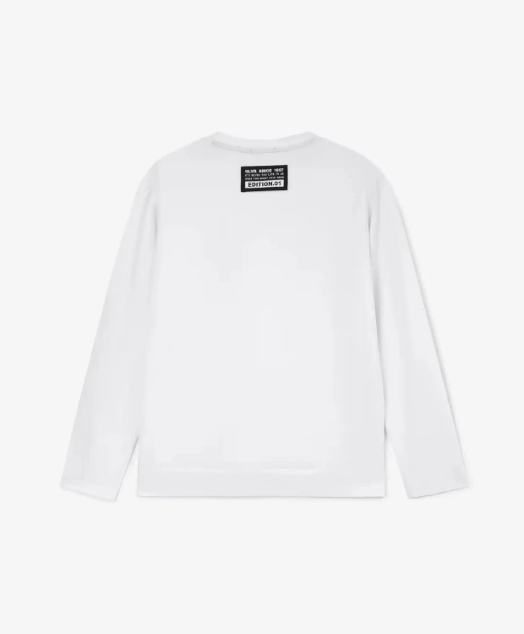 Tricoul cu mânecă lungă, croială dreaptă și spatele ușor prelungit este o completare excelentă pentru garderoba școlară. Dacă stilul sport și casual sunt binevenite în mediul școlar, acest tricou va permite băiatului să se simtă extrem de confortabil. Modelul este construit dintr-o combinație de tricot principal și material textil pe buzunar. Imprimeul suprapus peste buzunar îl integrează subtil în design. Stilul minimalist al modelului contribuie la un look serios și elegant. Modelul include o mică aplicație pe spate.