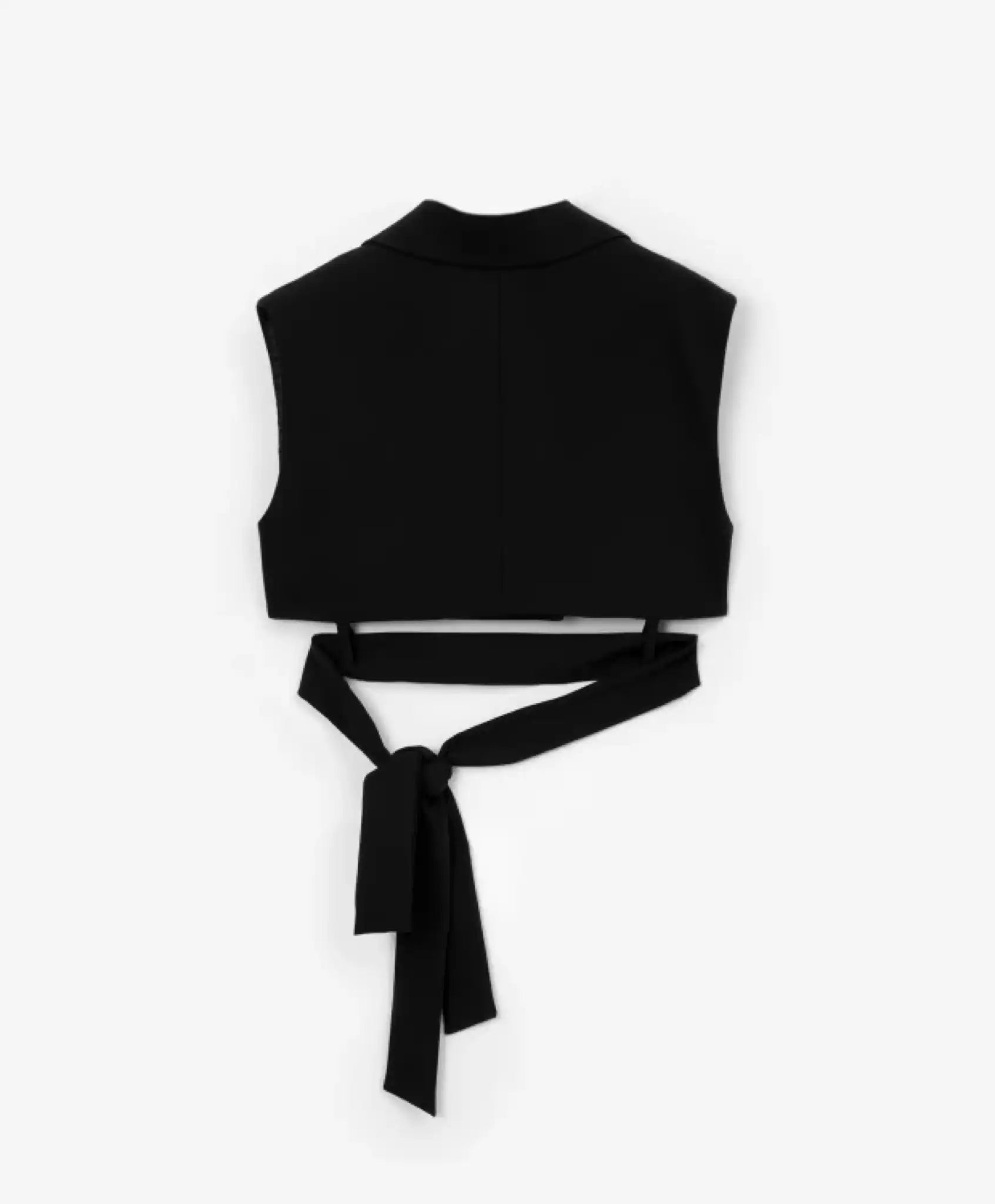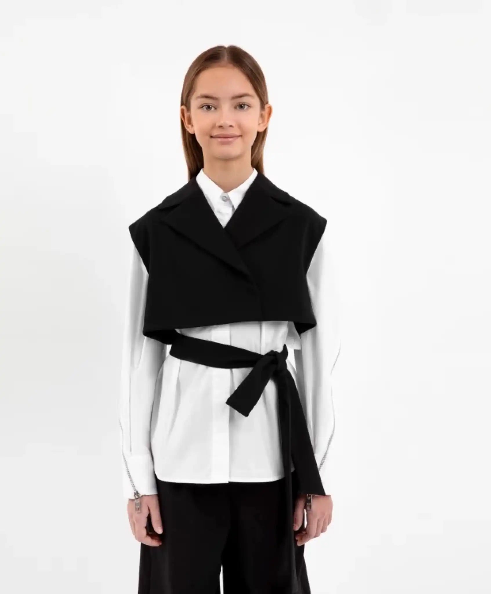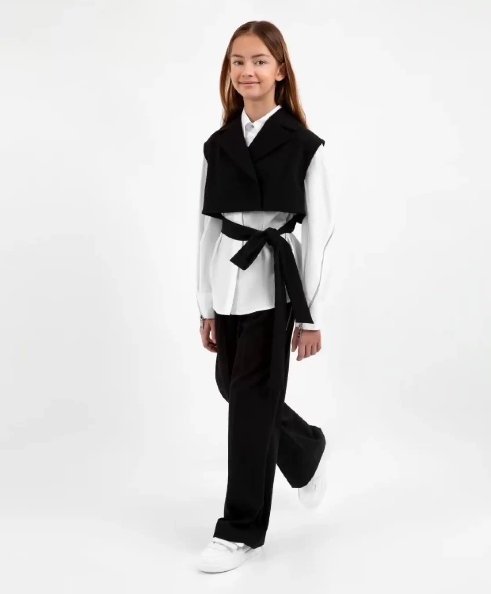 Vestă neagră din poli-viscoză – un model modern strălucitor din colecția școlară! Spre deosebire de variantele clasice, designul acestui model se bazează pe o croială scurtă modernă și o curea lungă detașabilă, pe care fata o poate lega într-un nod lejer cu capete căzătoare sau o poate înfășura de mai multe ori în jurul taliei, creând un efect vizual interesant. În combinație cu o bluză albă lungă, pantaloni slim decupați sau pantaloni palazzo largi, vestă va forma un set stilat și memorabil, care o va face pe elevă să iasă în evidență.