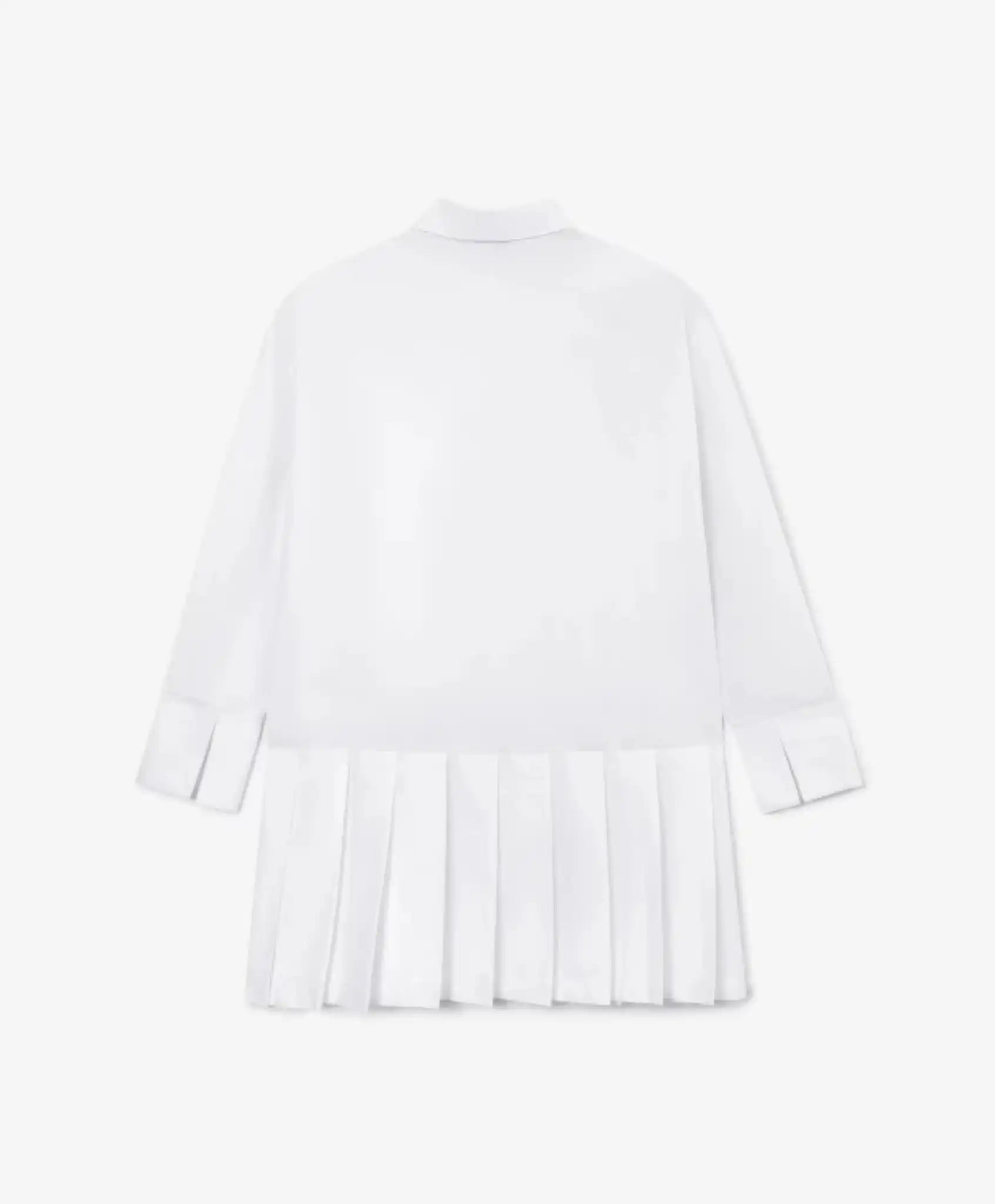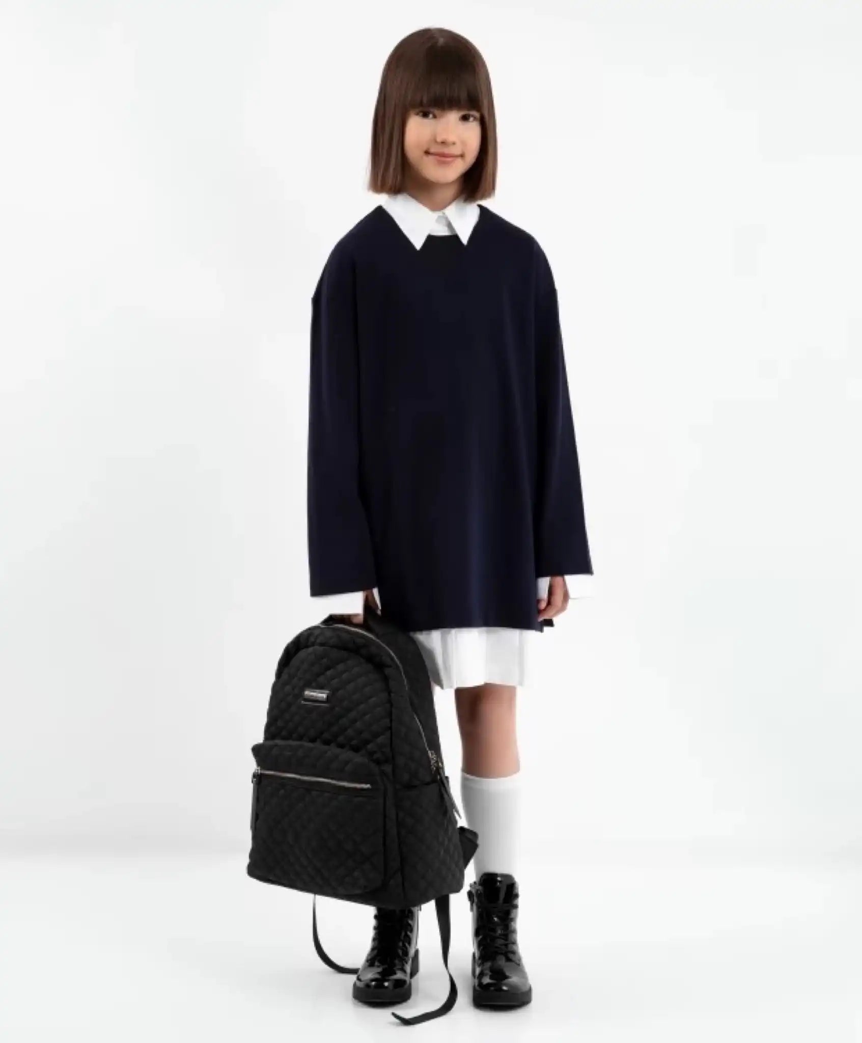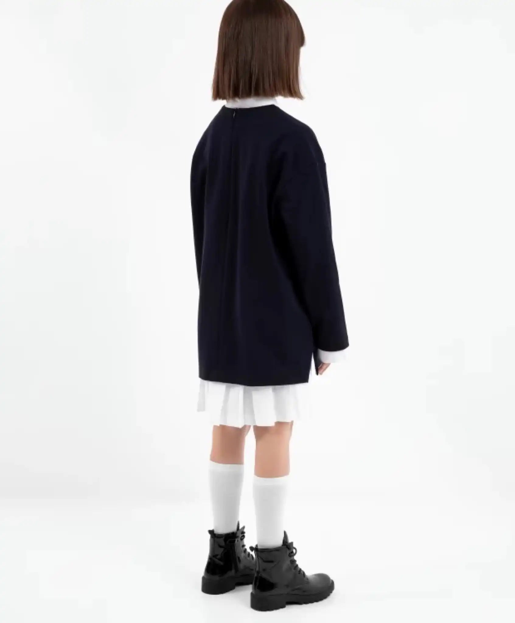 Un set interesant, alcătuit dintr-o tunică tricotată modernă și o rochie cămașă din textil, oferă posibilitatea de a crea multiple combinații stilistice. Atât împreună, cât și separat, piesele arată elegant și respectă codul vestimentar școlar. Rochia albă tip cămașă, din poplin, este un element esențial în garderoba unei fete. Pliseurile mari din partea inferioară, vizibile în ansamblul ținutei, îi conferă lejeritate, prospețime și romantism. Tunica albastră din jerseu exemplifică designul minimalist. Croiala simplă, buzunarele laterale, tăieturile înalte și tivul lat adaugă rafinament, completând perfect un look modern de business.