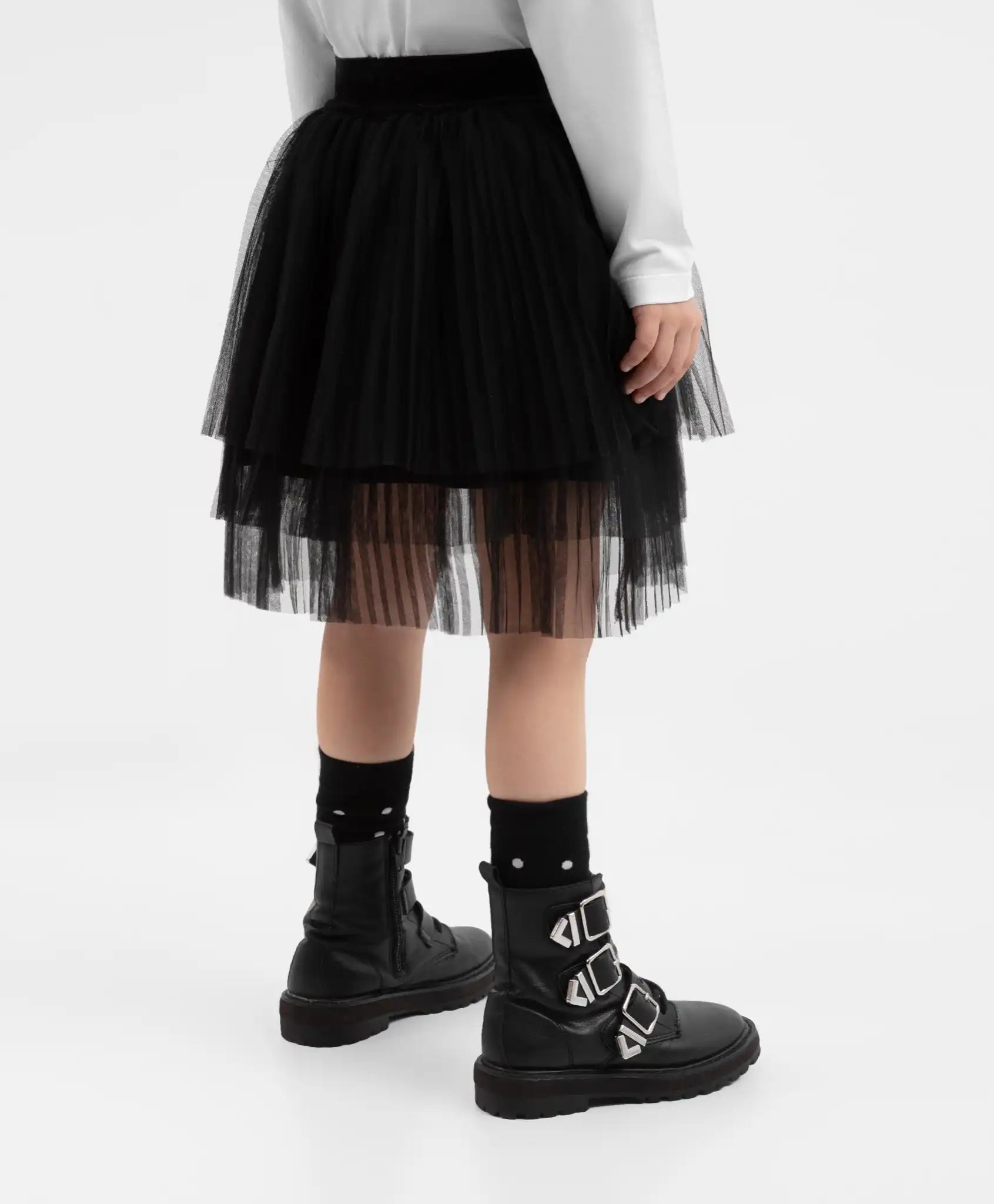 Pentru ocazii speciale – fustă neagră din mai multe straturi de tul! Este potrivită atât pentru ținutele de Anul Nou, cât și pentru alte evenimente festive sau plimbări scurte, când starea de spirit cere ceva special. Căptușeala este fabricată din 100% bumbac, asigurând confort pe tot parcursul zilei. Pe betelia elastică sunt aplicate elemente tipografice contrastante. Fusta va arăta minunat cu hanoracul scurt din velur 22401GMC1601 sau tricoul cu mânecă lungă 22401GMC1202, dar și cu alte piese vestimentare din colecția „Roses” și nu numai. Pentru un look mai expresiv, poate fi accesorizată cu o geantă crossbody, clame de păr sau o bentiță.