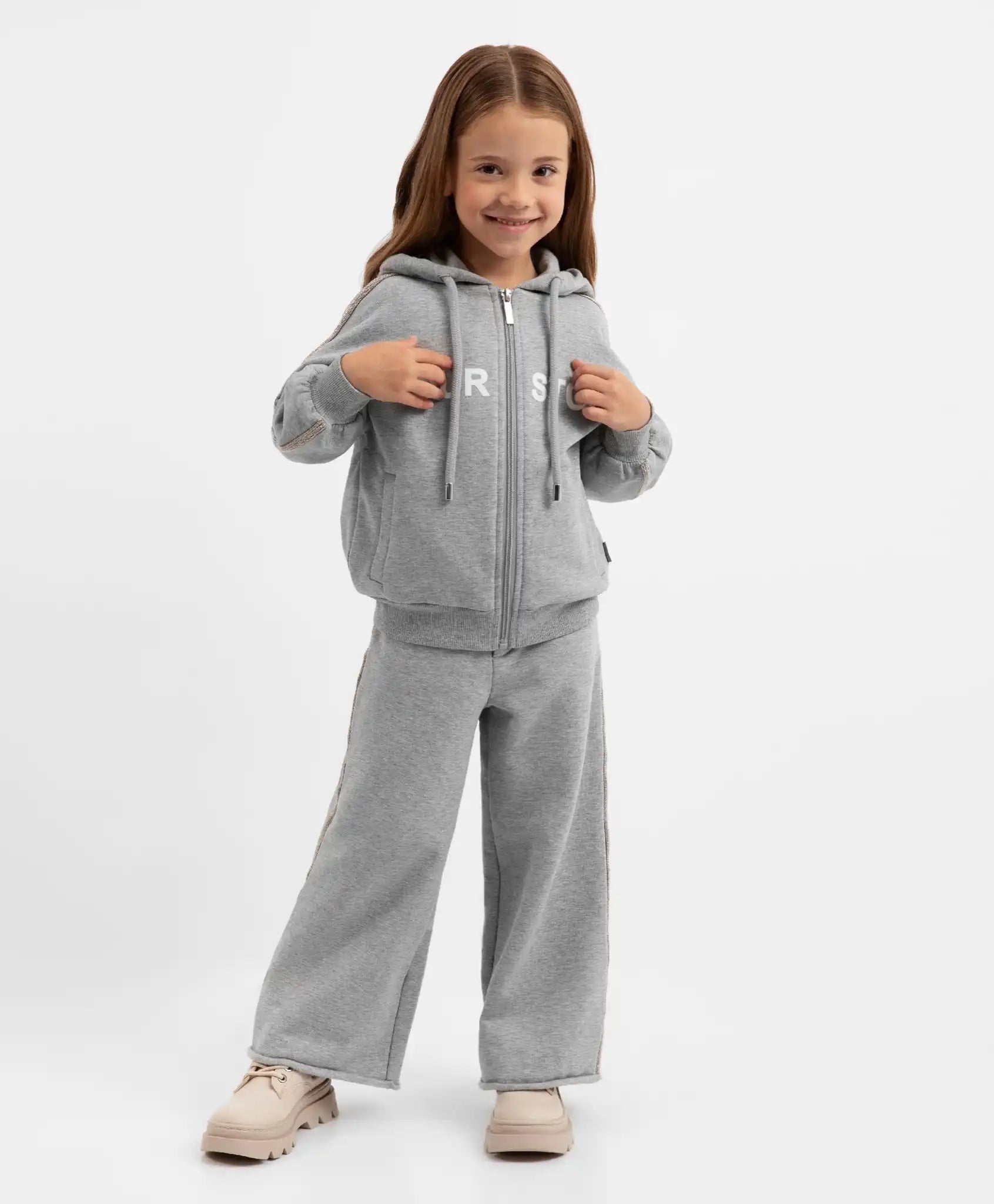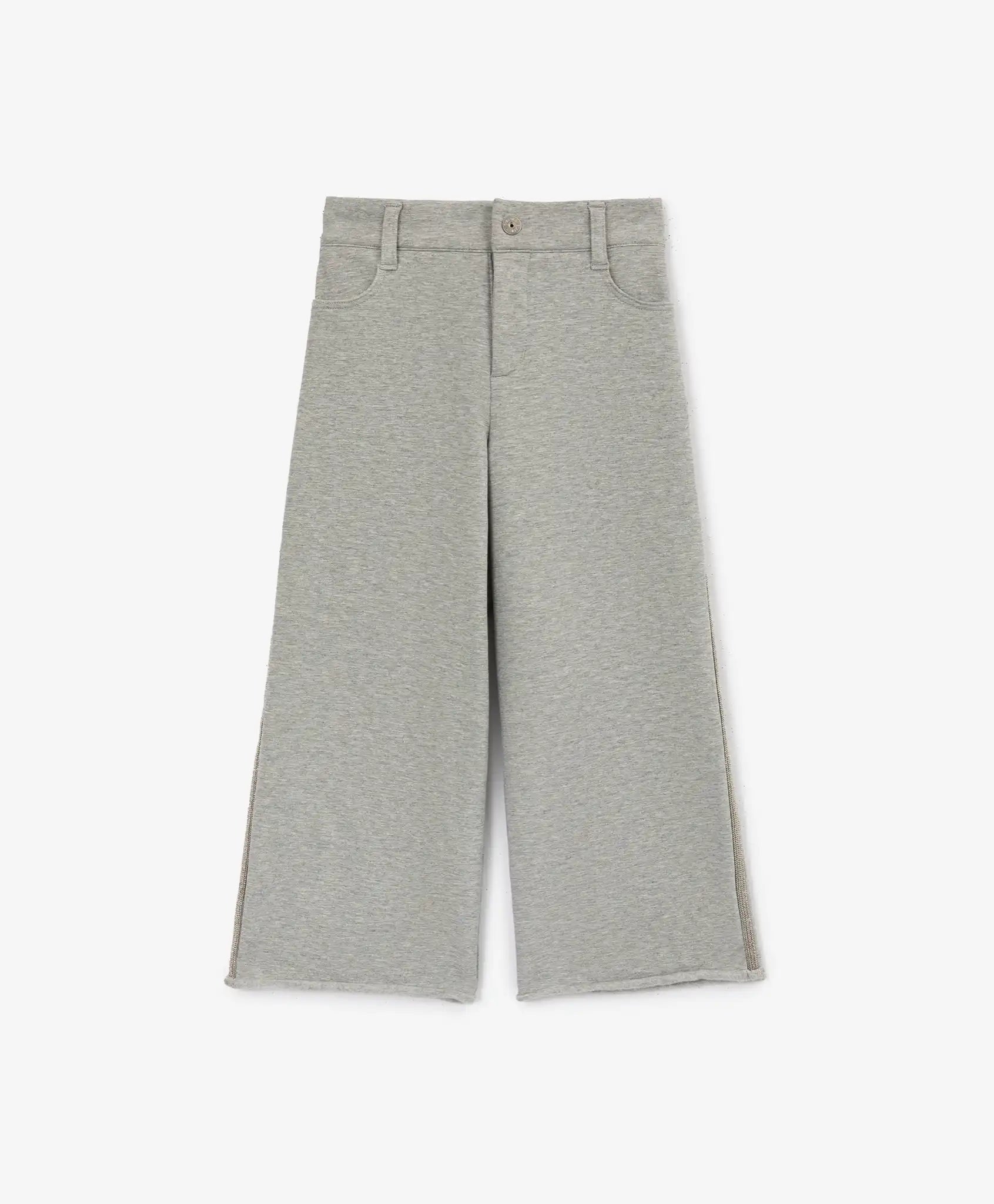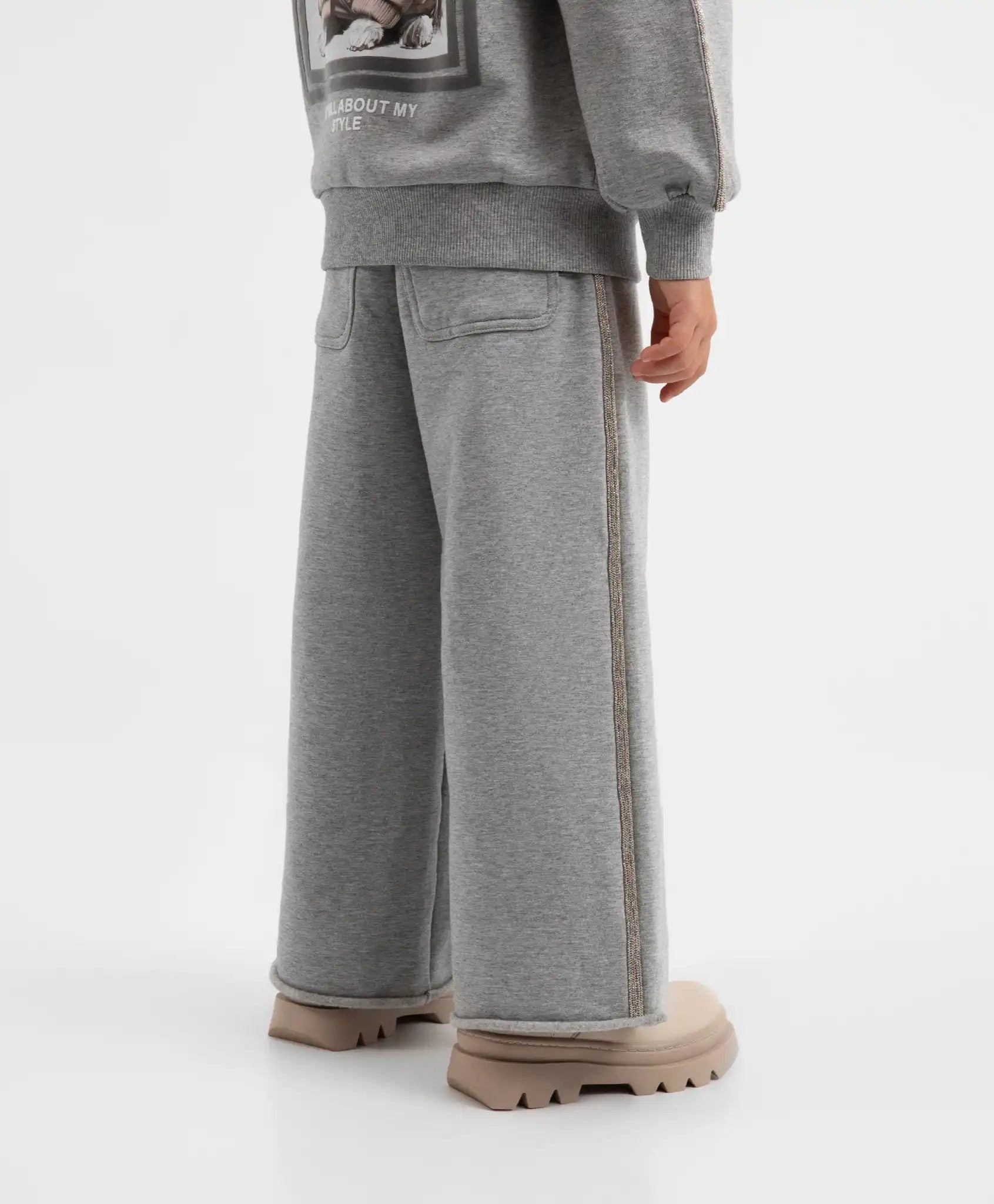 Pantalonii gri confortabili vor completa ținutele stilate de toamnă în spiritul sport-chic! Confecționați din fleece moale, cu interior căptușit din polar, pantalonii cu croială palazzo vor deveni preferații garderobei unei fete. Materialul își menține perfect forma, este elastic și păstrează căldura. Designul este accentuat de lanțuri aplicate pe cusăturile laterale. Pantalonii dispun de două buzunare laterale, două buzunare la spate și găici pentru curea. Se închid cu fermoar și nasture. Asortați cu hanoracul gri 22402GMC1604, pantalonii vor forma un set complet, dar pot fi purtați și cu un helancă, pulover sau bluză din colecția „Maltipu”.