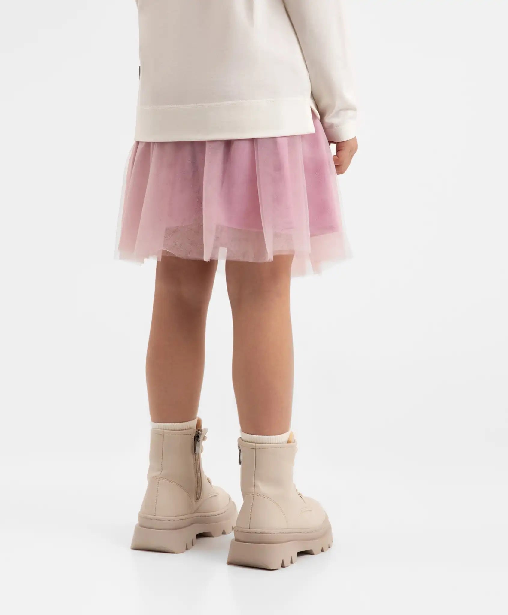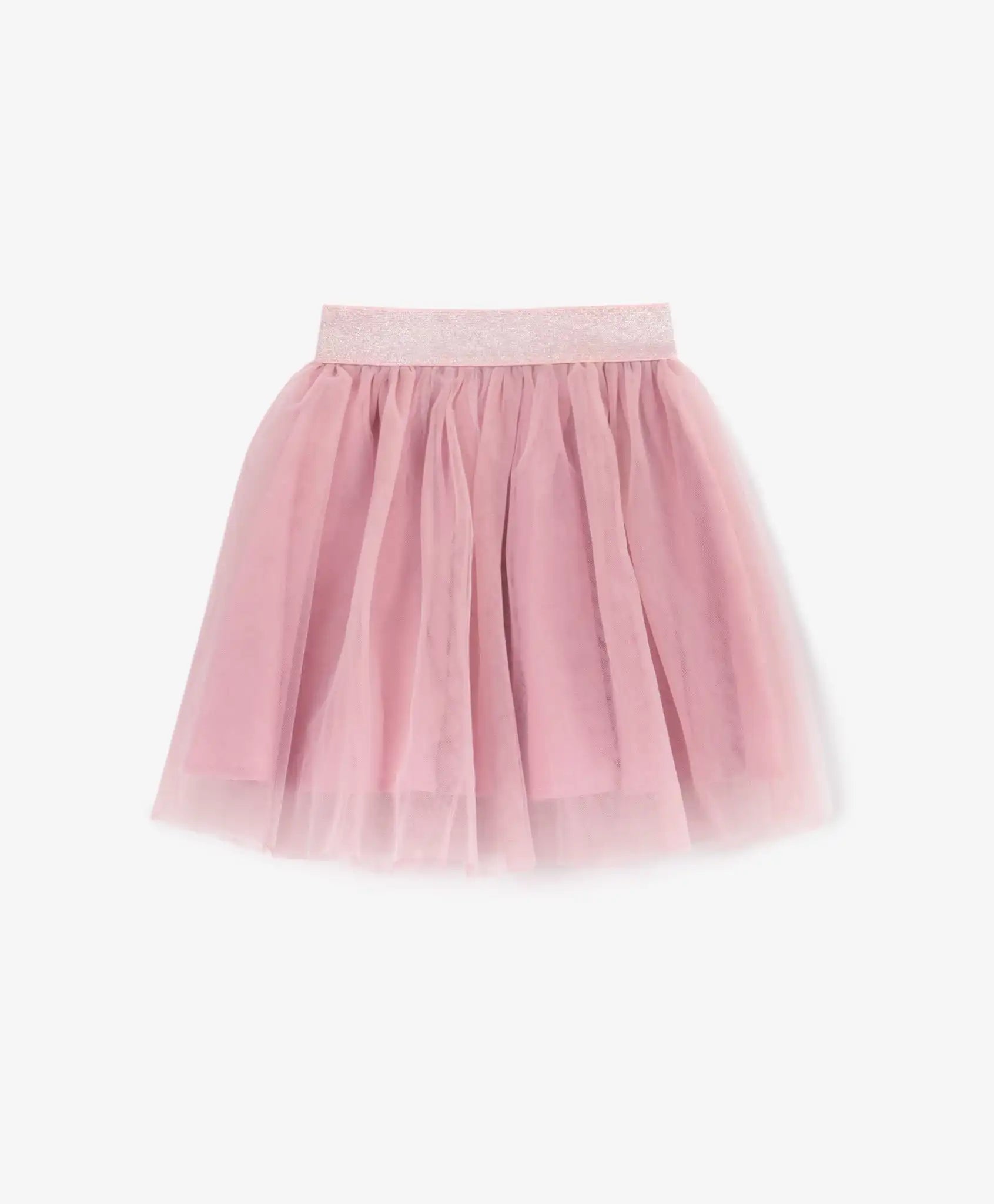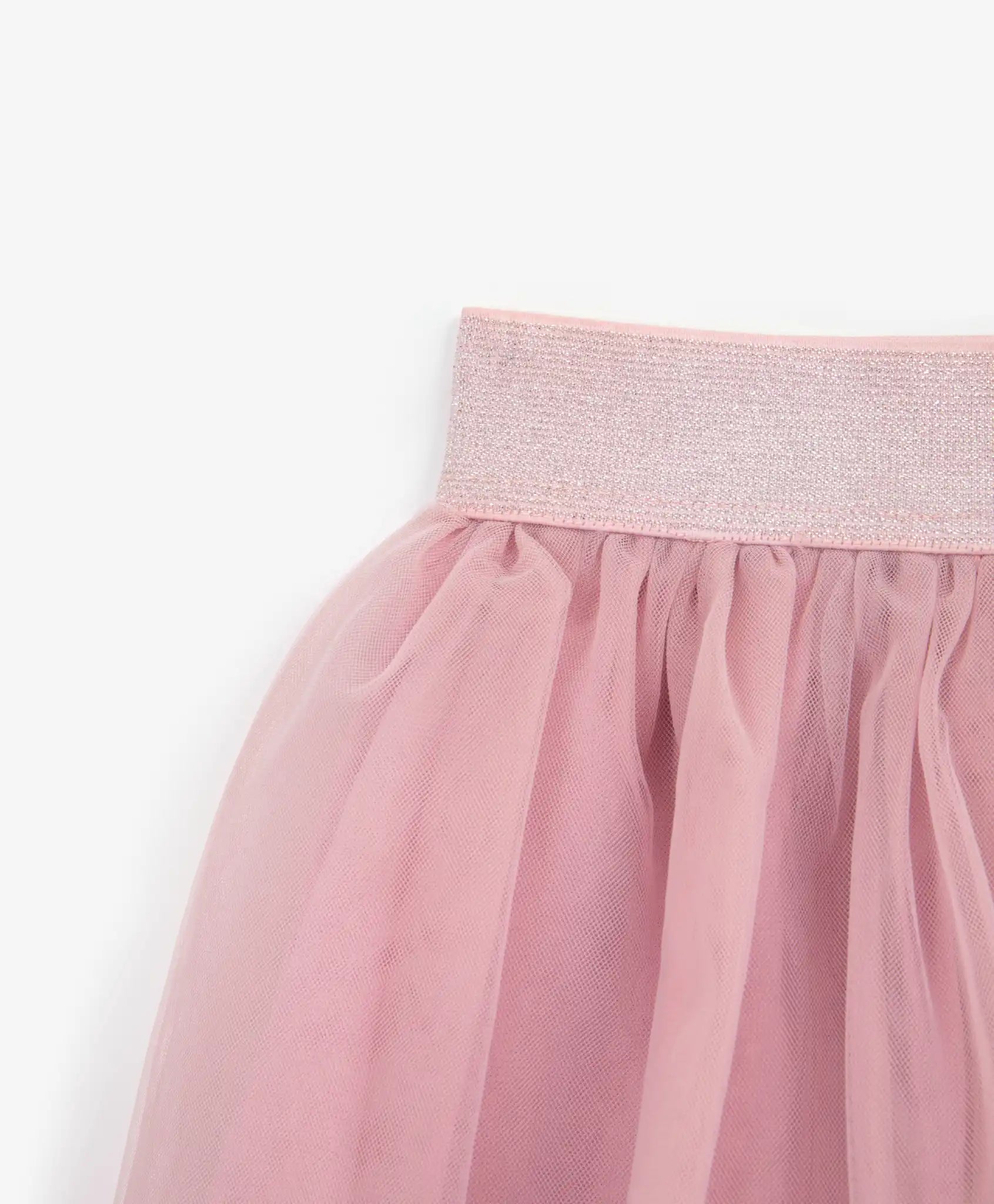 Fusta roz din tul, voluminoasă și vaporoasă, aduce un aer festiv, bucurie și distracție nesfârșită! Straturile multiple de tul creează un efect delicat, ușor și aerat. Căptușeala din bumbac asigură un contact plăcut cu pielea. Fusta are o betelie moale, elastică, cu fire strălucitoare de lurex.