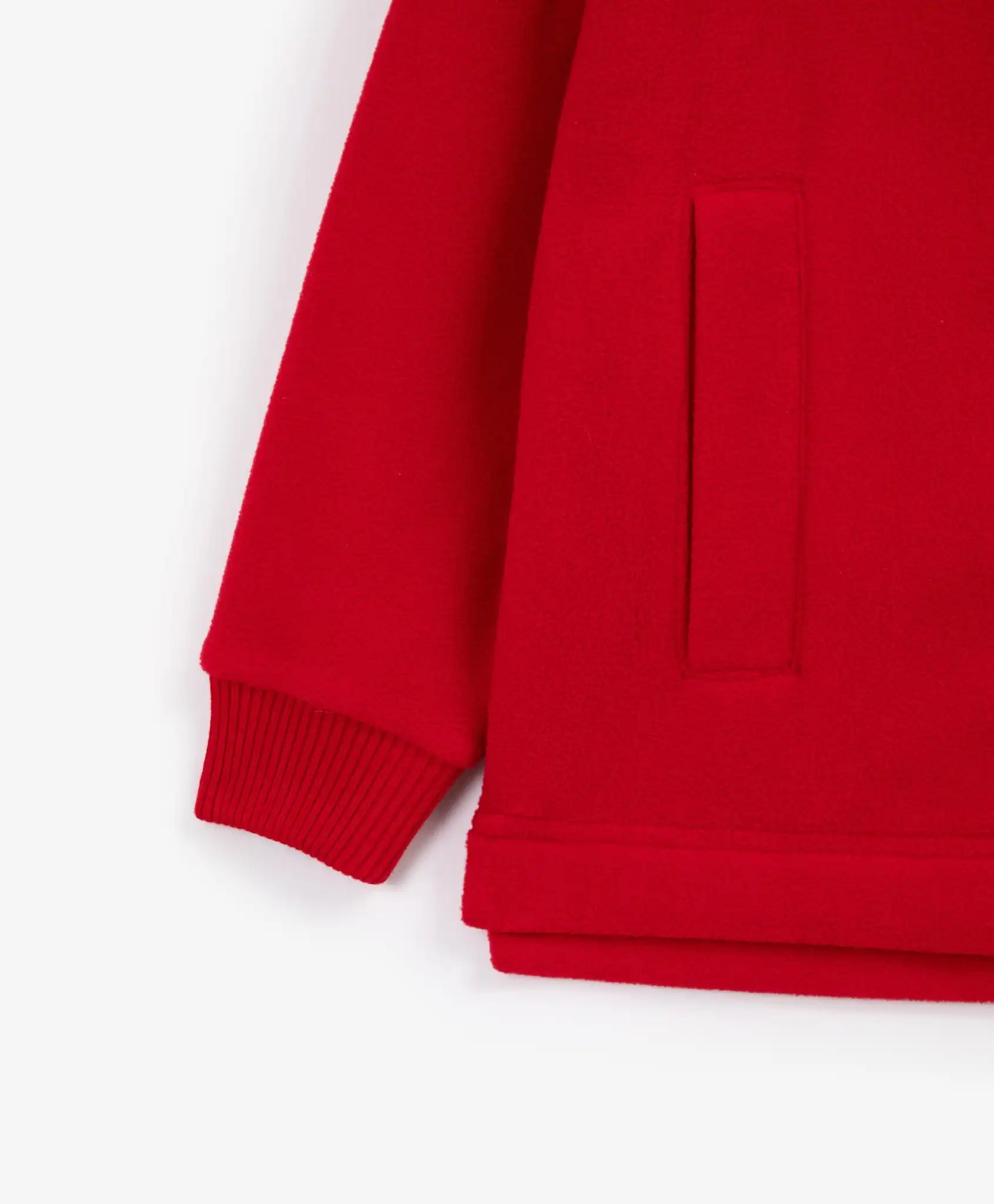 Hanoracul roșu din polar moale și plăcut la atingere este ca un foc aprins care oferă căldură. Acesta va încălzi perfect într-o zi rece de iarnă și va completa garderoba de iarnă a fetei. Materialul aproape că nu se șifonează, fiind ușor de întreținut și utilizat. Hanoracul are două buzunare, manșete elastice, iar pe spate este plasată o mică aplicație cu elemente tipografice. Modelul se închide cu fermoar cu tragător branduit.