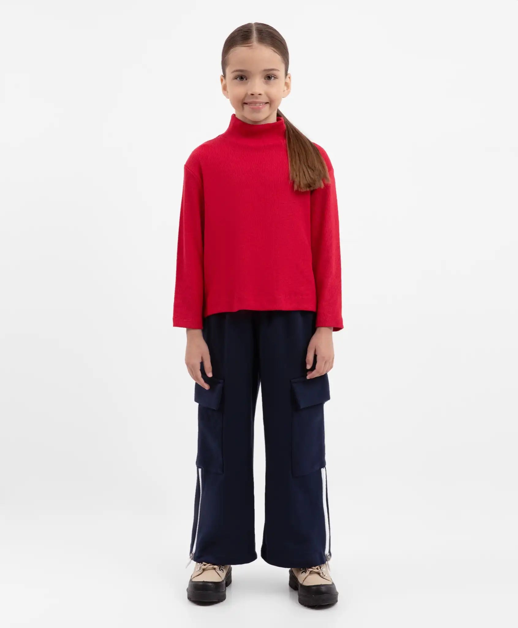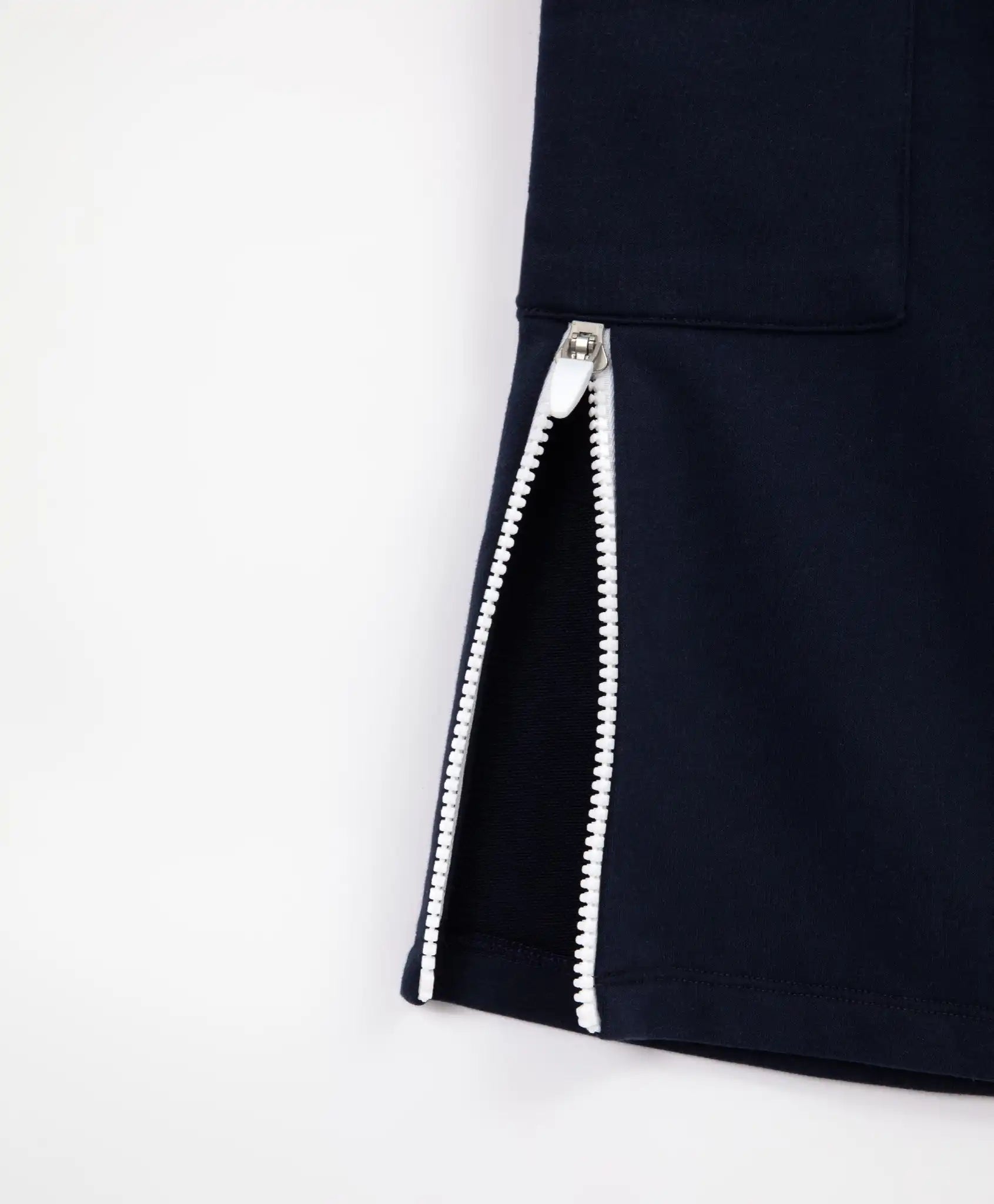 Un simbol al dinamismului și libertății! Pantalonii evazați bleumarin, cu buzunare cargo și fermoare contrastante în partea inferioară, au un aspect extrem de stilat și modern. Sunt confecționați dintr-un material tricotat interlock, moale și rezistent, care își menține forma și oferă o izolare termică excelentă – deosebit de importantă în sezonul toamnă-iarnă. Fermoarele albe de pe cusăturile laterale pot fi deschise pentru a conferi siluetei un aspect mai lejer și aerisit. Betelia elastică dublă, care se mulează perfect pe talie, asigură o potrivire ideală. Pe partea din spate a pantalonilor este aplicat un imprimeu tipografic minimalist.