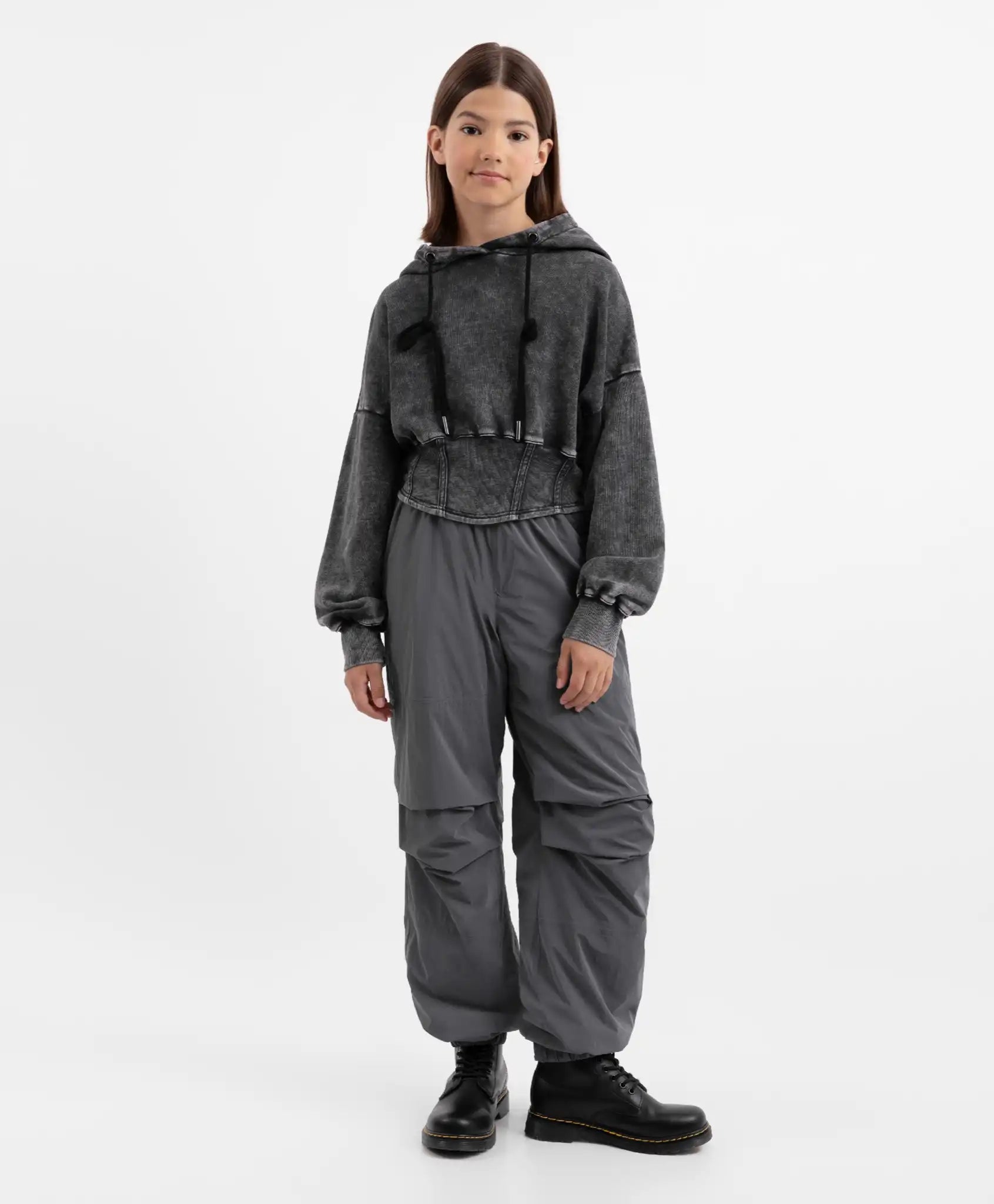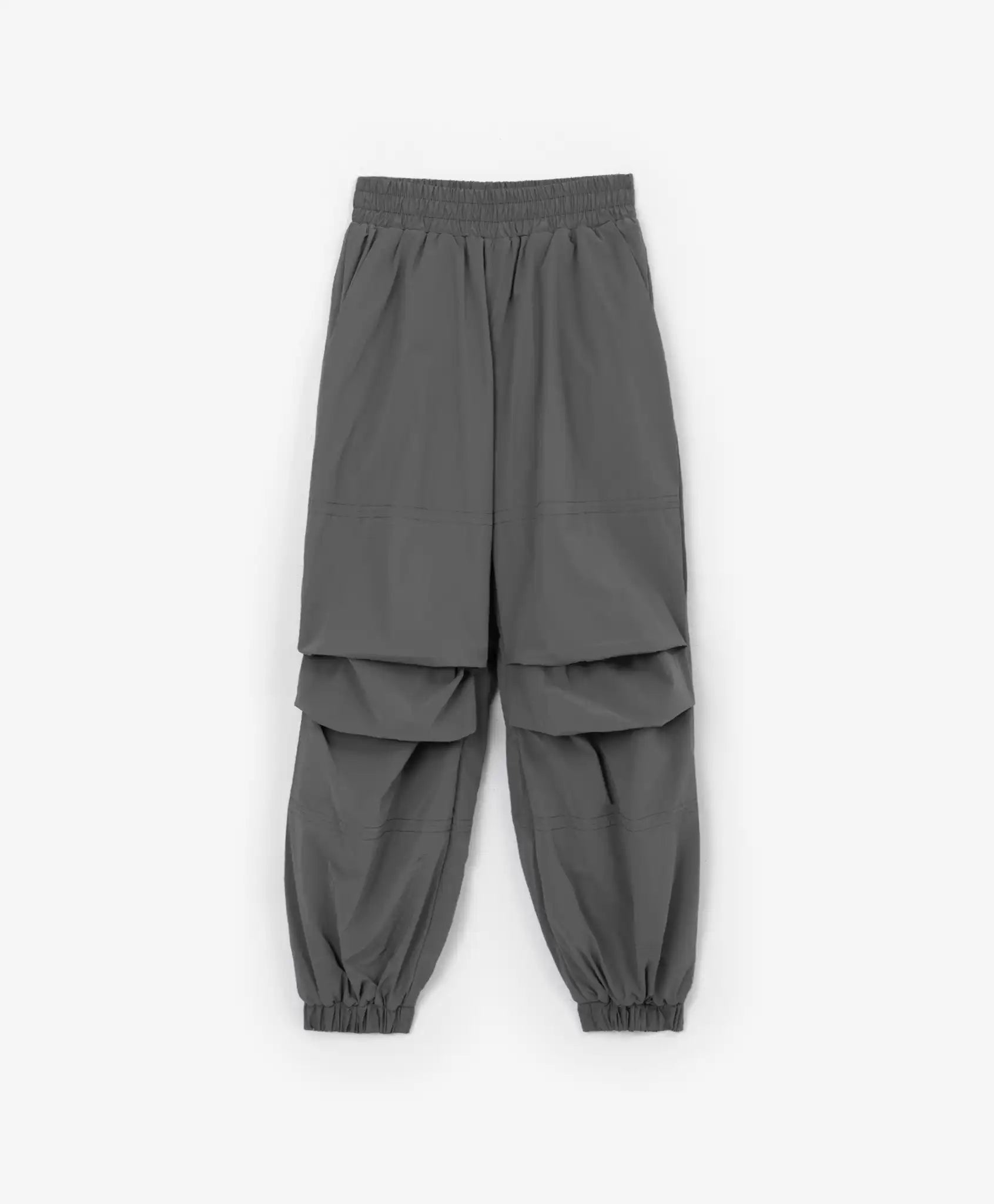 Pantalonii gri de tranziție, cu croială lejeră, sunt alegerea ideală pentru adolescenți în lunile reci! Silueta călduroasă și modernă, cu manșete, se integrează perfect în ținutele zilnice ale unei fete. Pantalonii sunt confecționați dintr-un nailon dens, care respinge umezeala și protejează împotriva vântului. Dispun de buzunare laterale tăiate pentru depozitarea obiectelor mici și de o betelie elastică pentru o potrivire confortabilă pe talie.