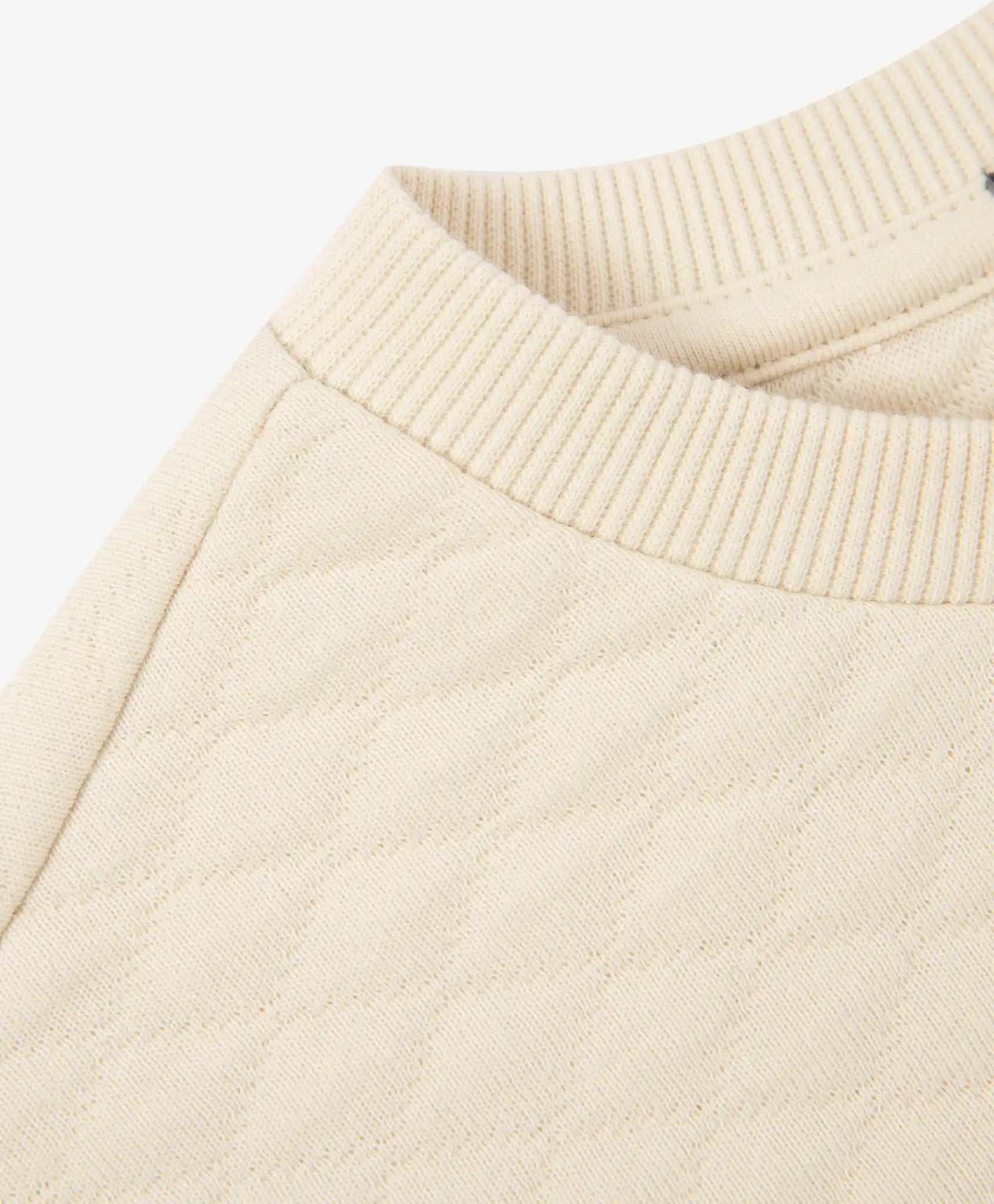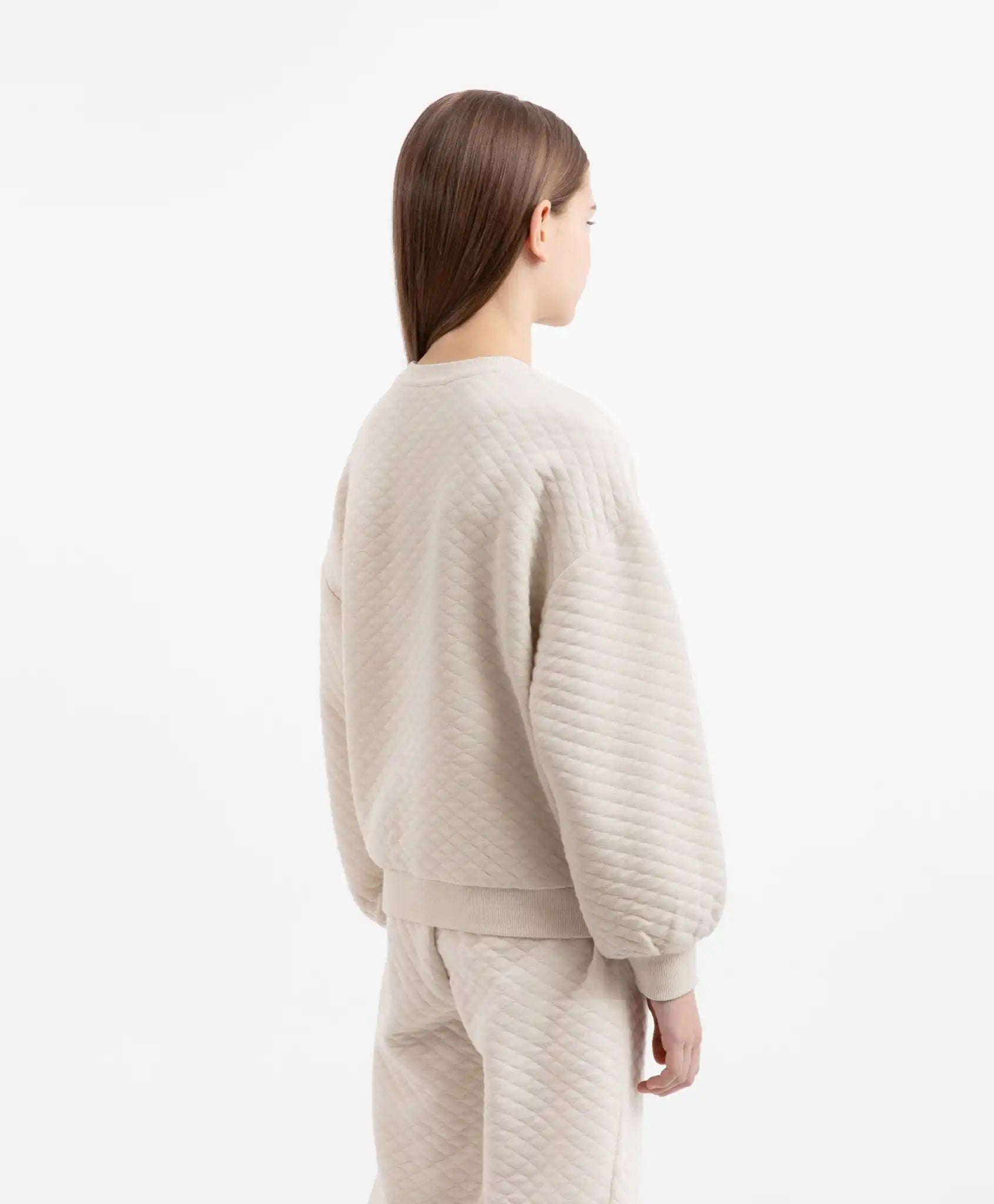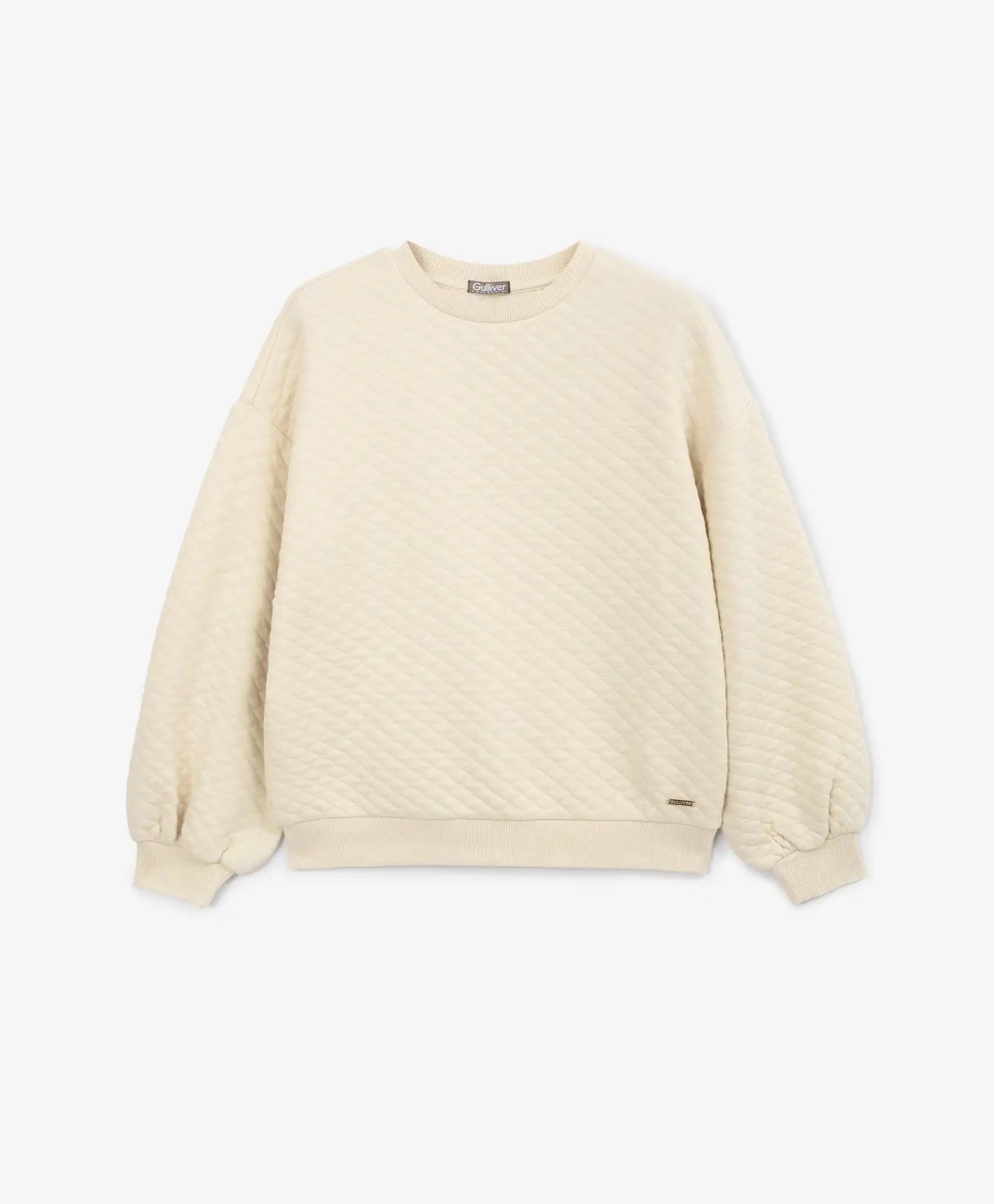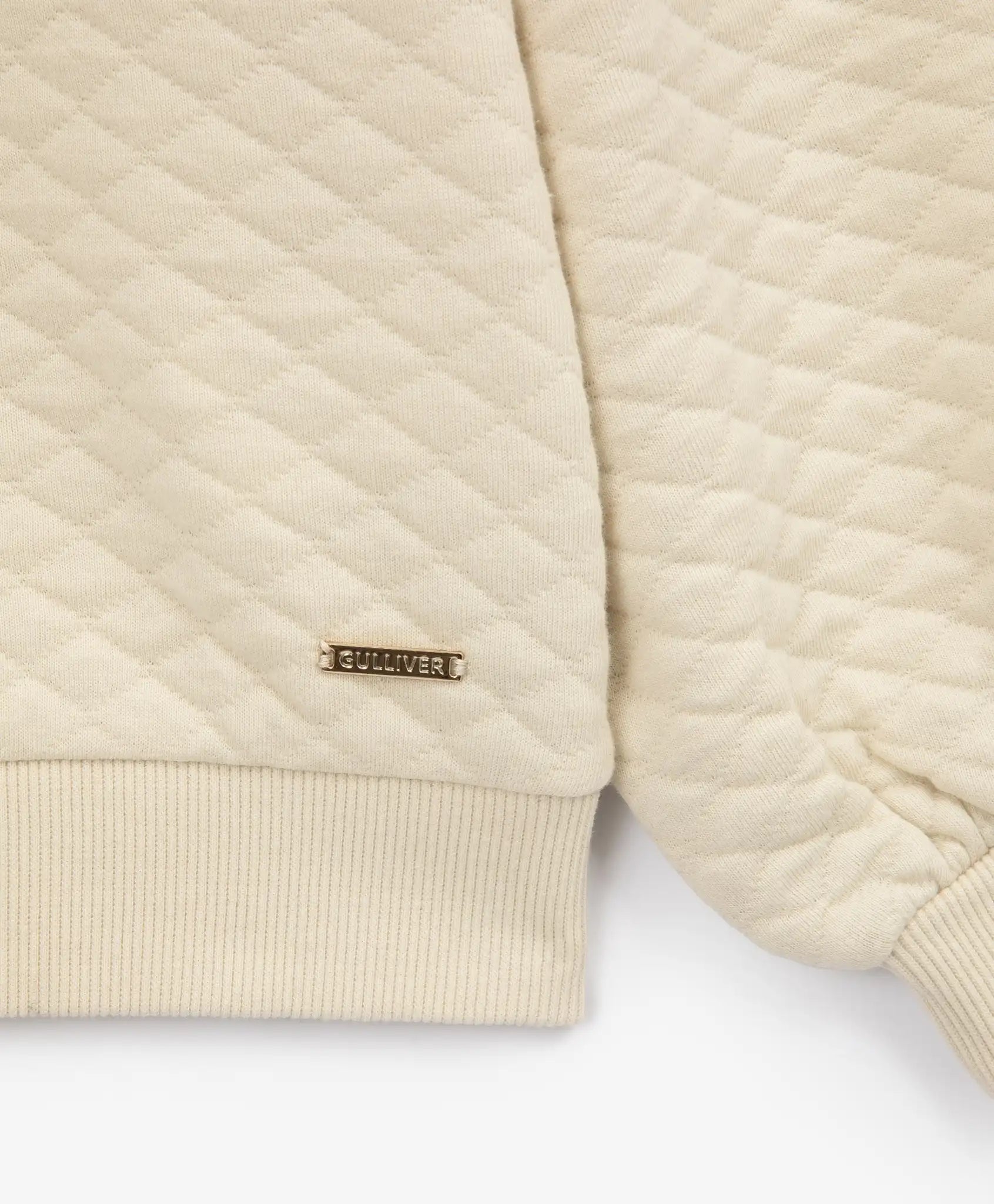 O combinație interesantă de materiale care nu va lăsa pe nimeni indiferent! Hanoracul crem, cu croială moderat lejeră și mâneci din piele ecologică, este confecționat din tricot matlasat cu un model distinctiv în formă de romburi. Materialul este plăcut la atingere, flexibil și își menține forma. Mânecile pufoase adaugă o notă cochetă, făcând hanoracul și mai confortabil. Acesta va alcătui un set comod cu pantalonii crem din același material 22408GJC5605 și va arăta grozav cu blugi, pantaloni din catifea sau din piele ecologică.