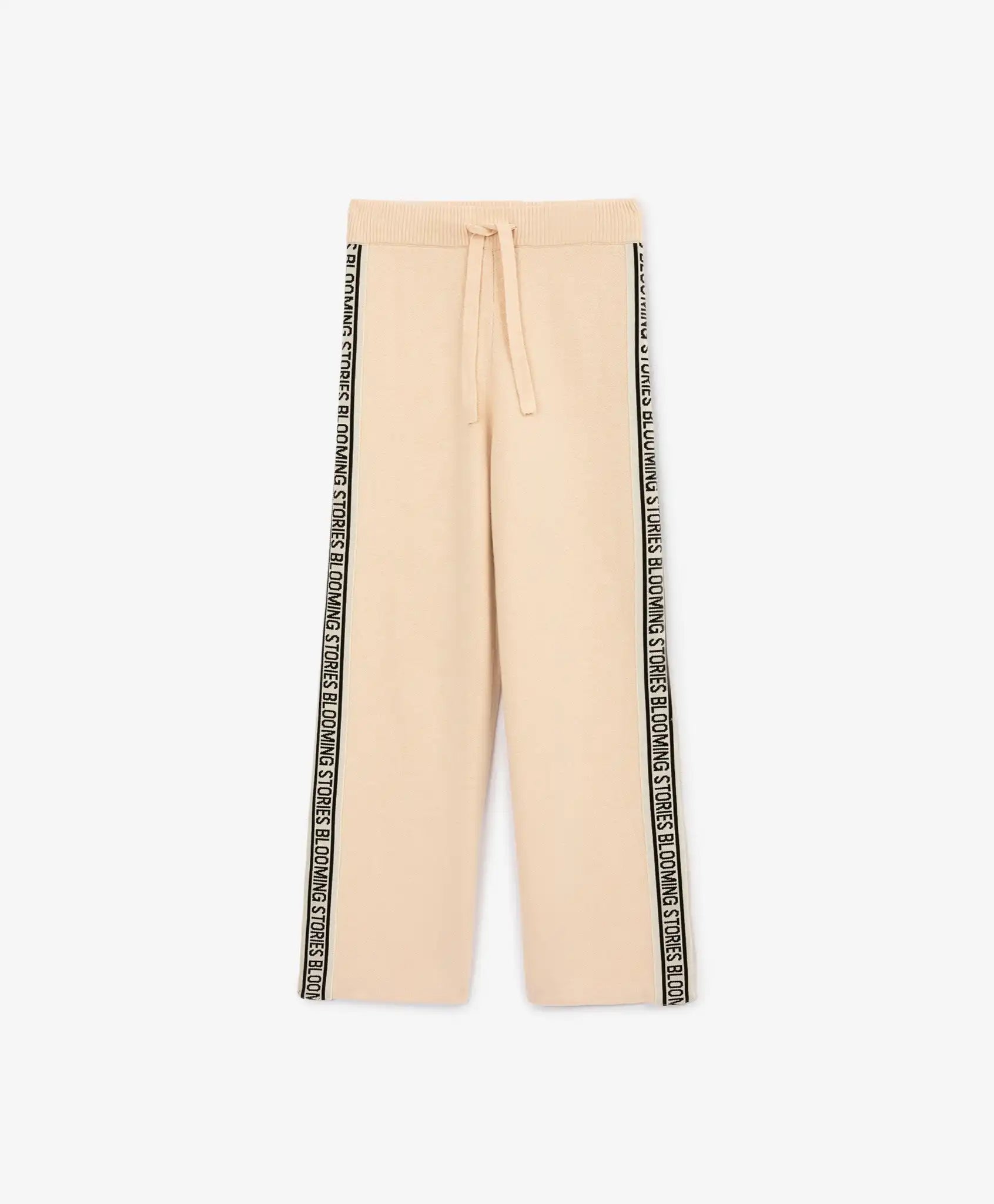 Parfumul frunzelor de toamnă, ceaiul fierbinte și răcoarea ușoară – aceasta este atmosfera pe care o creează acești pantaloni tricot bej, un simbol al confortului, liniștii și protecției! Confecționați dintr-un tricot moale cu conținut de lână, aceștia oferă căldură și confort. În designul pantalonilor sunt utilizate benzi laterale cu elemente tipografice. Talie elastică se mulează perfect și poate fi ajustată cu șnur. Modelul va completa perfect cardiganul bej 22408GJC3501, dar poate fi baza și pentru alte piese din colecție.