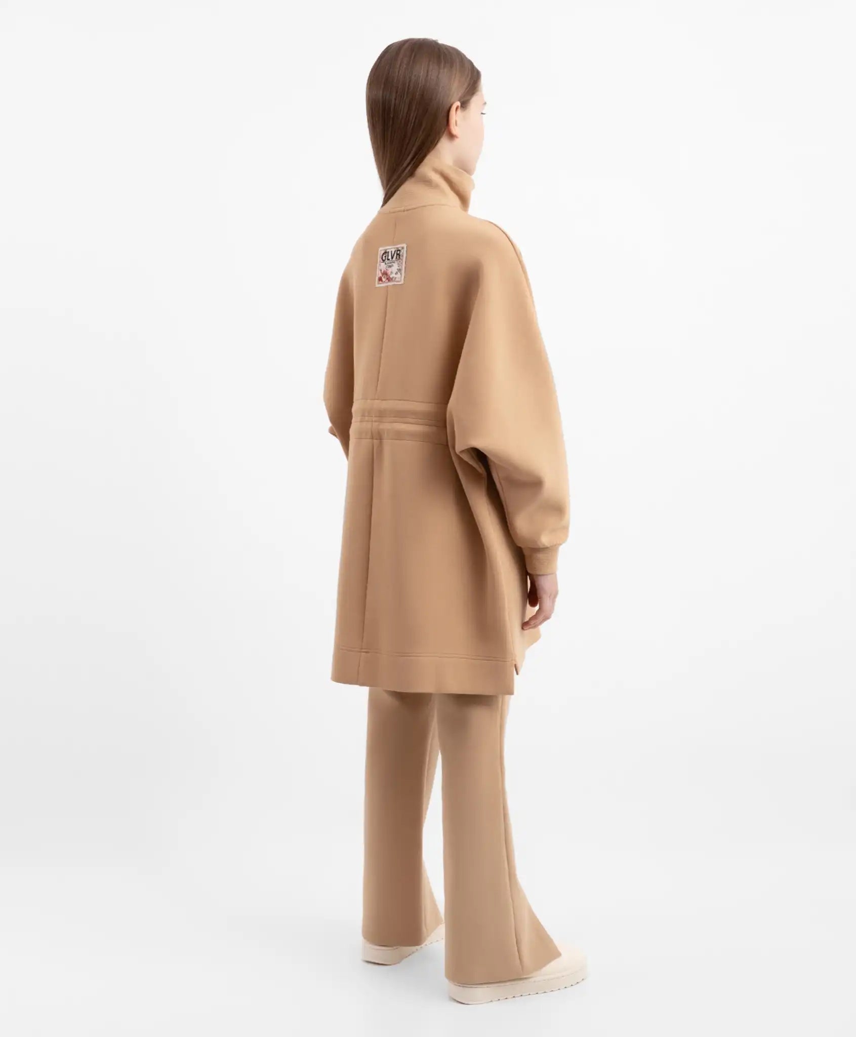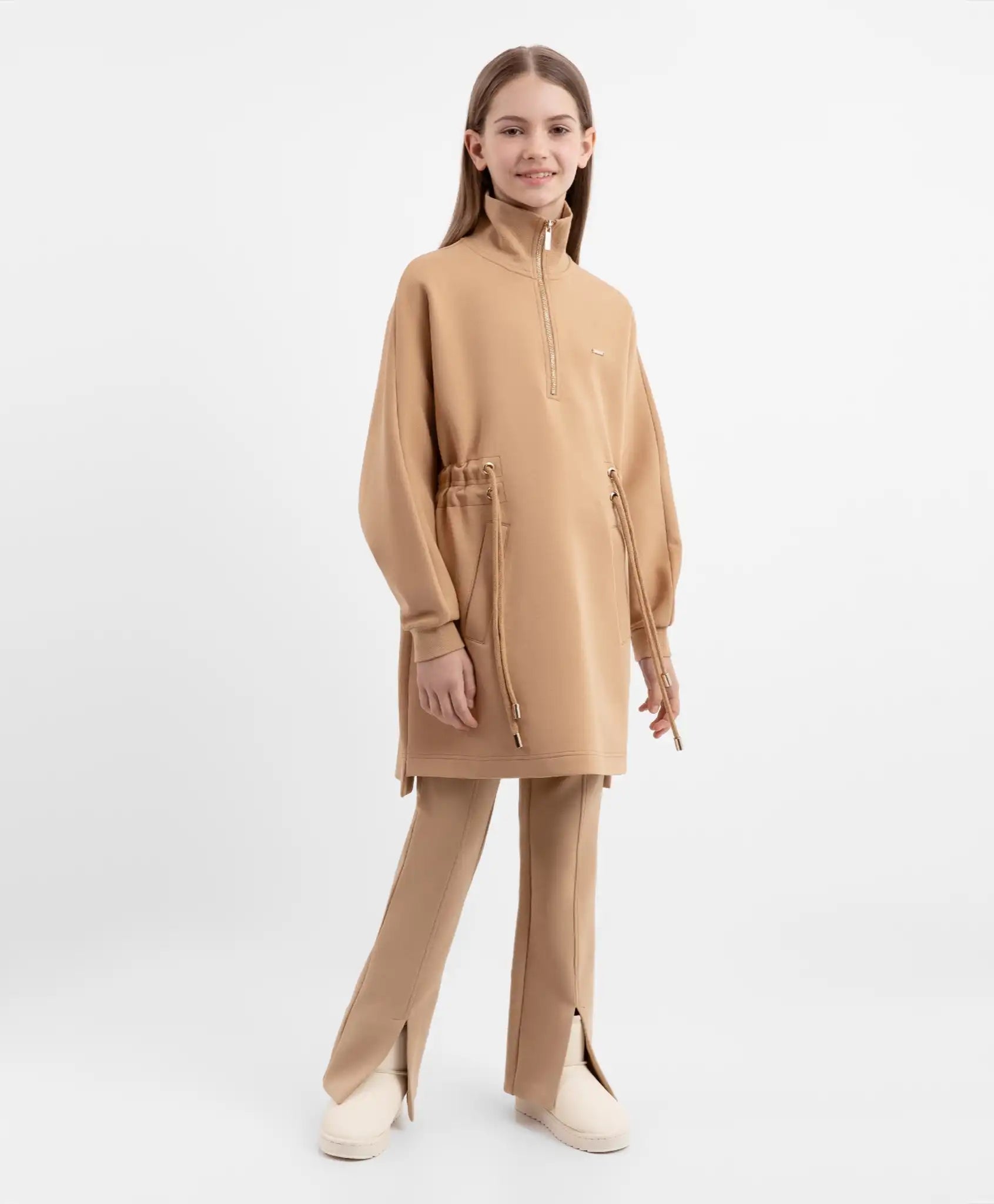 Rochiile pot fi și funcționale! De exemplu, această rochie tricotată într-o nuanță plăcută de maro va deveni un element de bază în garderoba unei fete. Materialul tricotat elastic, cu un conținut ridicat de bumbac, este moale, plăcut la atingere și ușor de întreținut. Rochia oversize dispune de buzunare laterale și un cordon dublu ajustabil, permițând reglarea siluetei. Gulerul înalt cu fermoar adaugă un aer modern și îndrăzneț modelului. Decorul include o plăcuță metalică cu branding și un ecuson cu elemente tipografice și imprimeu floral.