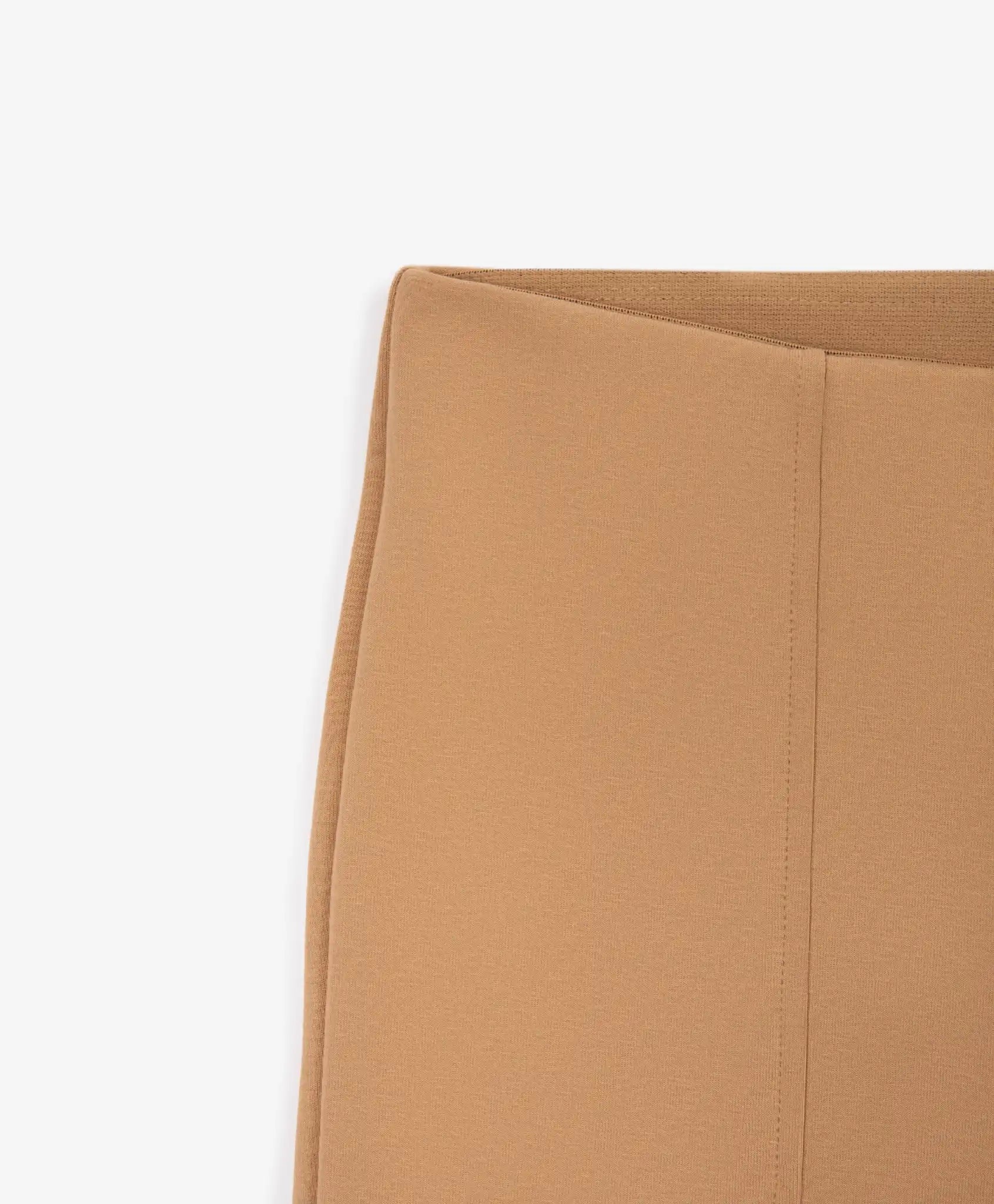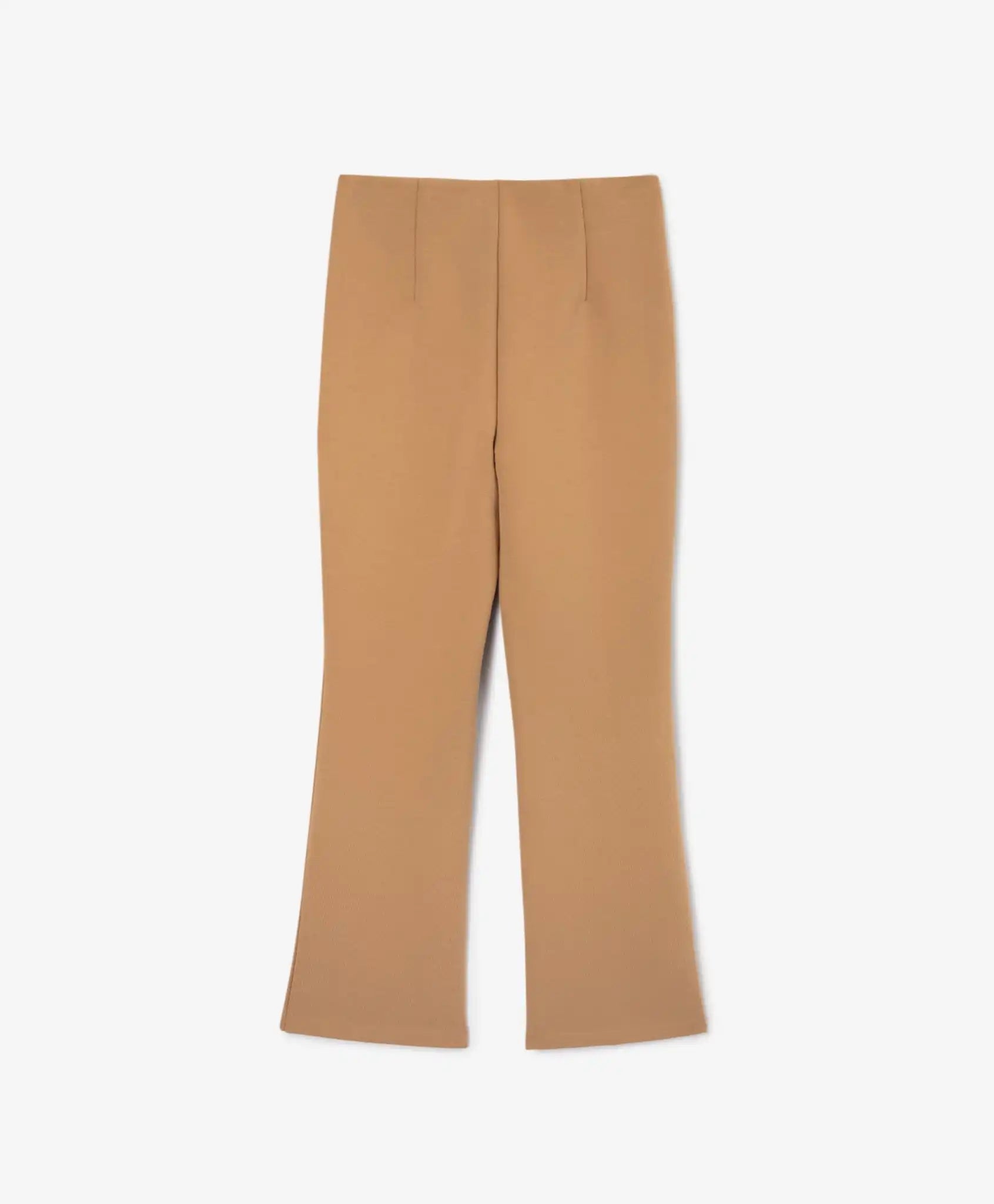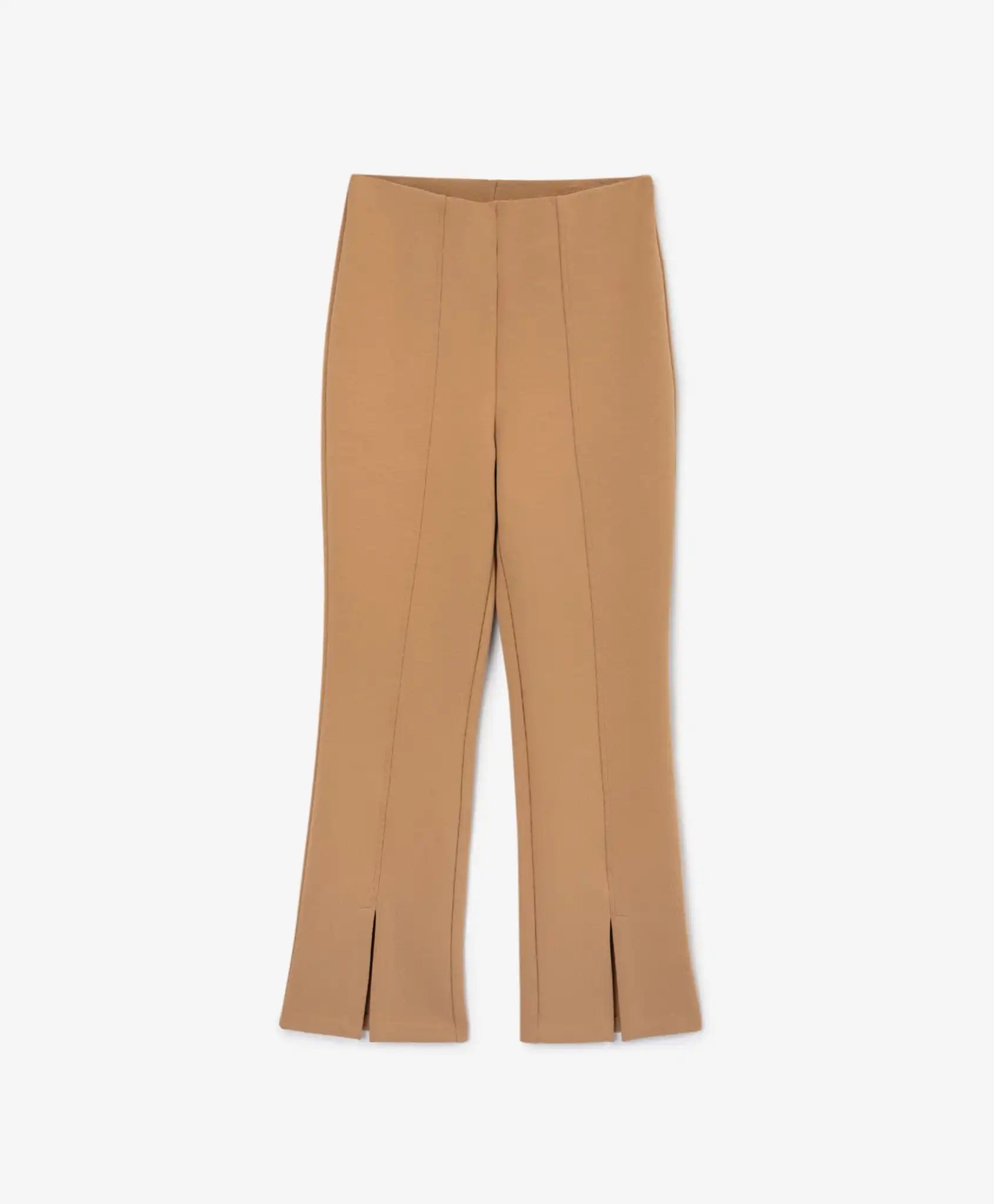 O stare de spirit – cafea cu lapte! Pantalonii evazați din tricot maro deschis vor crea ținute memorabile. Confecționați dintr-un tricot interlock rezistent și elastic, aceștia evidențiază silueta prin croiala elegantă. Modelul este unic datorită tăieturilor înalte și cusăturilor texturate verticale pe partea din față, care adaugă un plus de rafinament. Acești pantaloni se vor potrivi perfect cu orice piesă superioară din colecția „Caramel”.