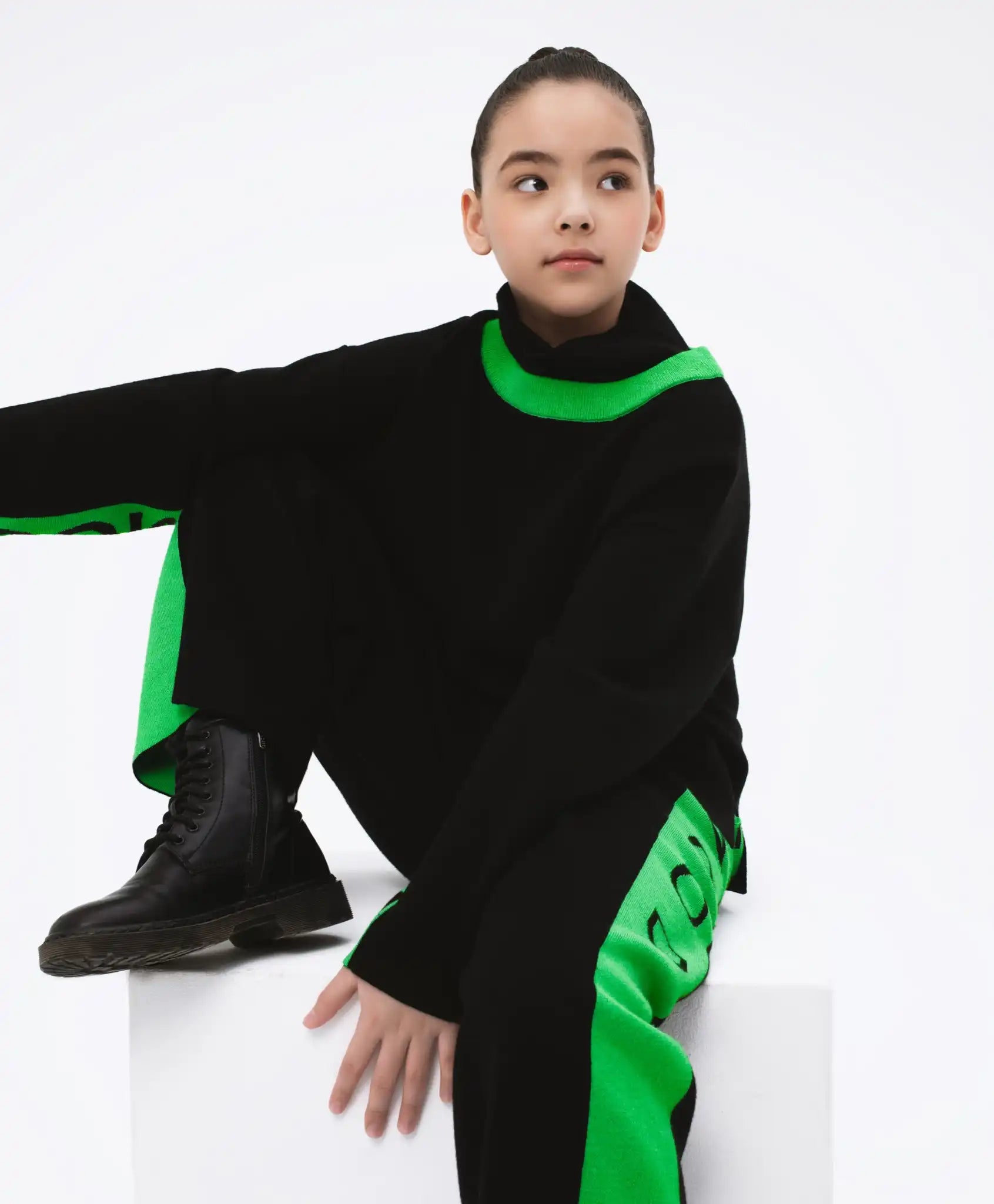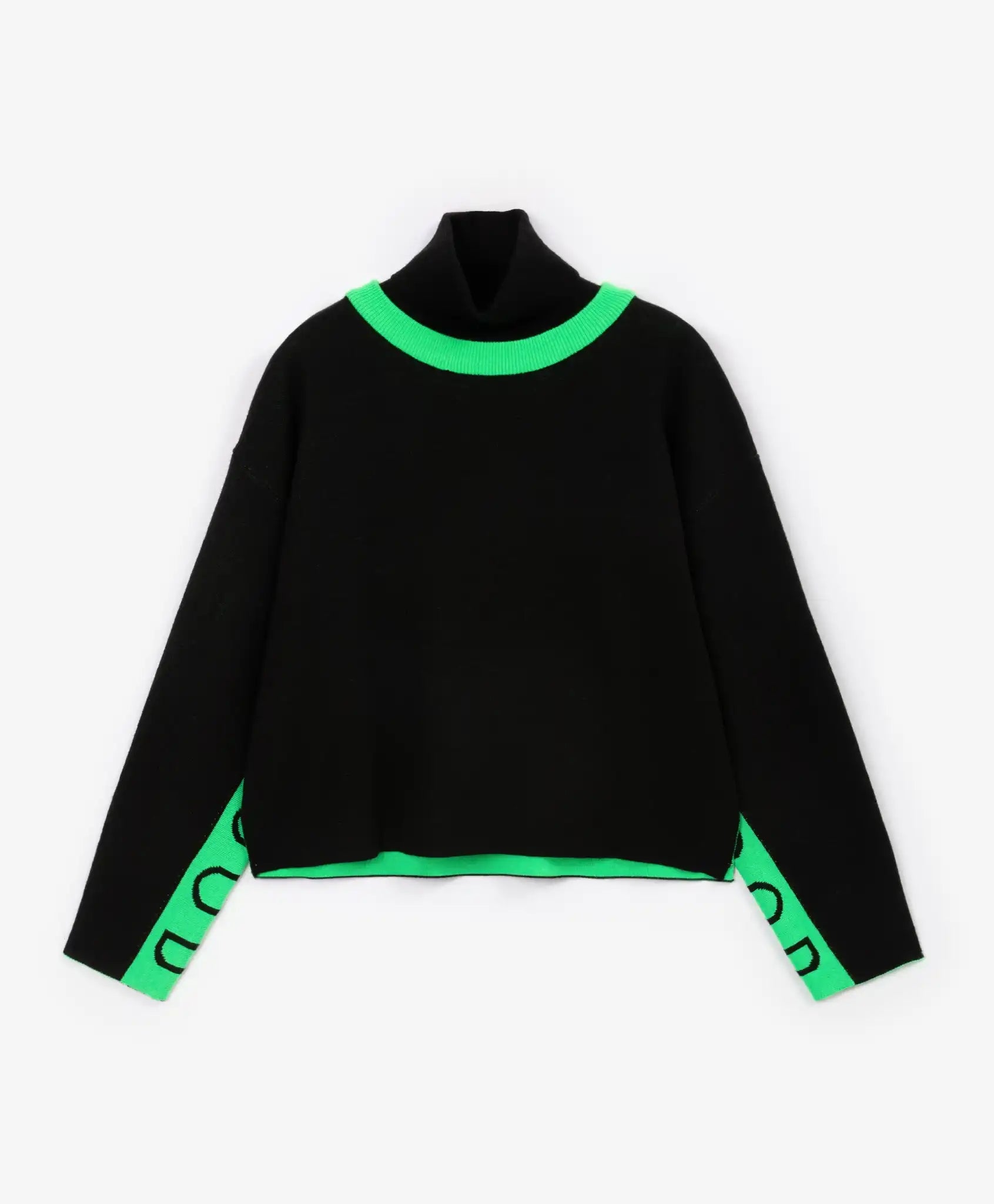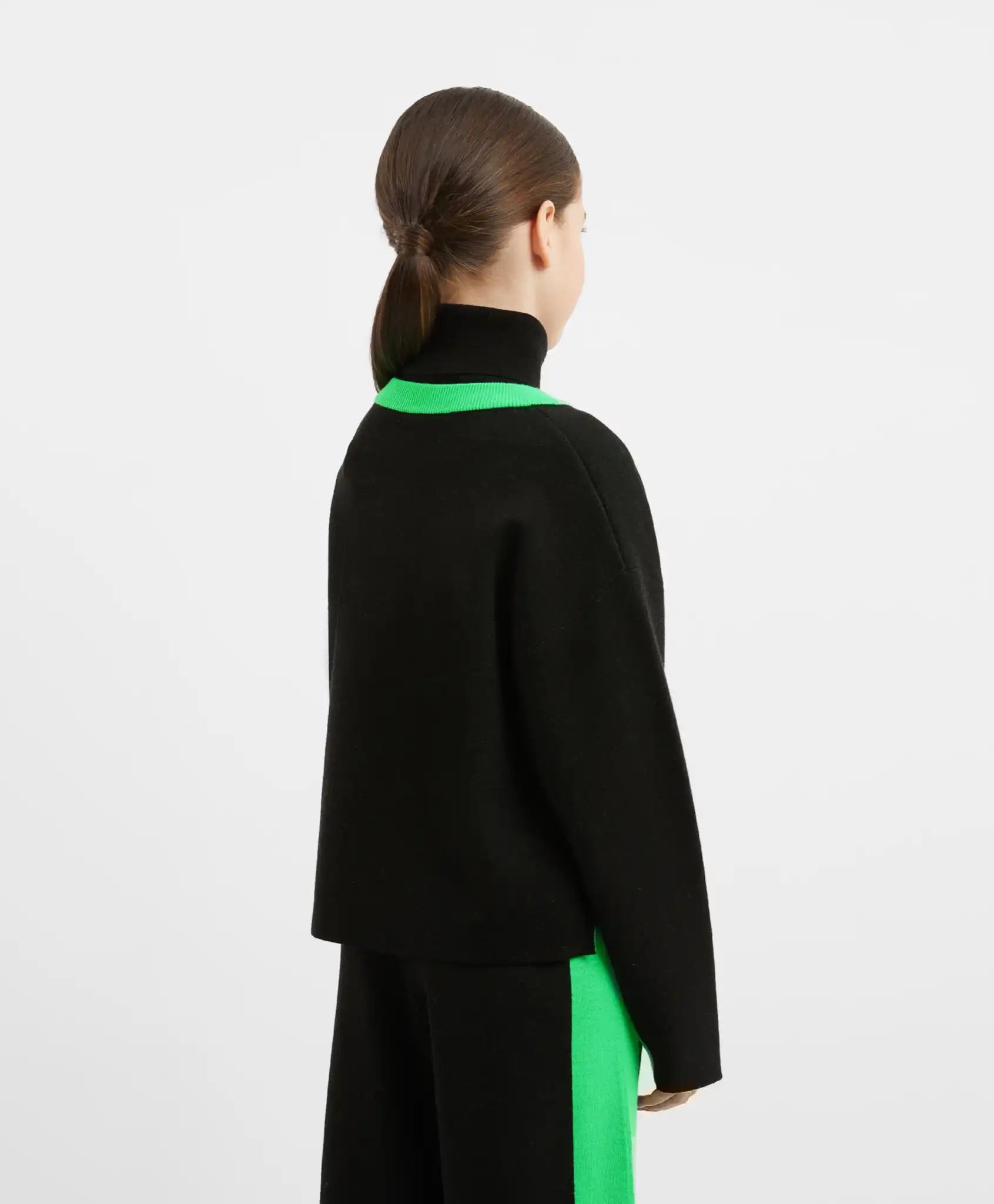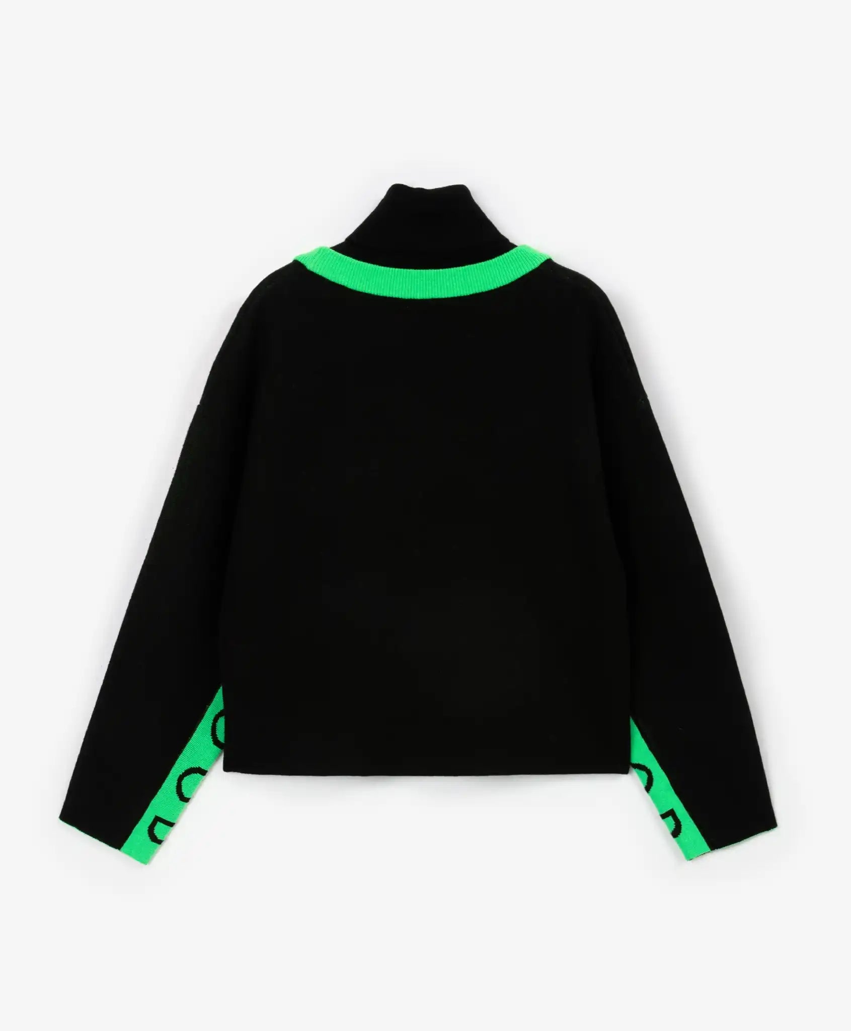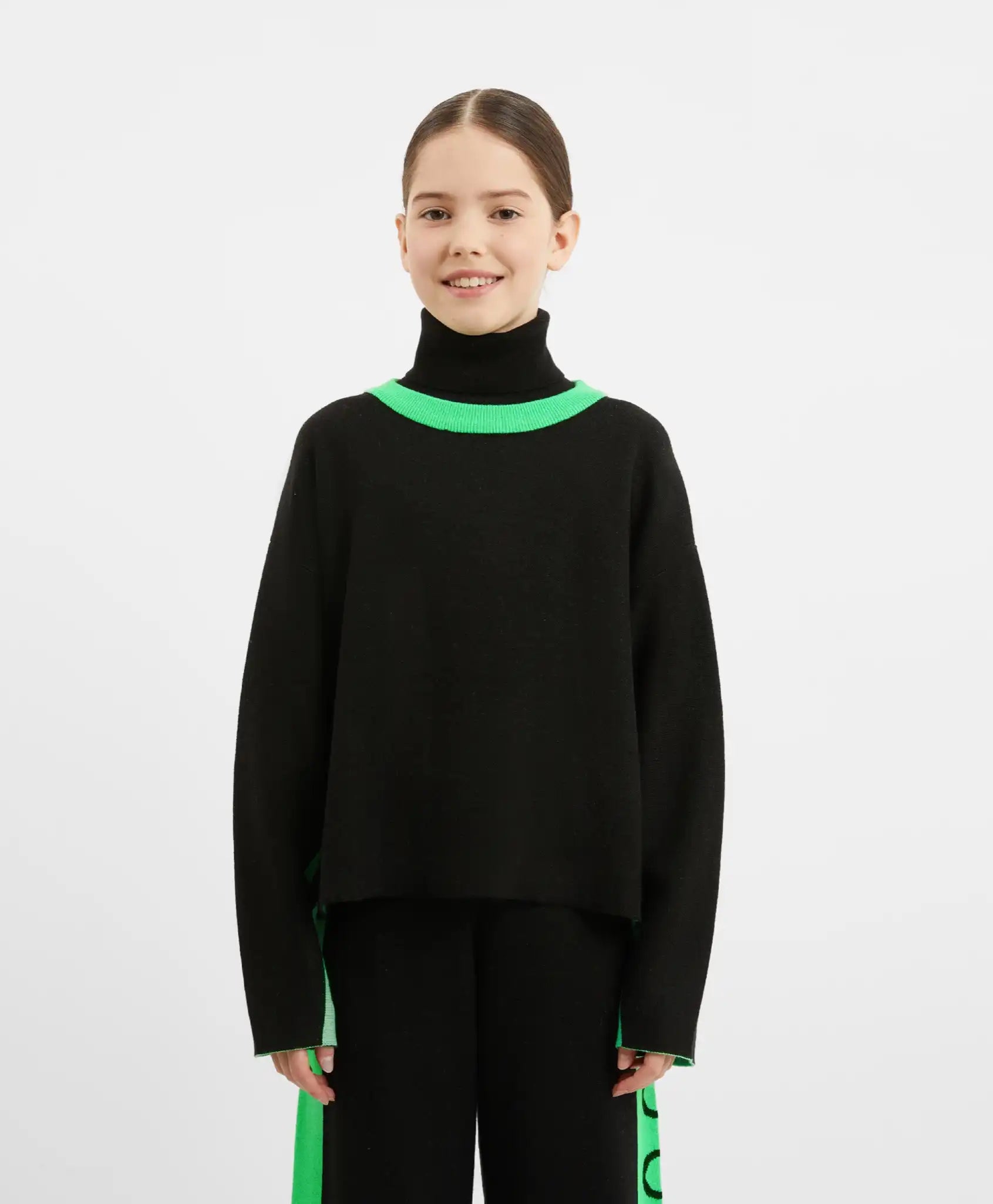Negru elegant combinat cu verde vibrant – un contrast proaspăt și nonconformist! Pulover polo cu croială lejeră și umeri lăsați, confecționat dintr-un fir moale, multicomponent, cu conținut de lână. Materialul oferă căldură și confort. Detaliile verde aprins de pe guler și mâneci adaugă un aer proaspăt modelului. Puloverul are mici tăieturi pe cusăturile laterale pentru o libertate maximă de mișcare. Va completa perfect o ținută călduroasă împreună cu pantalonii negri din același material 22409GJC3701.