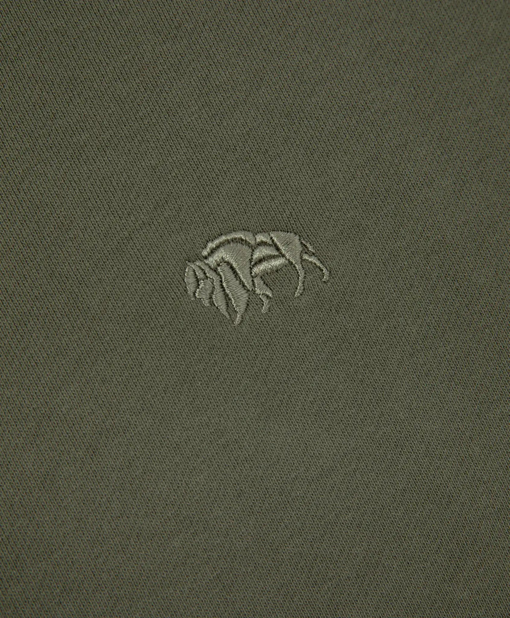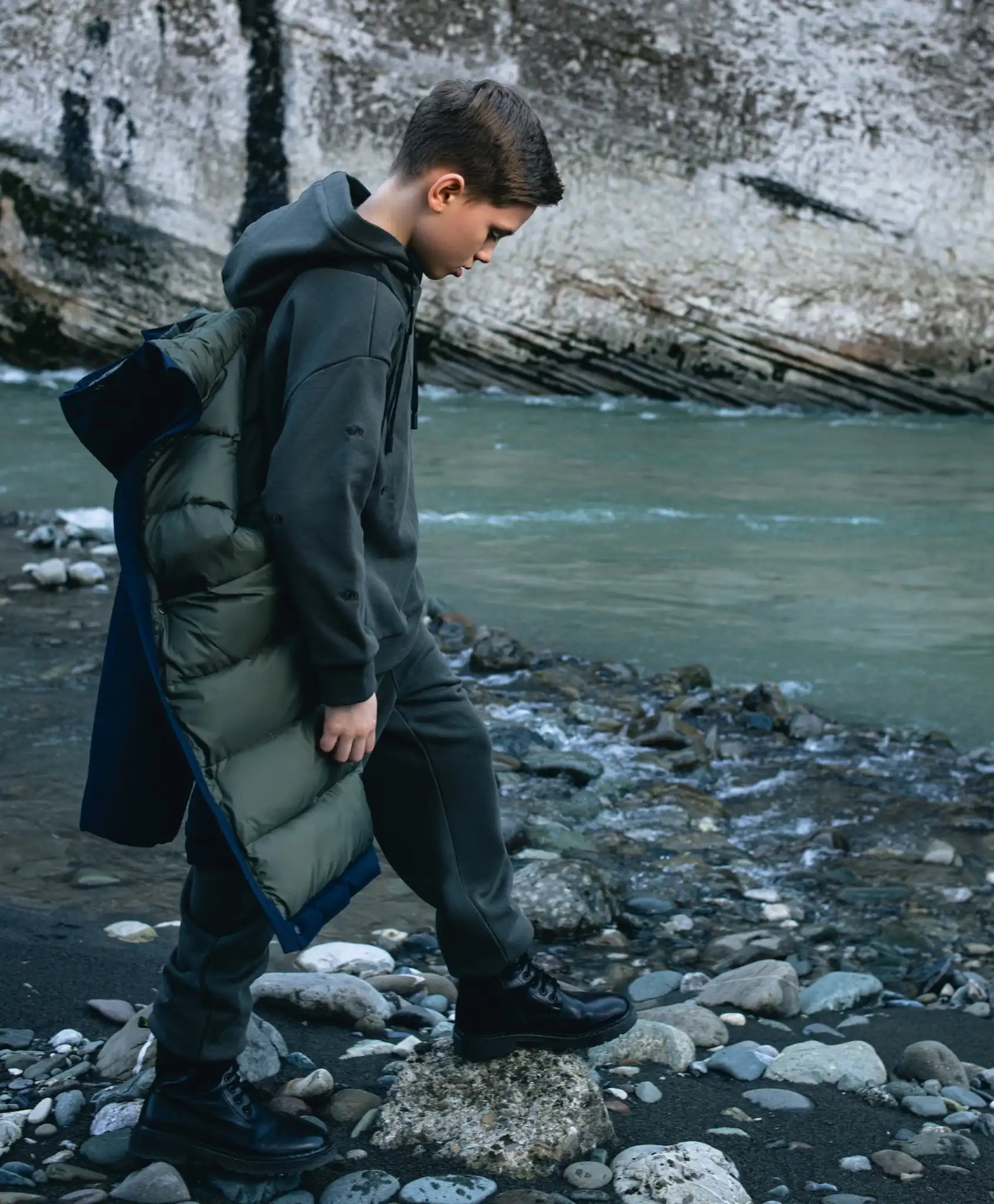 Hanoracul lejer în culoarea kaki îi va face pe băieți să se simtă mai aproape de natură! Este confecționat din French Terry respirabil, cu un conținut ridicat de bumbac. Materialul este plăcut la atingere, își păstrează forma și este ușor de întreținut. Gluga cu șnururi reglabile protejează împotriva vremii nefavorabile. Decorațiunea include mici broderii cu bizoni, care par discrete, dar în același timp originale. Hanoracul va completa un set în culoarea kaki alături de joggerii din tricot 22411BJC5603 din colecția „Bizon” și alte piese vestimentare.