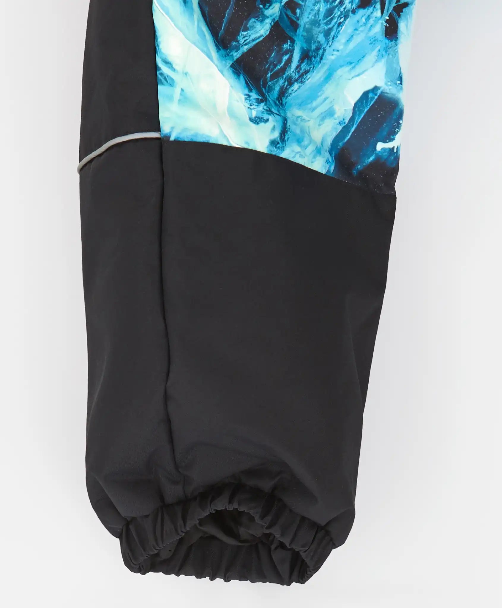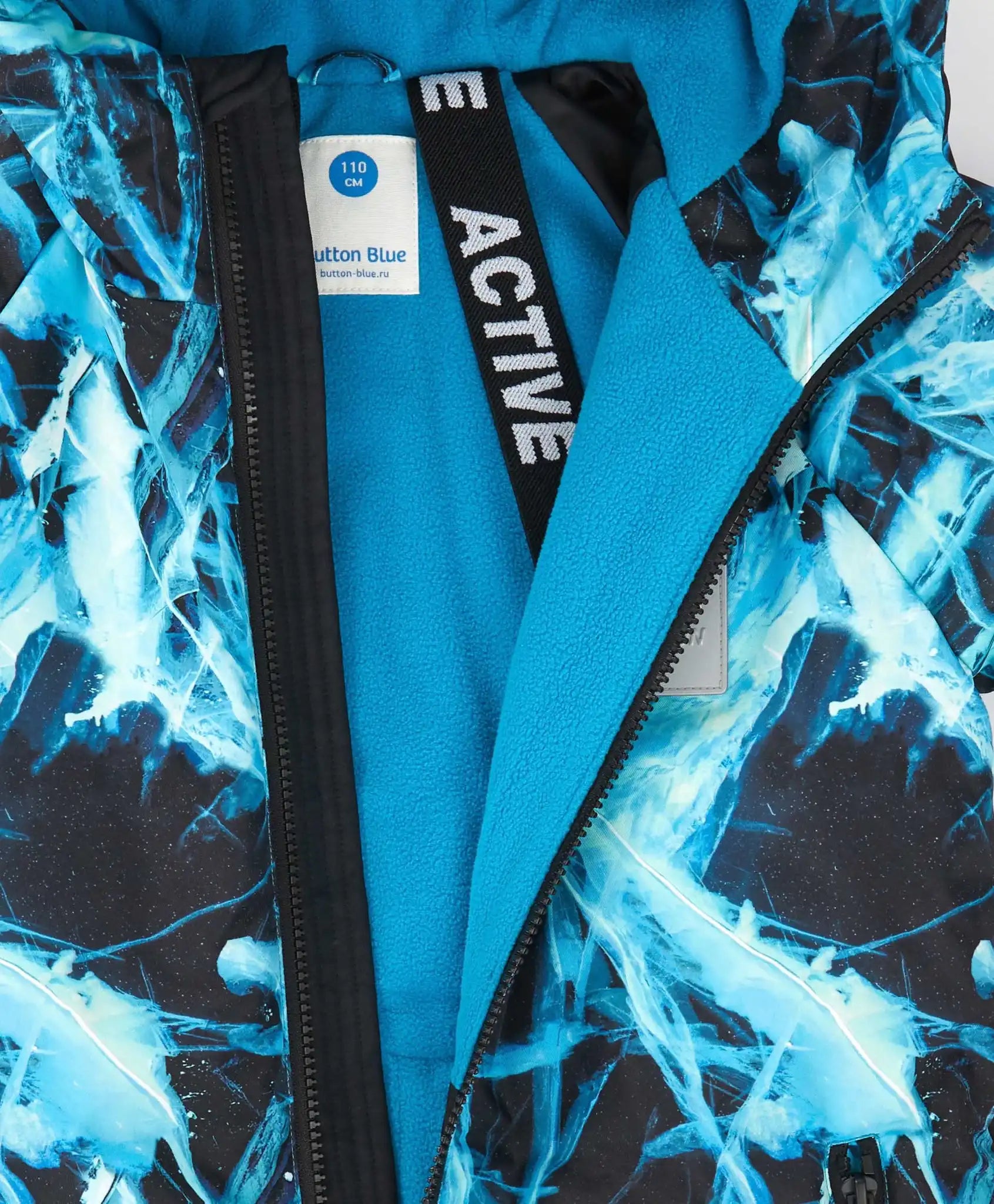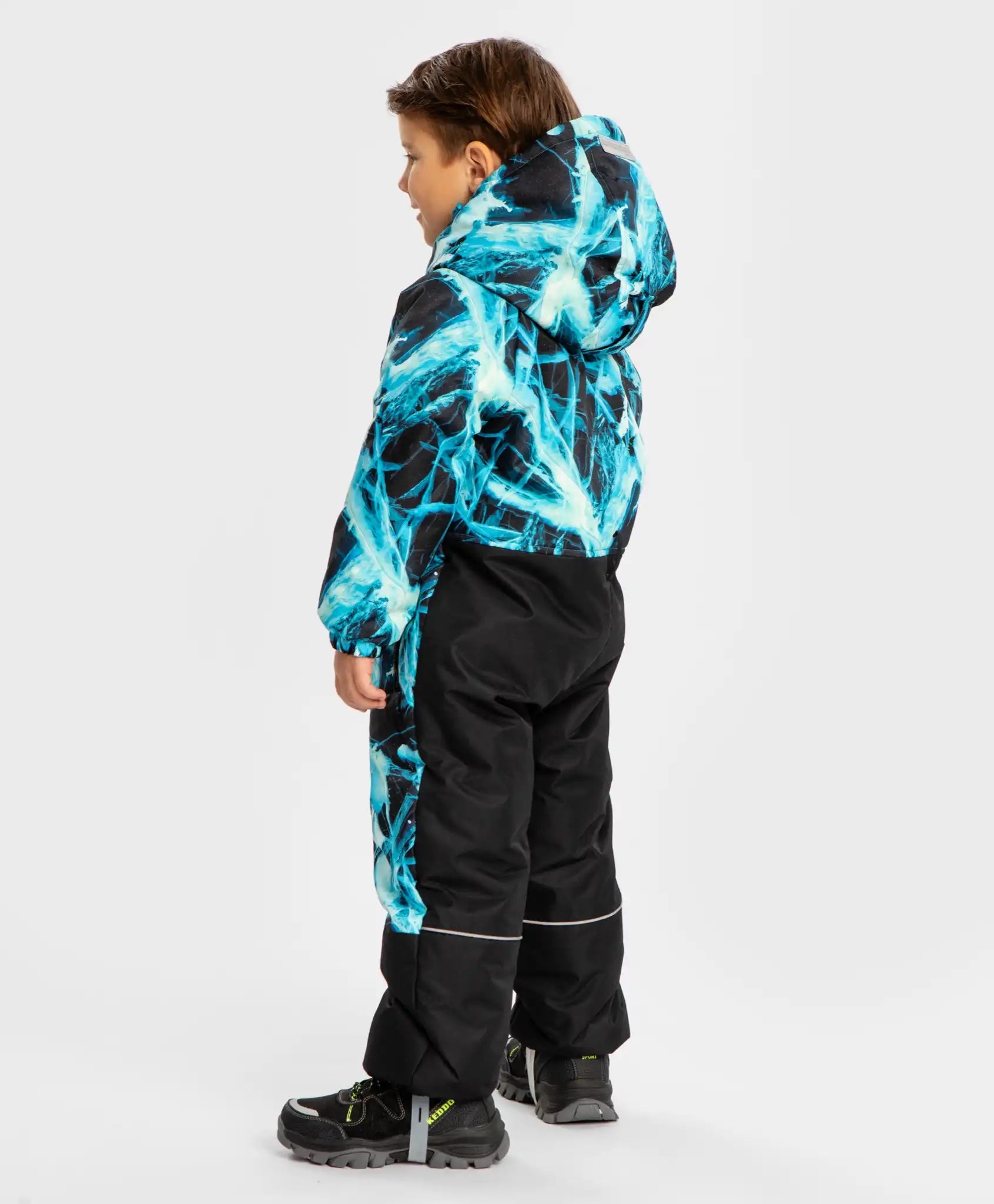 Salopeta de tranziție cu glugă și bretele integrate pentru băiat de la Button Blue este realizată cu un imprimeu pe fundal negru. Căptușeala este din fleece moale, delicat și călduros. Partea superioară a modelului din linia Active este confecționată dintr-o membrană dublă cu proprietăți hidrofuge. Această salopetă protejează împotriva ploii, vântului și zăpezii. Materialul poate rezista la o coloană de apă de până la 5000 mm și poate evacua până la 5000 g de apă pe zi de pe un corp fierbinte. Salopeta este destinată temperaturilor de până la -10 grade, dar, combinată cu lenjerie termică, este confortabilă și la temperaturi mai scăzute. Izolația este din sintepon Silk Touch cu o greutate de 100 g/m². Modelul are o glugă adâncă fixă cu căptușeală din fleece și șnururi elastice pentru ajustare. Se închide cu fermoar cu protecție pentru bărbie și clapetă interioară. Mânecile raglan au manșete elastice pentru a menține căldura, iar pantalonii sunt prevăzuți cu benzi elastice. De asemenea, dispune de curele din silicon pentru fixarea pe încălțăminte.