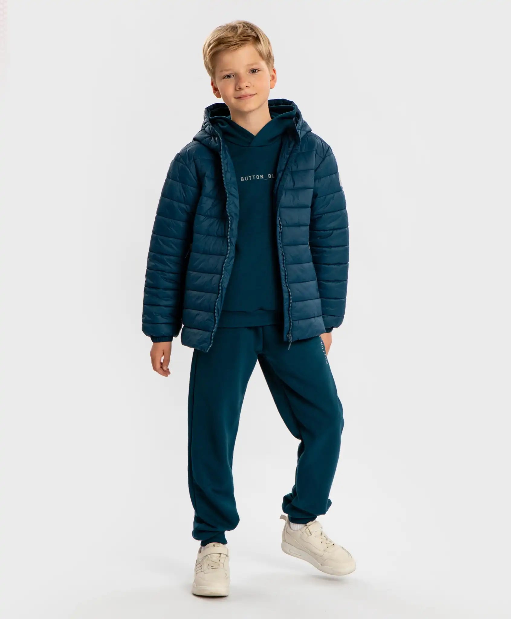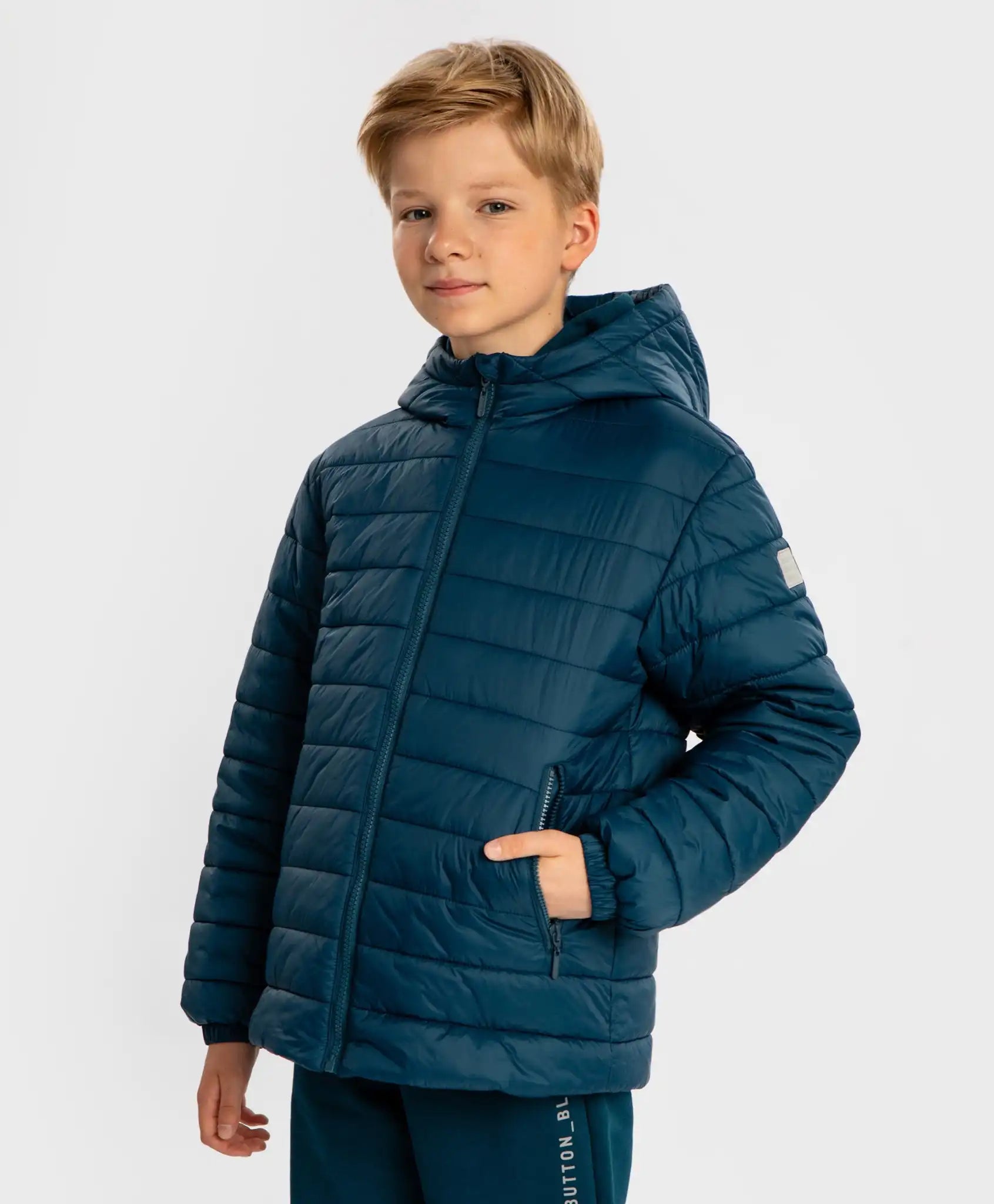 Geaca de tranziție capitonată pentru copii cu glugă de la Button Blue, în culoare albastru. Partea superioară este realizată dintr-un material cu proprietăți de respingere a apei, care protejează copilul de precipitații. Căptușeala este textilă, iar izolația este din sinteticul Silk touch cu greutate de 180 g/m². Geaca este destinată temperaturilor de până la 0 grade. Modelul are o glugă adâncă, nelipsită și se închide cu fermoar protejat pentru bărbie. Are un capot interior. Mânecile au mansete elastice care împiedică pătrunderea vântului. Geaca are, de asemenea, butoane pentru reglarea lățimii mânecilor. Partea interioară are un șnur cu fixatori pentru ajustarea taliei. Buzunarele cu fermoar pot păstra obiecte importante sau pot încălzi mâinile. Pe căptușeală este cusută o etichetă pe care să fie scris numele și numărul de telefon al copilului sau părinților. Geaca de bază este ușor de combinat. Are un element discret reflectorizant pentru siguranță. Un alt avantaj al acestui model este că este potrivit atât pentru băieți, cât și pentru fete. Urmați instrucțiunile de îngrijire de pe eticheta integrată.