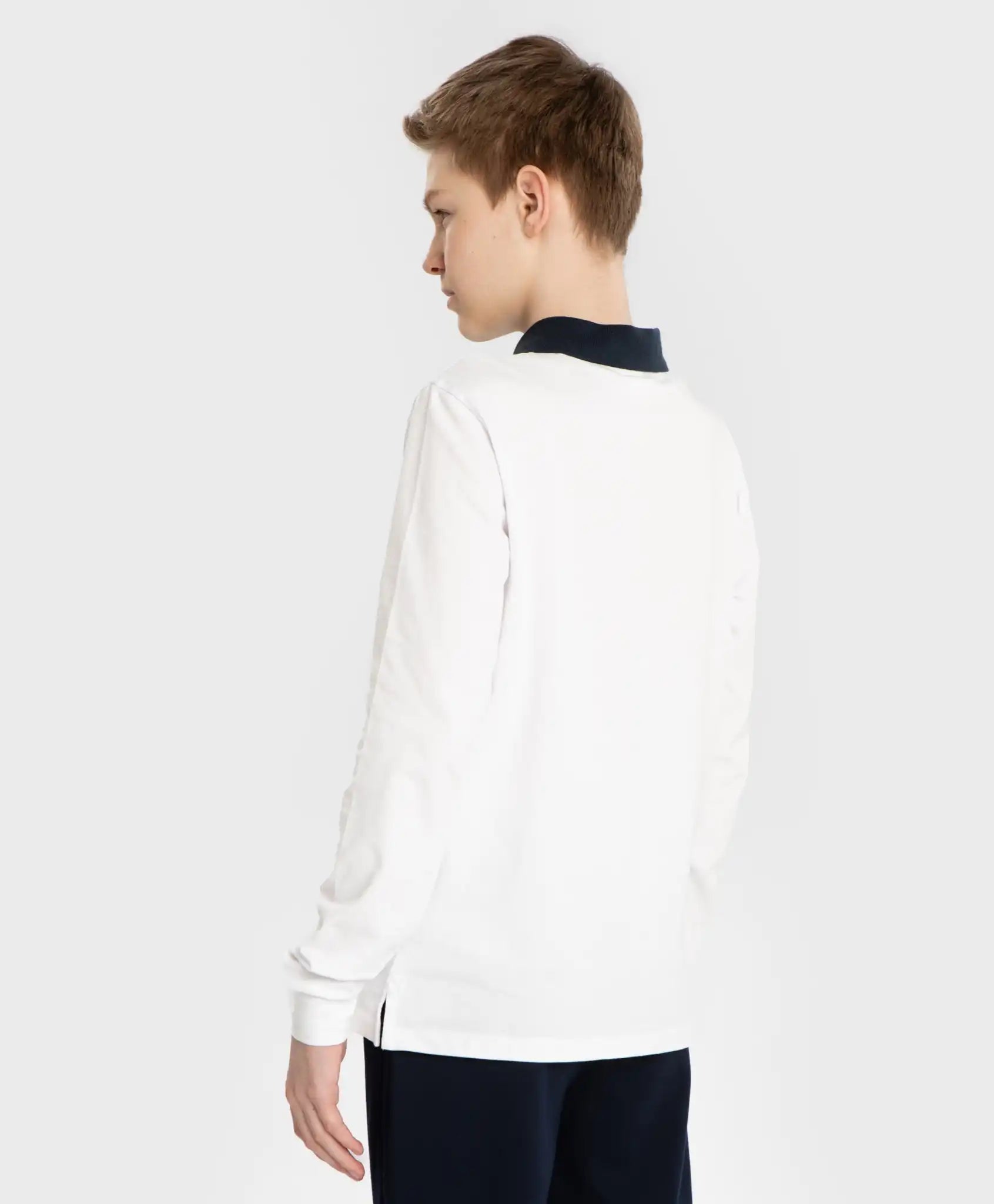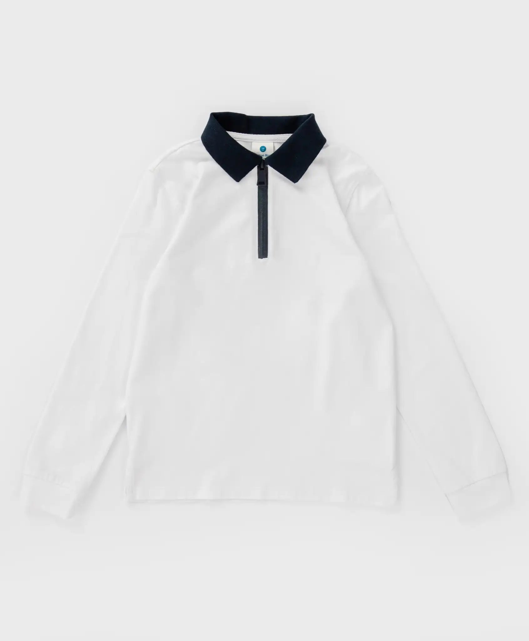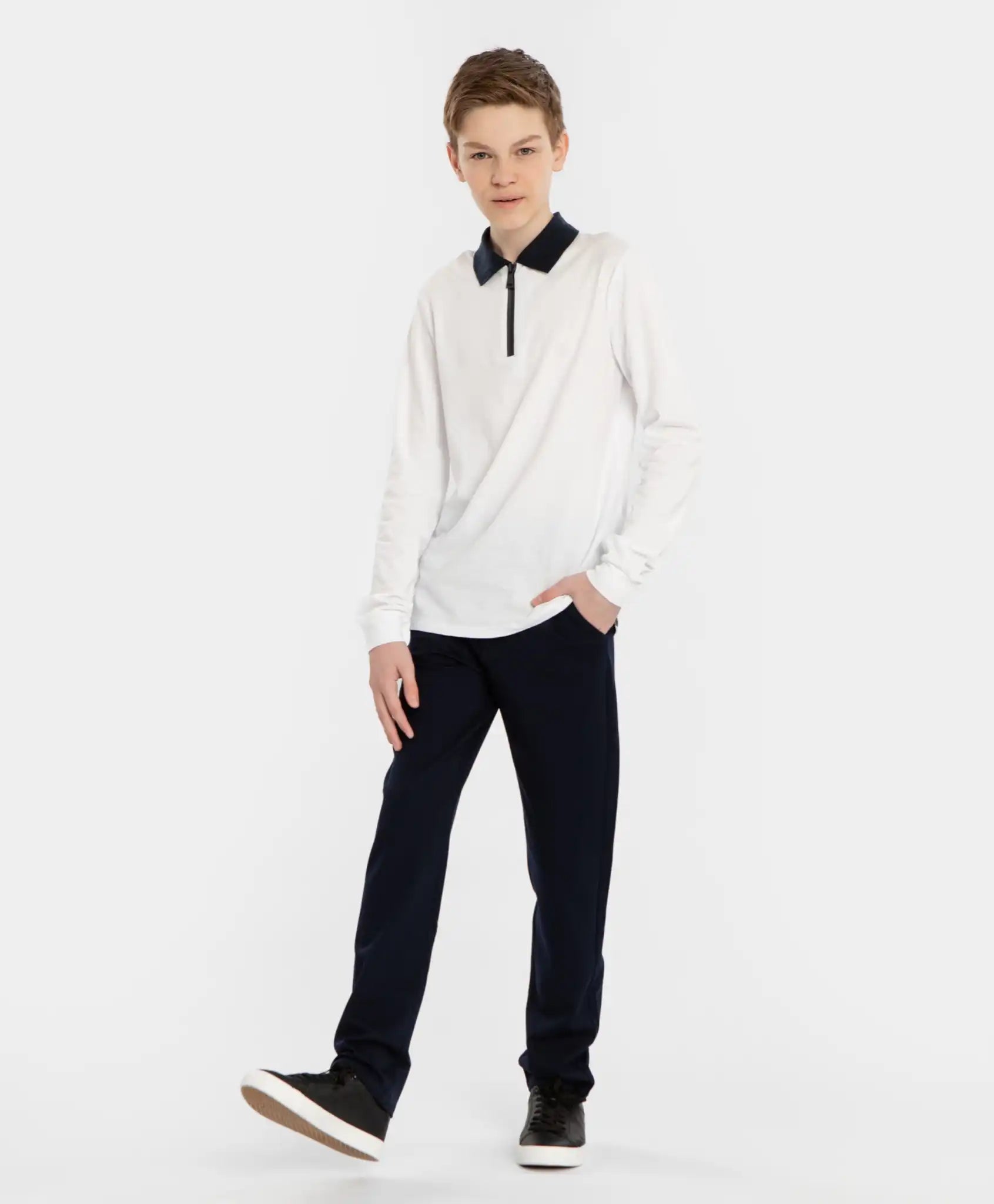 Tricou polo alb din tricot cu mânecă lungă pentru băiat. Unul dintre cele mai confortabile elemente ale uniformei școlare. Model tip lonsleeve cu guler, confecționat din bumbac cu adaos de elastan, ceea ce îl face foarte moale, respirabil, plăcut pe piele și elastic. Elevii se vor simți confortabil pe tot parcursul zilei. Gulerul albastru răsucit oferă tricoului un aspect elegant și permite purtarea zilnică, atât la școală, cât și la evenimente oficiale. Mânecile lungi cu manșete elastice asigură o potrivire confortabilă și delicată. O notă casual este adăugată de fermoarul contrastant din față, cusut în locul nasturilor obișnuiți ai polo-ului. Datorită acestuia, modelul este ușor de îmbrăcat și dezbrăcat fără efort. Despicăturile laterale oferă libertate de mișcare, la fel ca și croiala dreaptă. Acest tricou polo cu guler este potrivit atât pentru școală, cât și pentru plimbări cu prietenii. Combină tot ceea ce apreciază copiii moderni – stil și confort. Urmați instrucțiunile de îngrijire de pe eticheta interioară.
