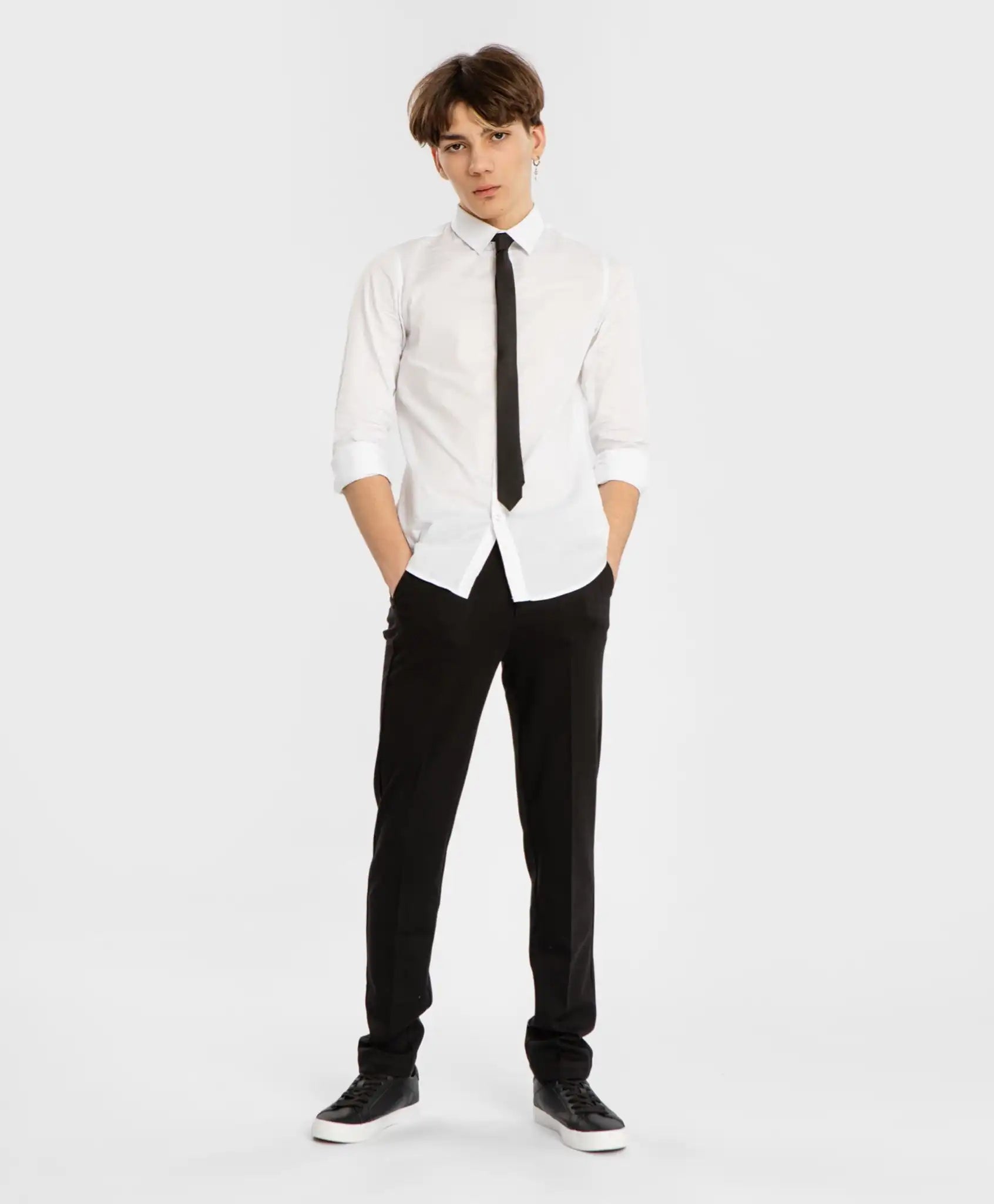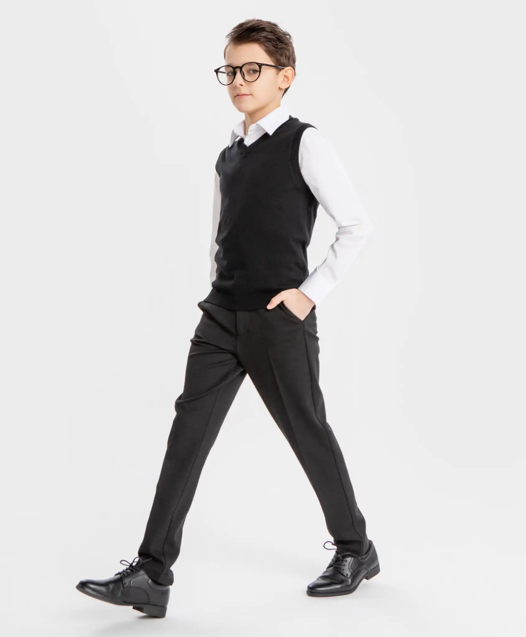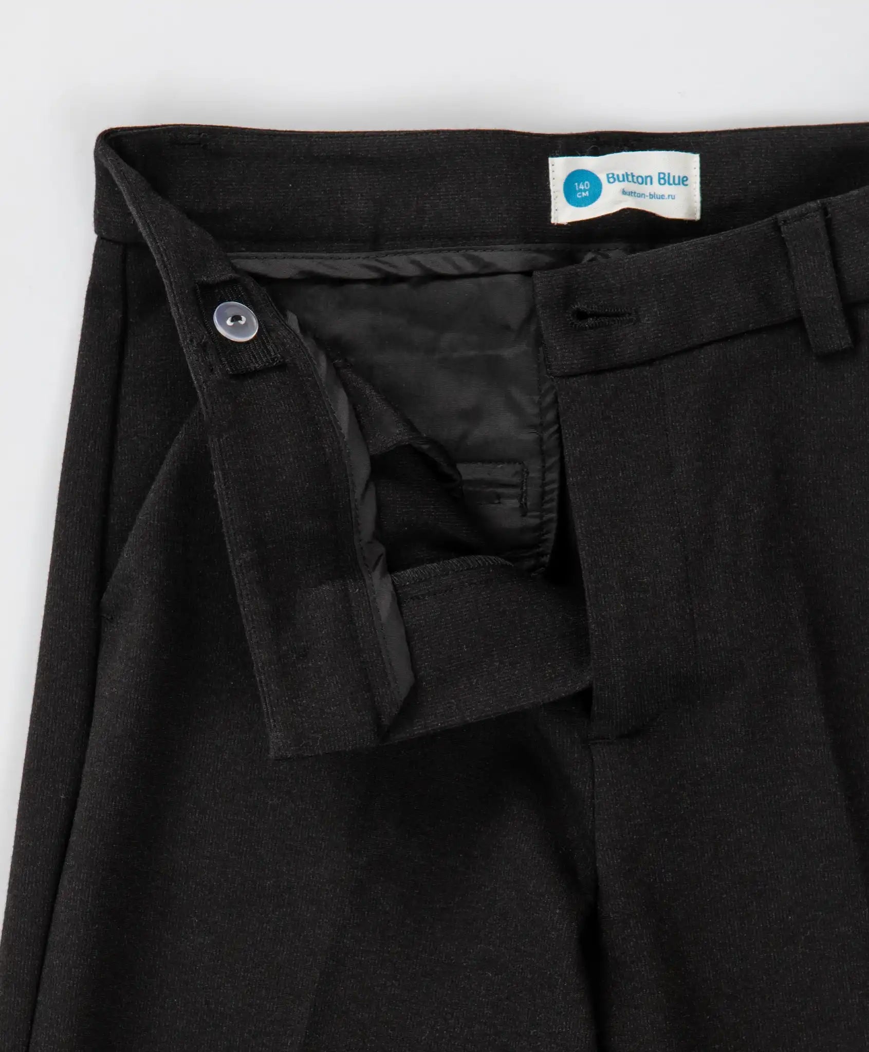 Pantaloni școlari negri cu dungă pentru băieți. Sunt confecționați din viscoză cu adaos de poliester și elastan, ceea ce îi face foarte ușori, moi, netezi și plăcuți la atingere, dar în același timp rezistenți și elastici. Copilul se va simți confortabil întreaga zi. Elasticitatea asigură o potrivire ideală, la fel ca și elasticul reglabil cu nasture ascuns pe interiorul taliei. Acesta ajută la ajustarea dimensiunii în funcție de siluetă. Dacă este necesar, se poate adăuga o curea – există găici pentru aceasta. Pantalonii se închid cu fermoar și nasture. Pe laterale sunt buzunare căptușite, iar în spate – încă două buzunare tăiate. Aspectul elegant este completat de dungile cusute. Talie medie, croială clasică. Acești pantaloni de la Button Blue sunt perfecți pentru școală, aniversări sau orice eveniment festiv. Datorită culorii negre universale, se combină ușor cu uniforme școlare și haine casual de orice culoare. Urmați instrucțiunile de îngrijire indicate pe eticheta interioară.