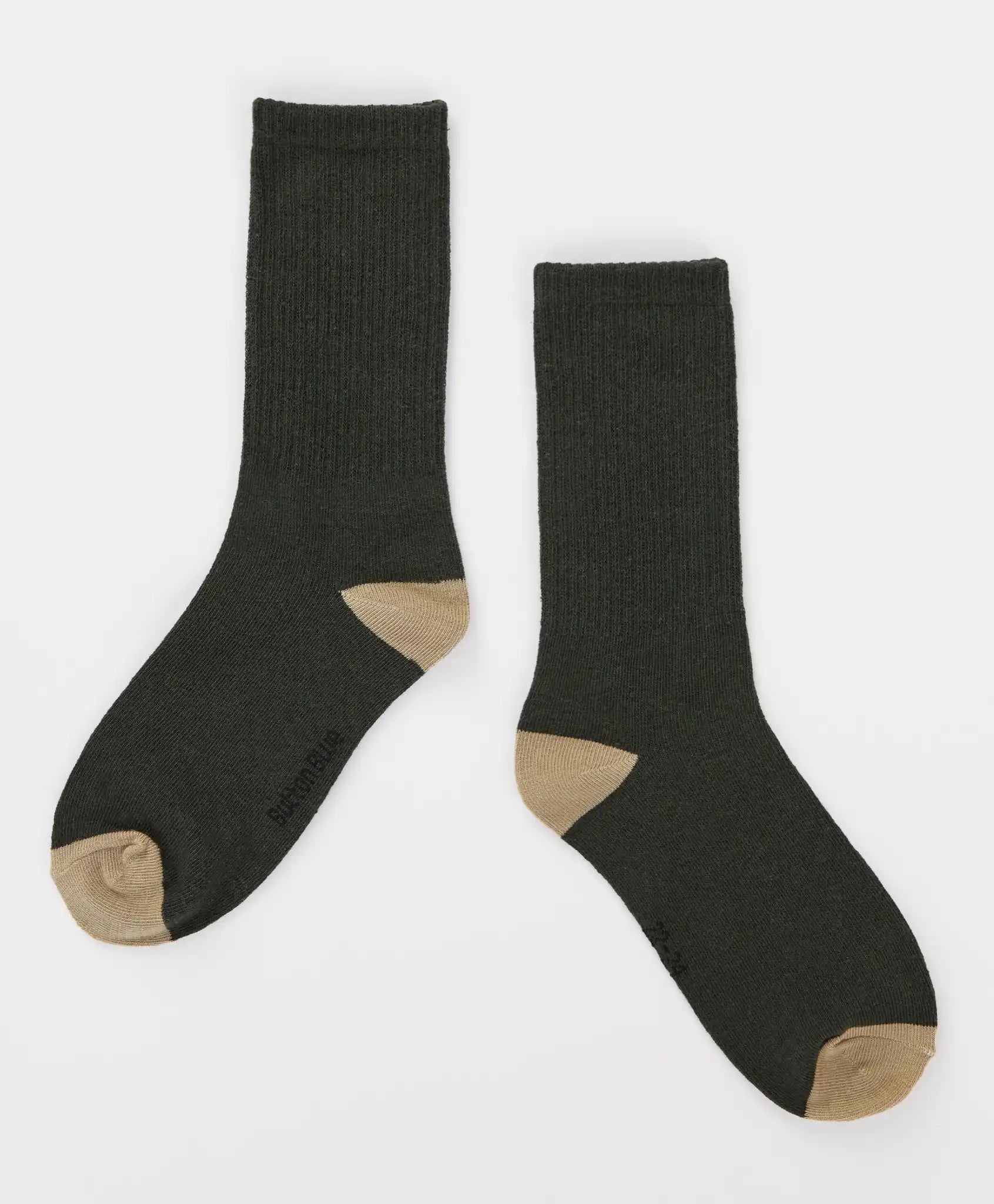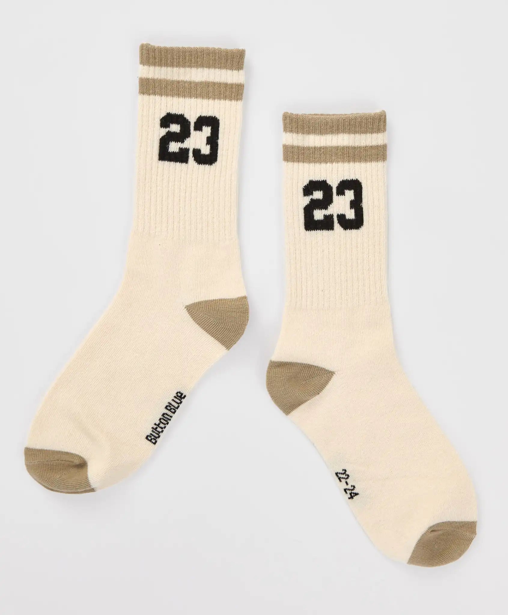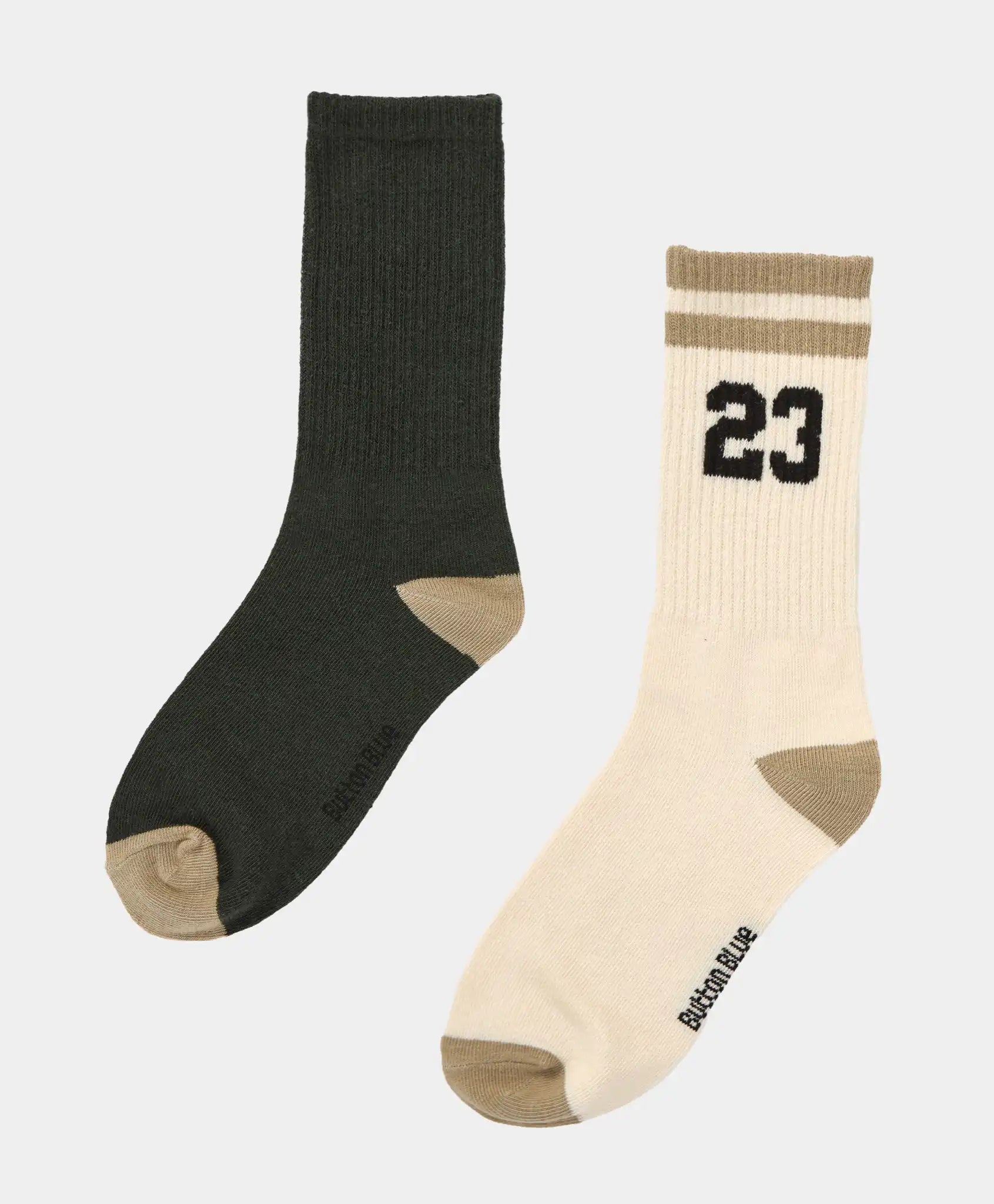 Set de două perechi de șosete lungi pentru băieți de la Button Blue. Șosetele sunt confecționate din bumbac cu adăugare de poliamidă și elastan. Această combinație oferă o elasticitate bună, durabilitate, finețe și respirabilitate, permițând picioarelor să respire. Benzile elastice rib se mulează delicat, dar ferm pe picior, prevenind alunecarea. O pereche este verde închis, iar cealaltă – alb lăptos cu imprimeu. Ambele perechi au călcâiul și vârful gri. Urmați recomandările de îngrijire indicate pe eticheta interioară.