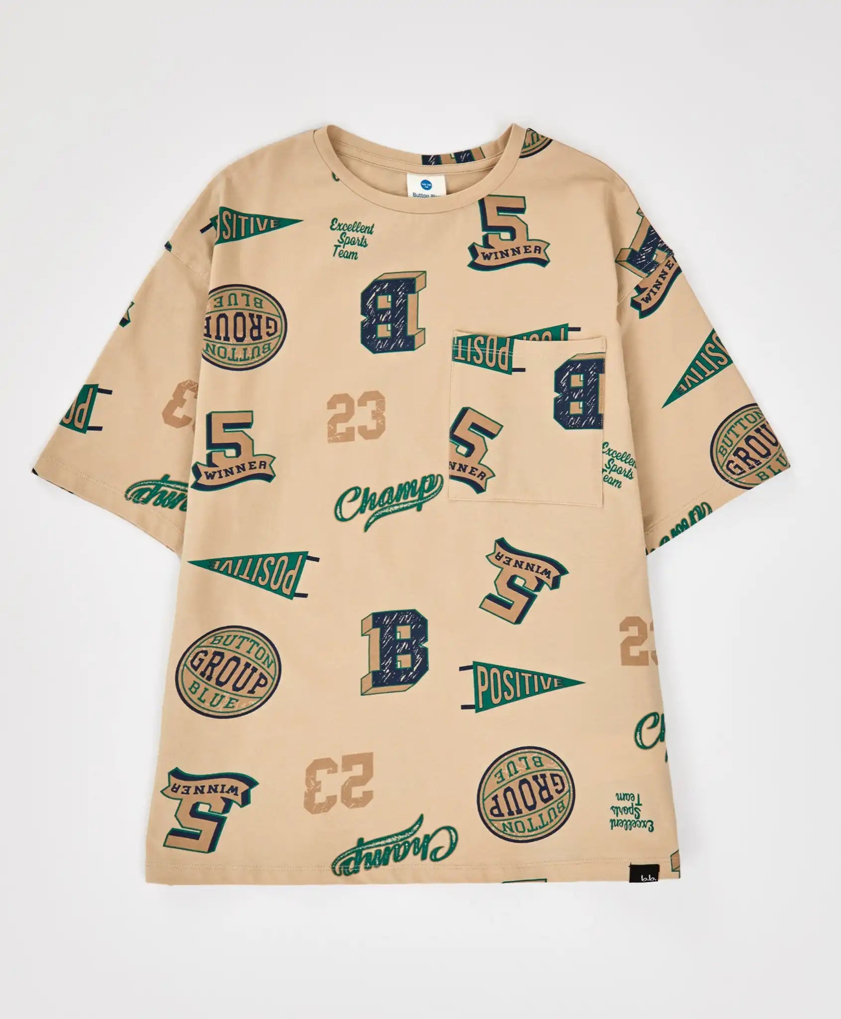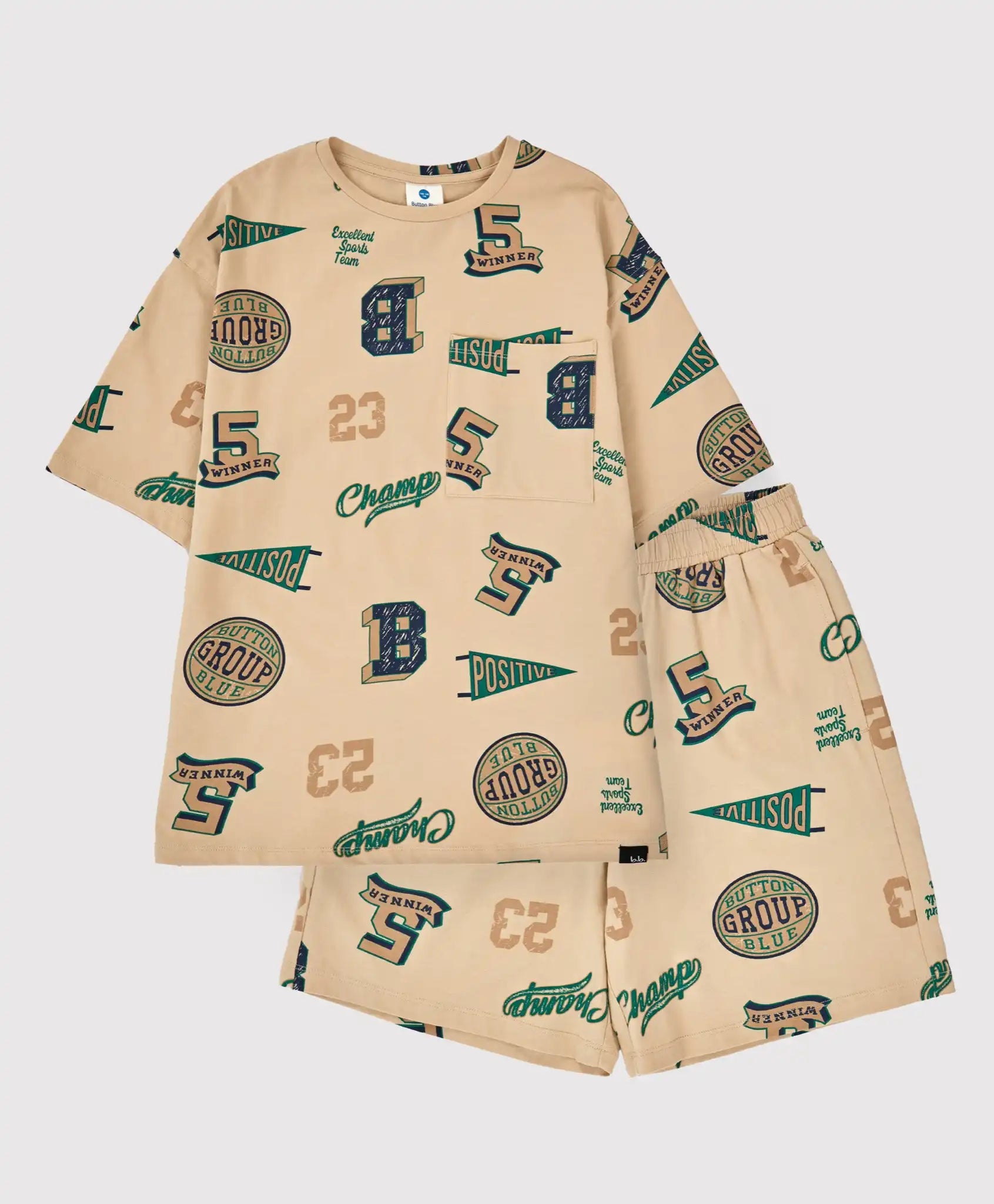 Pijama cu tricou cu mânecă scurtă și pantaloni scurți, bej, cu imprimeu, pentru băieți. Setul de casă de la Button Blue este confecționat din cel mai fin tricot de bumbac (interlock), care este moale și confortabil la purtare, ușor de întreținut și permite pielii să respire. Materialul este subțire, dar opac. Tricoul are decolteu rotund și croială lejeră, cu linia umerilor coborâtă. Dispune de un buzunar frontal fără clapetă. Pantalonii scurți au talie elastică și două buzunare, având o lungime deasupra genunchilor. Pijamaua este realizată într-un design unitar, de culoare bej, cu imprimeu pe toată suprafața. Potrivită pentru activități zilnice acasă sau pentru somn. Urmați instrucțiunile de îngrijire indicate pe etichetă.