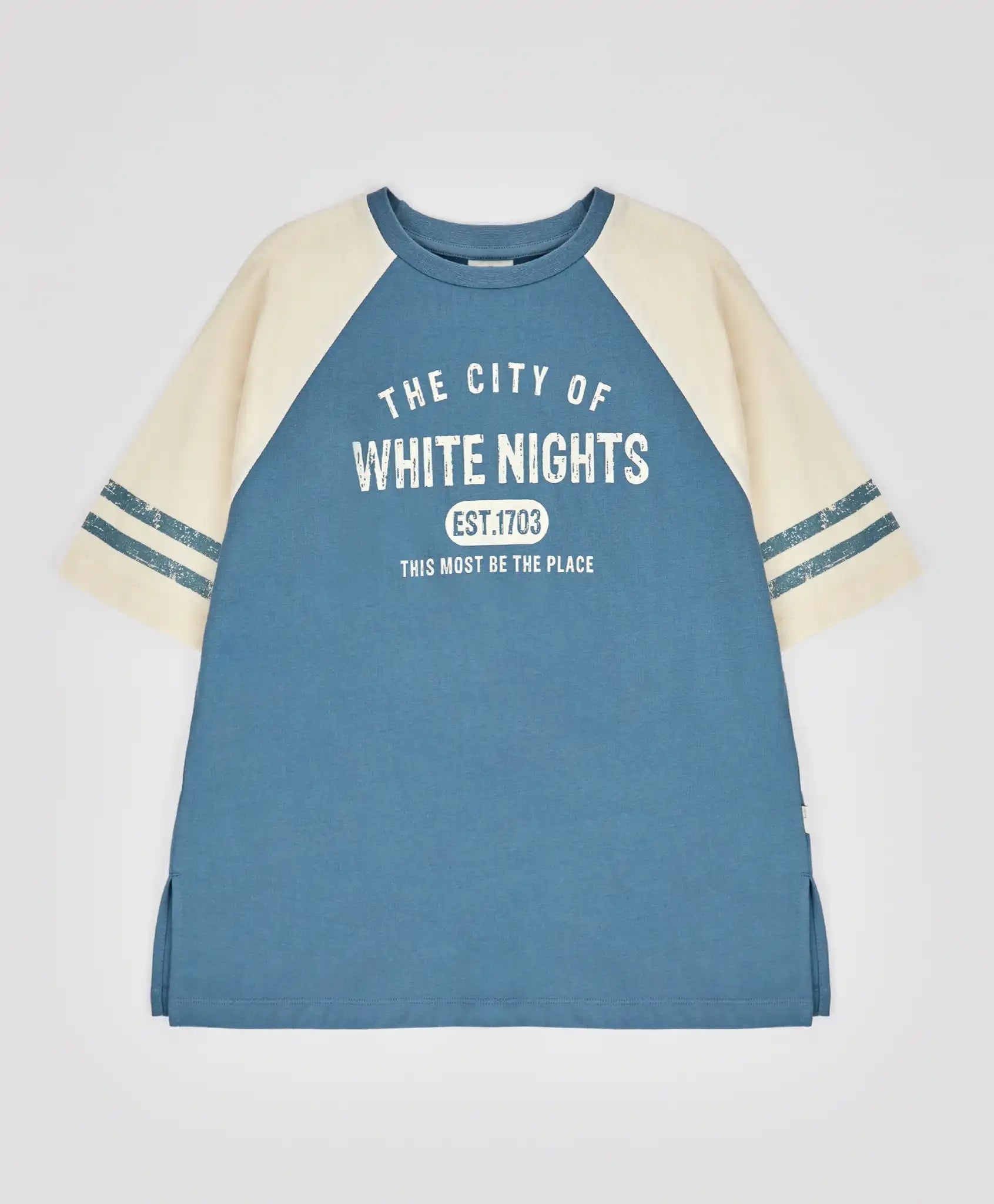 Tricoul voluminos cu mânecă scurtă și imprimeu pentru fete combină albastrul și nuanțele de alb lăptos. Modelul de la Button Blue este confecționat din tricot fin din bumbac, fiind moale, ușor de întreținut, respirabil și elastic. Materialul este dens și nu este transparent. Linia umerilor lăsată, tăieturile laterale și volumul lejer îl fac extrem de confortabil pentru orice siluetă. Este ideal pentru copiii activi, oferind libertate de mișcare. Decolteul clasic rotund facilitează îmbrăcarea și dezbrăcarea. Pe față, tricoul este decorat cu un imprimeu tipografic minimalist. Respectați instrucțiunile de îngrijire indicate pe eticheta produsului.