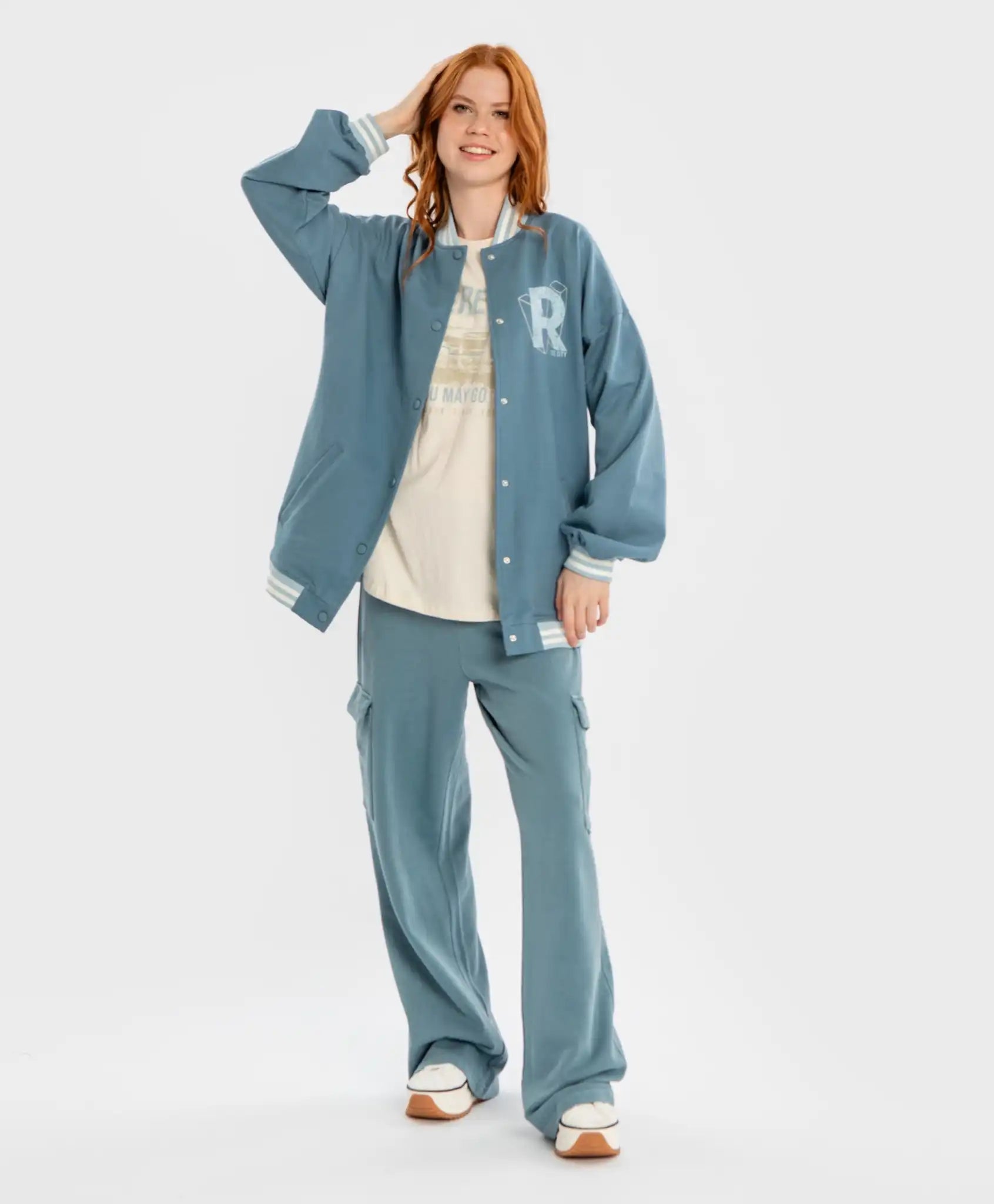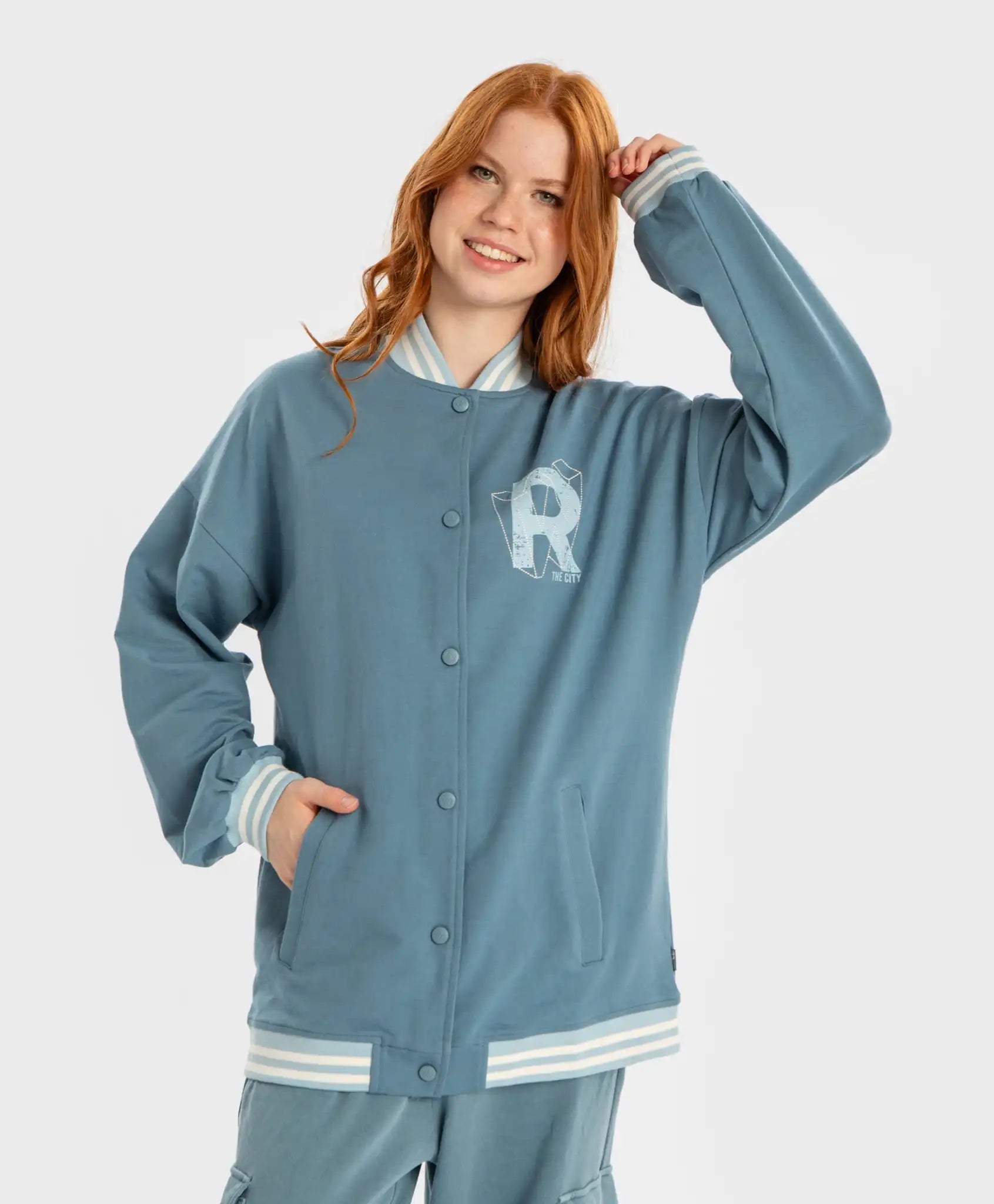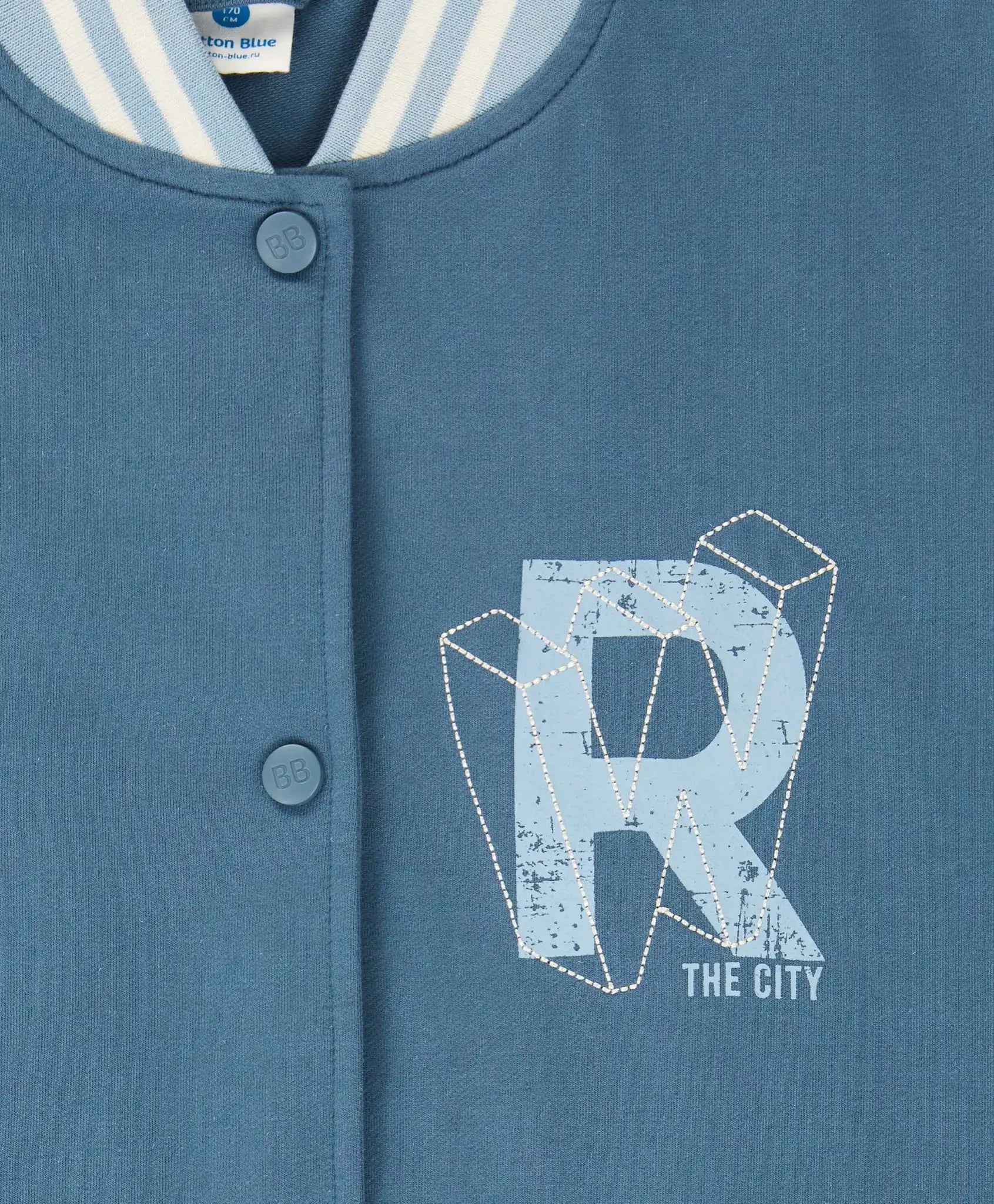 Bomberul pentru copii cu nasturi, în albastru, de la Button Blue, este confecționat din French Terry buclat. Datorită conținutului ridicat de bumbac, modelul este moale și respirabil, iar elastanul îi conferă elasticitate. Se închide cu nasturi, ceea ce îl face foarte comod pentru îmbrăcare rapidă. Decolteul, partea inferioară și manșetele sunt finisate cu material ripsat în dungi. Are două buzunare potrivite pentru mâini sau pentru depozitarea obiectelor mici. Bomberul este într-o culoare calmă și discretă, ușor de combinat cu alte piese vestimentare. Elementul decorativ este un imprimeu tipografic pe partea din față. Bomberul este excelent atât pentru ținute sportive, cât și pentru outfituri casual. Urmați instrucțiunile de îngrijire de pe etichetă.