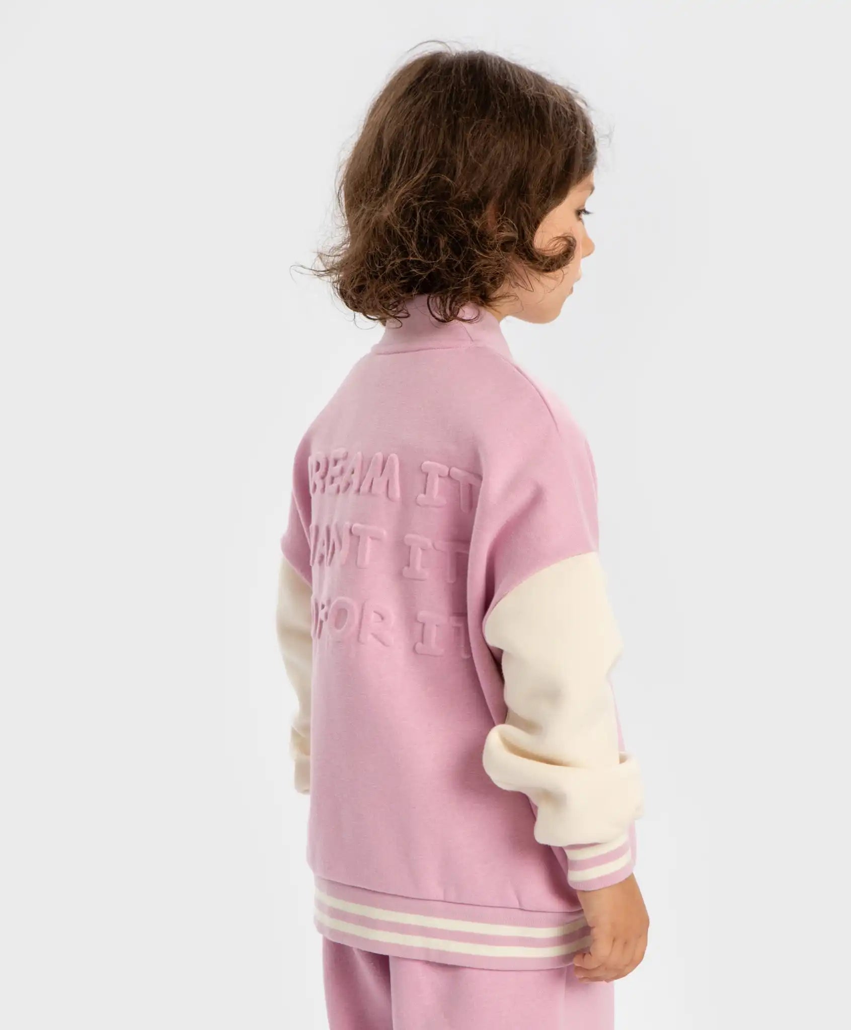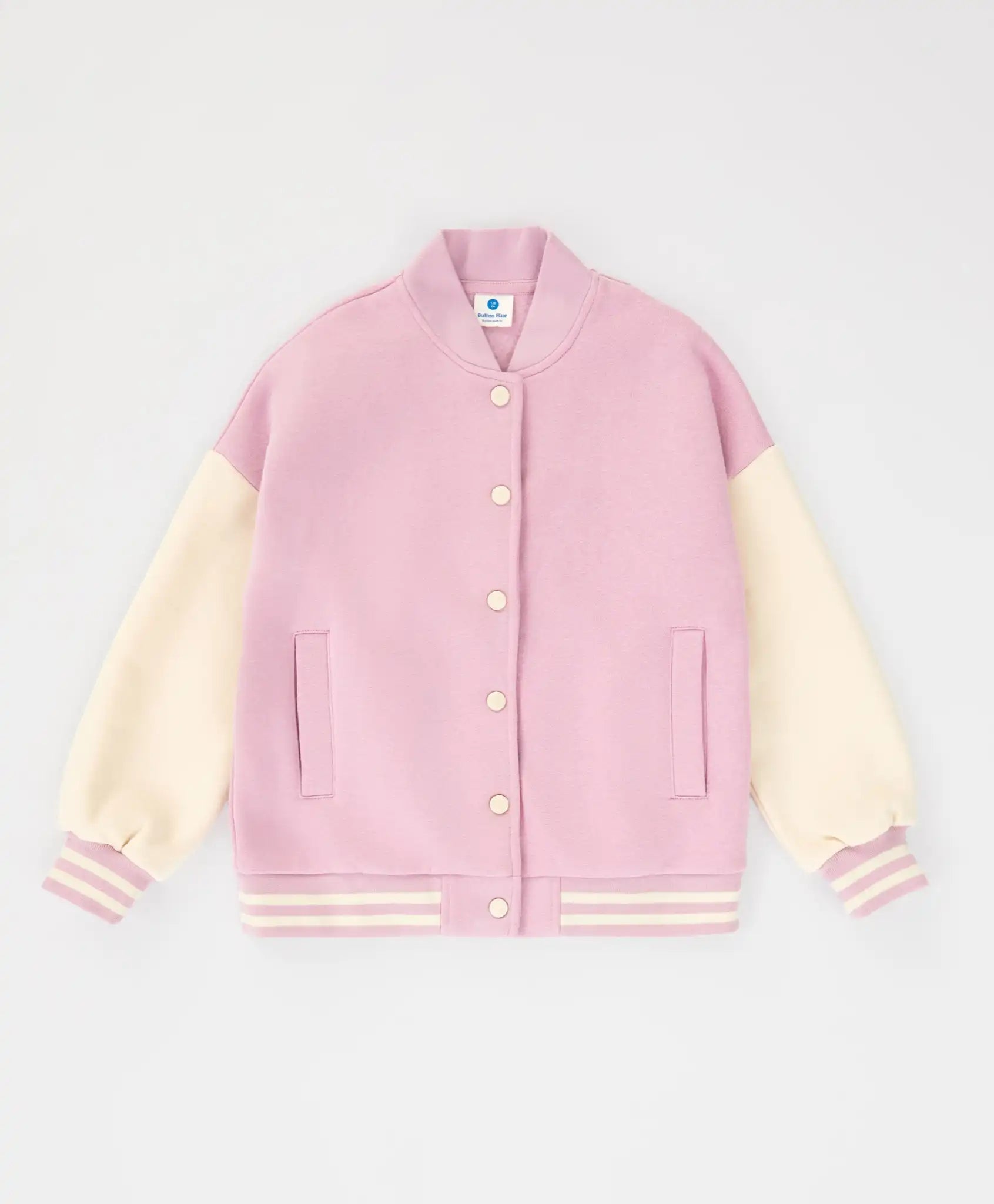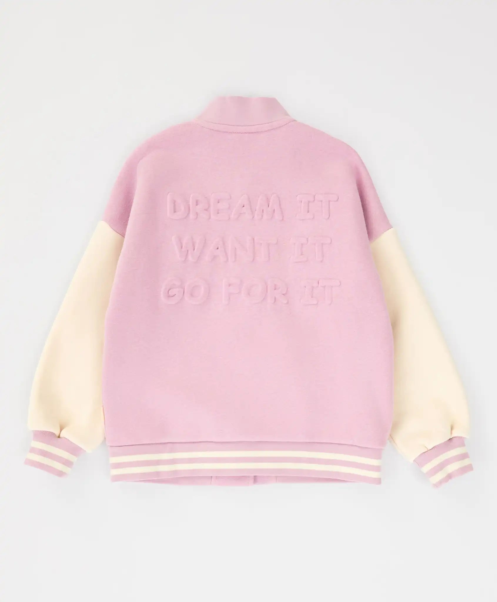 Bomberul roz cu căptușeală pentru fată de la Button Blue, cu închidere cu nasturi, este confecționat din French Terry cu interior moale, ceea ce îl face plăcut la atingere și călduros. Datorită conținutului ridicat de bumbac, modelul este moale și respirabil, iar elastanul îi adaugă elasticitate. Închiderea cu nasturi este foarte practică pentru îmbrăcare și dezbrăcare rapidă. Decolteul, partea inferioară și manșetele sunt finisate cu material ripsat elastic în dungi. Are două buzunare pentru mâini sau obiecte importante. Bomberul este într-o nuanță roz zaharisită, iar mânecile și nasturii sunt într-o nuanță delicată de lapte, ceea ce oferă un contrast interesant piesei vestimentare. Spatele este decorat cu un imprimeu tipografic reliefat. Bomberul este perfect atât pentru ținute sportive, cât și pentru outfituri de zi cu zi. Urmați recomandările de îngrijire indicate pe eticheta internă.