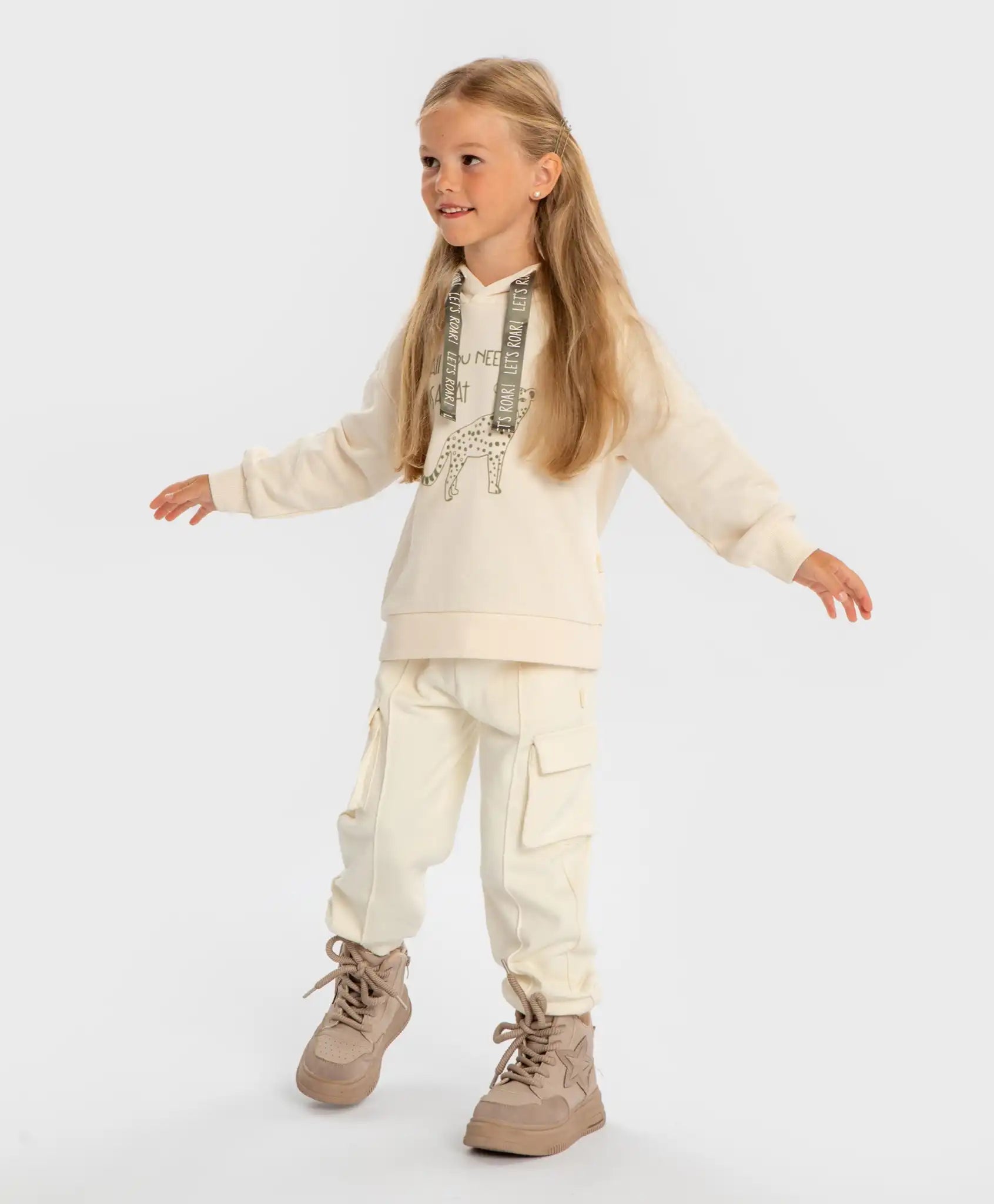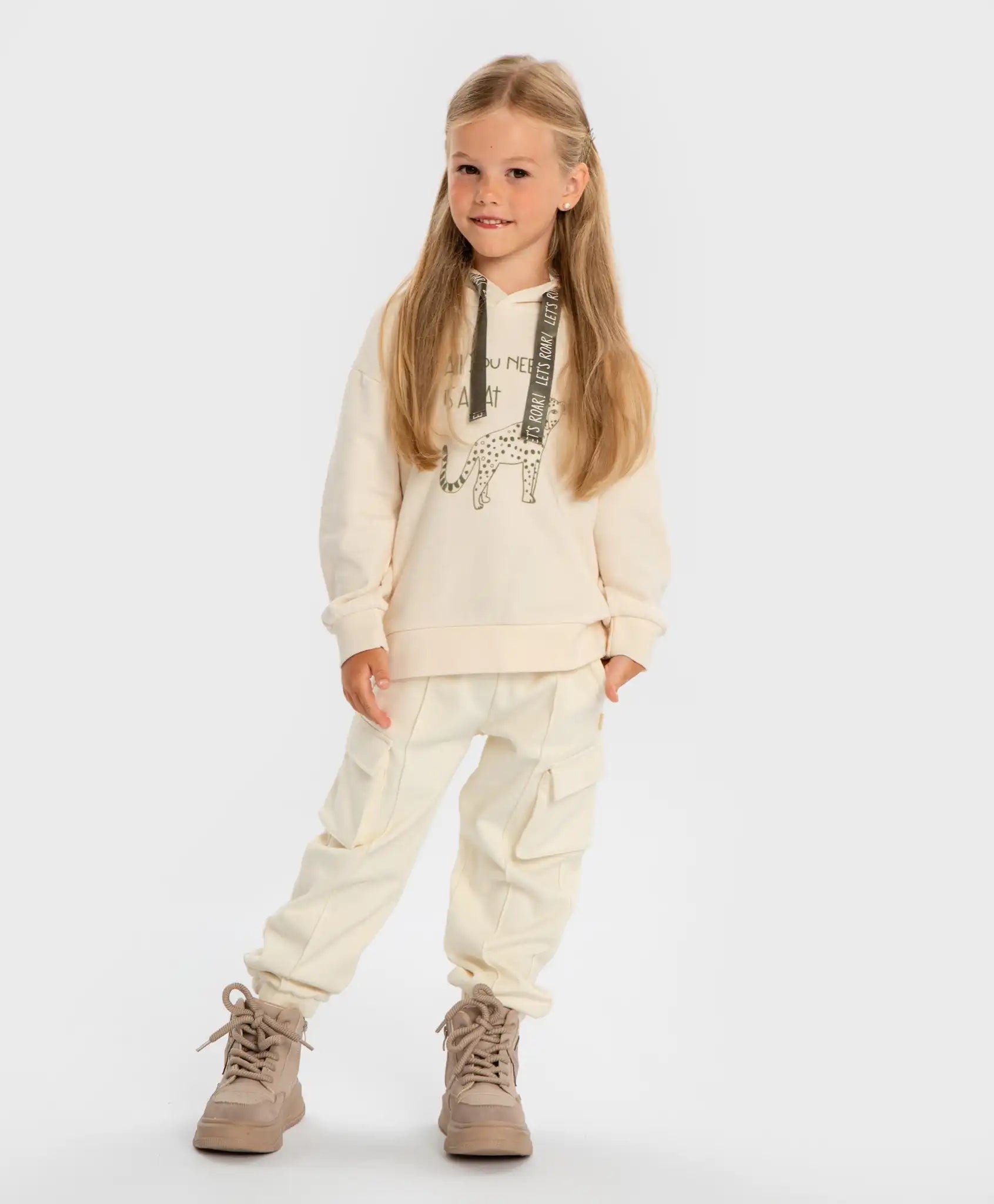 Pantaloni cargo cu patru buzunare și talie elastică pentru fete vor adăuga prospețime și delicatețe garderobei. Culoarea, asemănătoare unei nuanțe de bezea sau unt, este în tendințele sezonului. Modelul este confecționat din fleece fără vată, ceea ce îi face moi, netezi la atingere și ușor de întreținut. Joggerii de la Button Blue sunt ușor de îmbrăcat și de dat jos, fixându-se bine pe talie datorită elasticului cu șnururi satinate contrastante. Sunt potriviți pentru fete cu orice conformație. Pantalonii nu sunt mulați, oferind libertate de mișcare. Elasticul din partea inferioară a cracilor asigură o fixare moale, dar stabilă în jurul gleznelor. Pantalonii au patru buzunare – două laterale și două cu clapetă. Designul monocrom permite combinarea ușoară cu alte culori. Elementele decorative includ cusături exterioare pe mijlocul cracilor. Urmați instrucțiunile de îngrijire indicate pe etichetă.