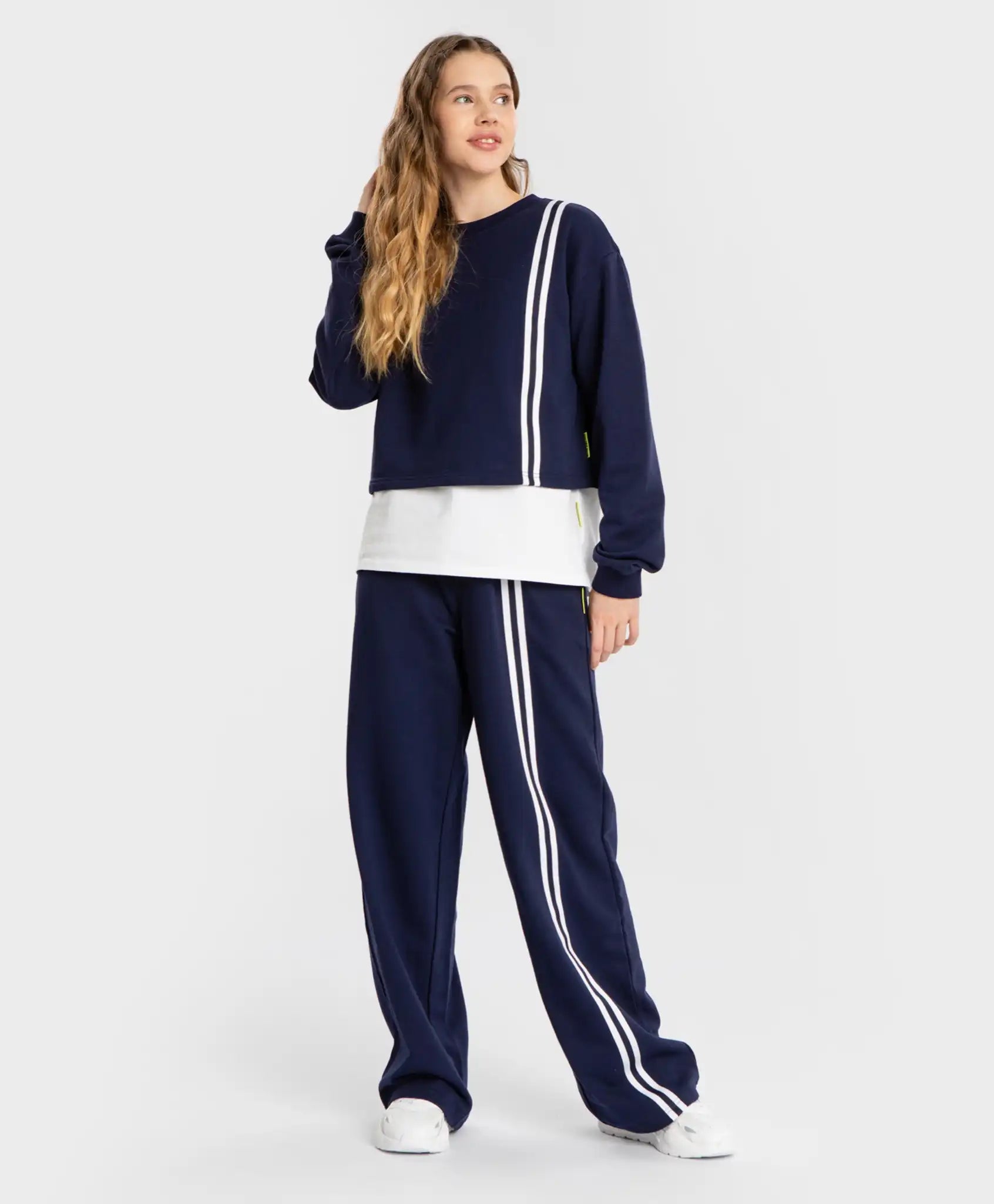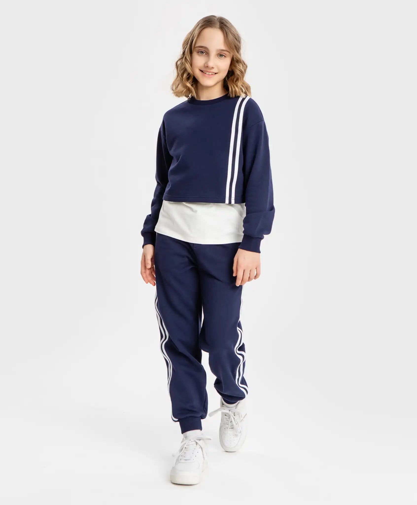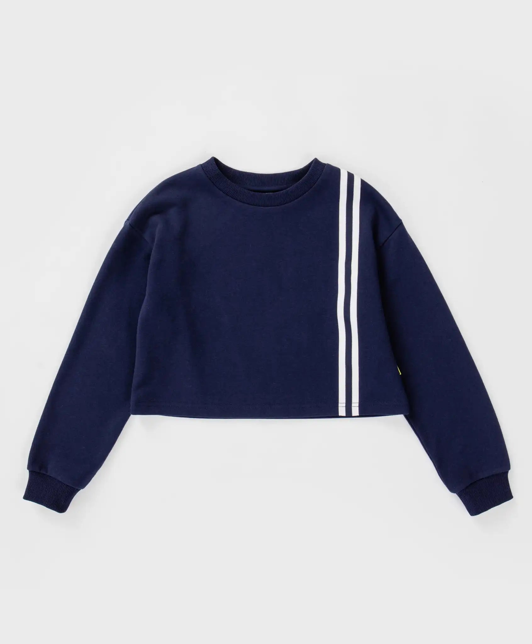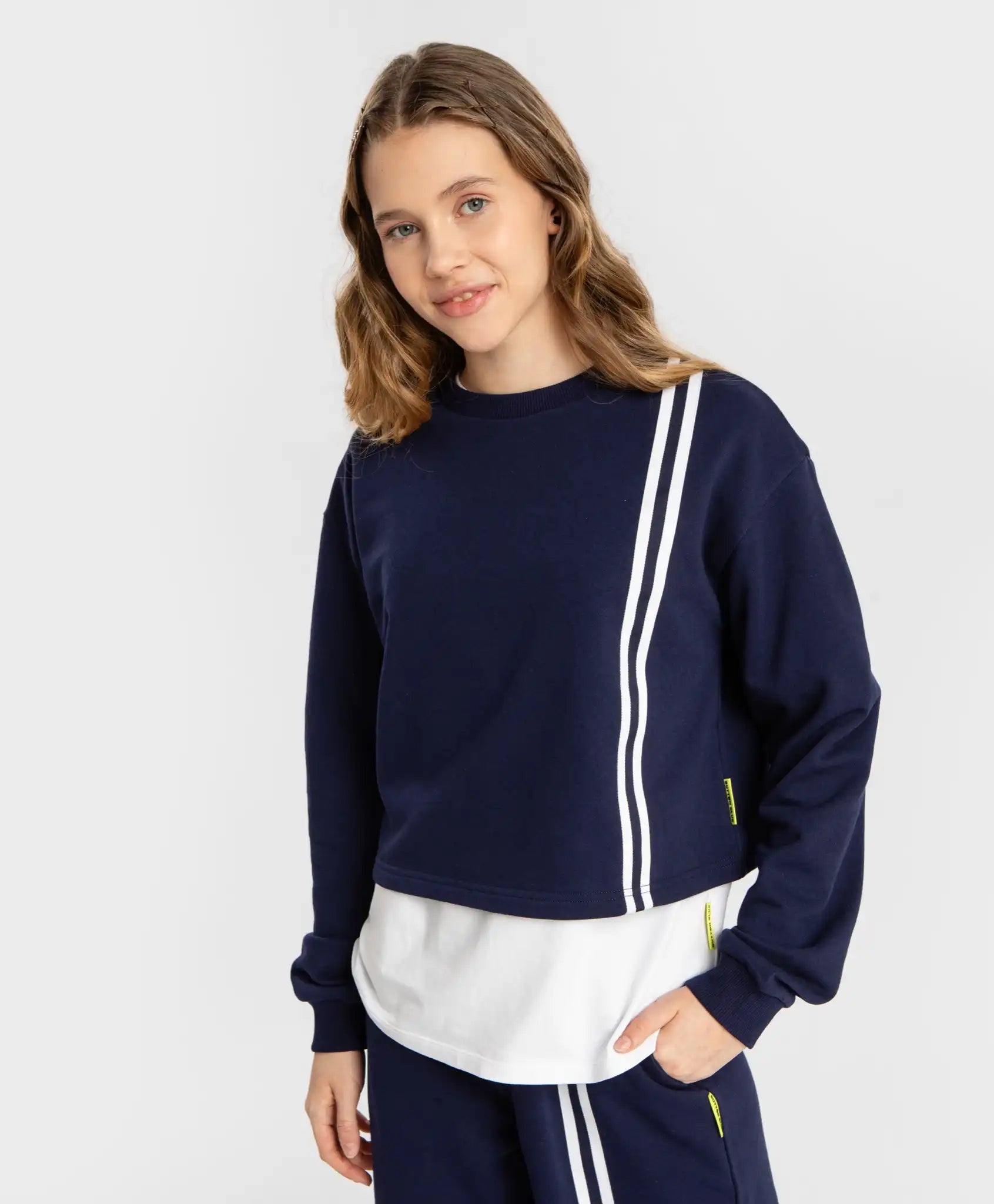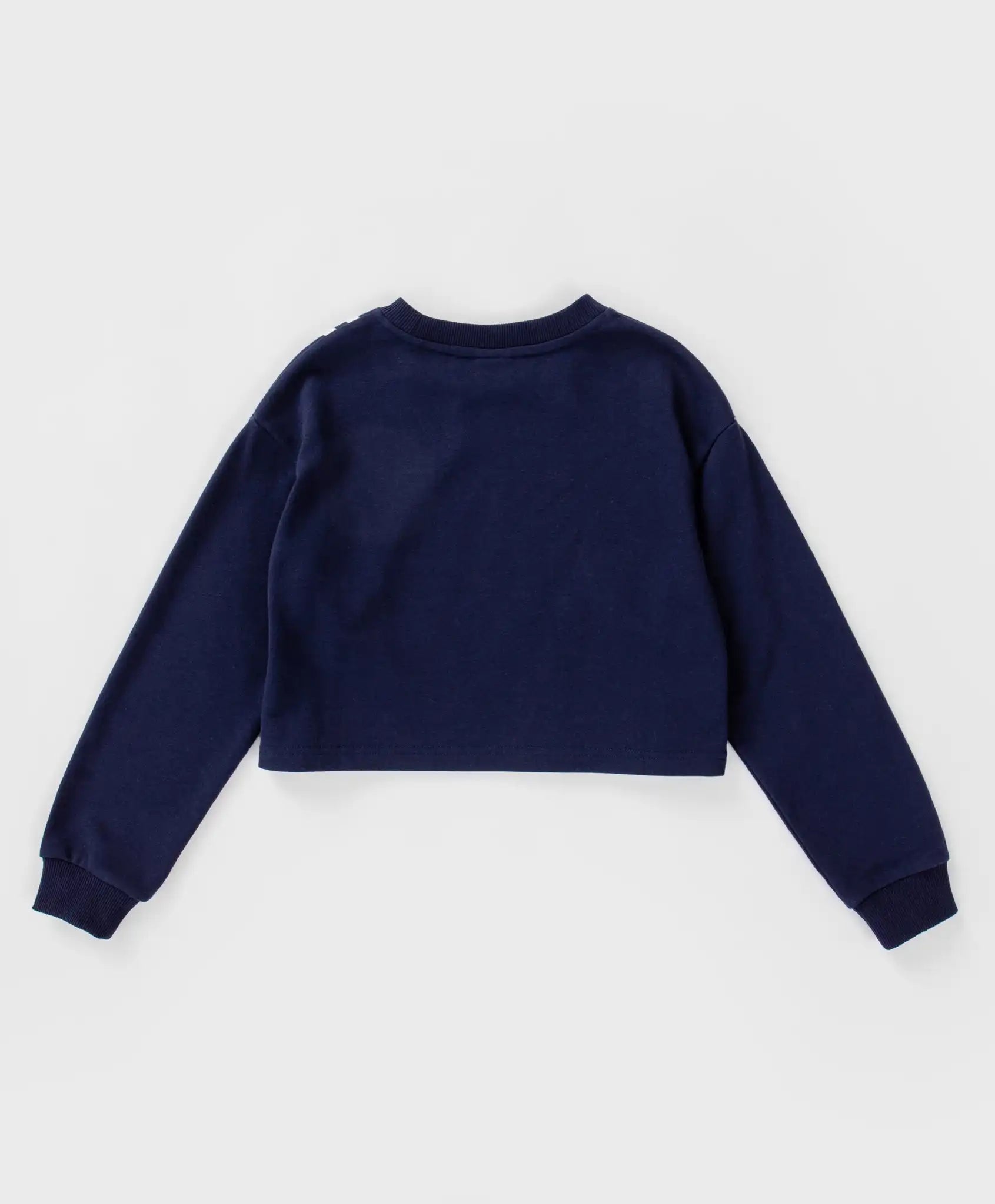 Hanorac scurt albastru pentru fată de la Button Blue. Hanoracul este confecționat din French Terry buclat, fiind plăcut la atingere și ușor de întreținut. Haina, într-o nuanță profundă de albastru, este practică și potrivită pentru orice ocazie – plimbări în aer liber, sport, școală sau întâlniri cu prietenii. Manșetele și gulerul elastice din material ripsat se mulează delicat pe corp și oferă un plus de căldură. Partea inferioară a hanoracului este lejeră, nu restricționează mișcările și permite combinarea cu diferite modele de pantaloni și blugi. Croiala lejeră oferă libertate de mișcare. Pe hanorac este aplicată o bandă decorativă alb-albastră tip lampas, care îl face mai interesant, fără a încărca vizual ținuta. Modelul, fără căptușeală, poate fi purtat ca prim strat sau ca strat secundar pentru un plus de căldură. Urmați instrucțiunile de îngrijire indicate pe eticheta interioară.