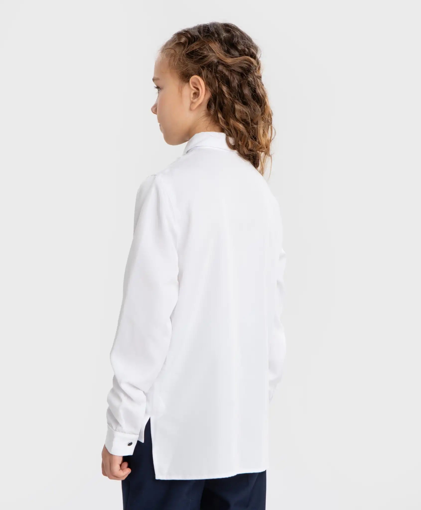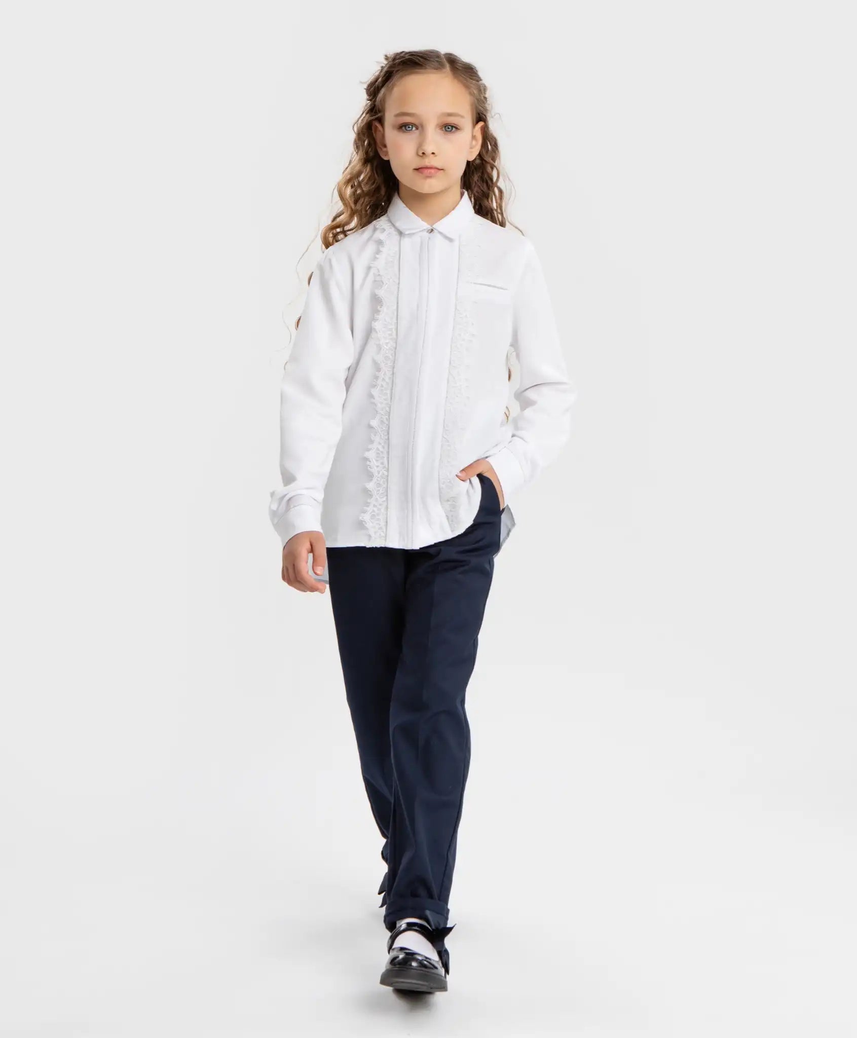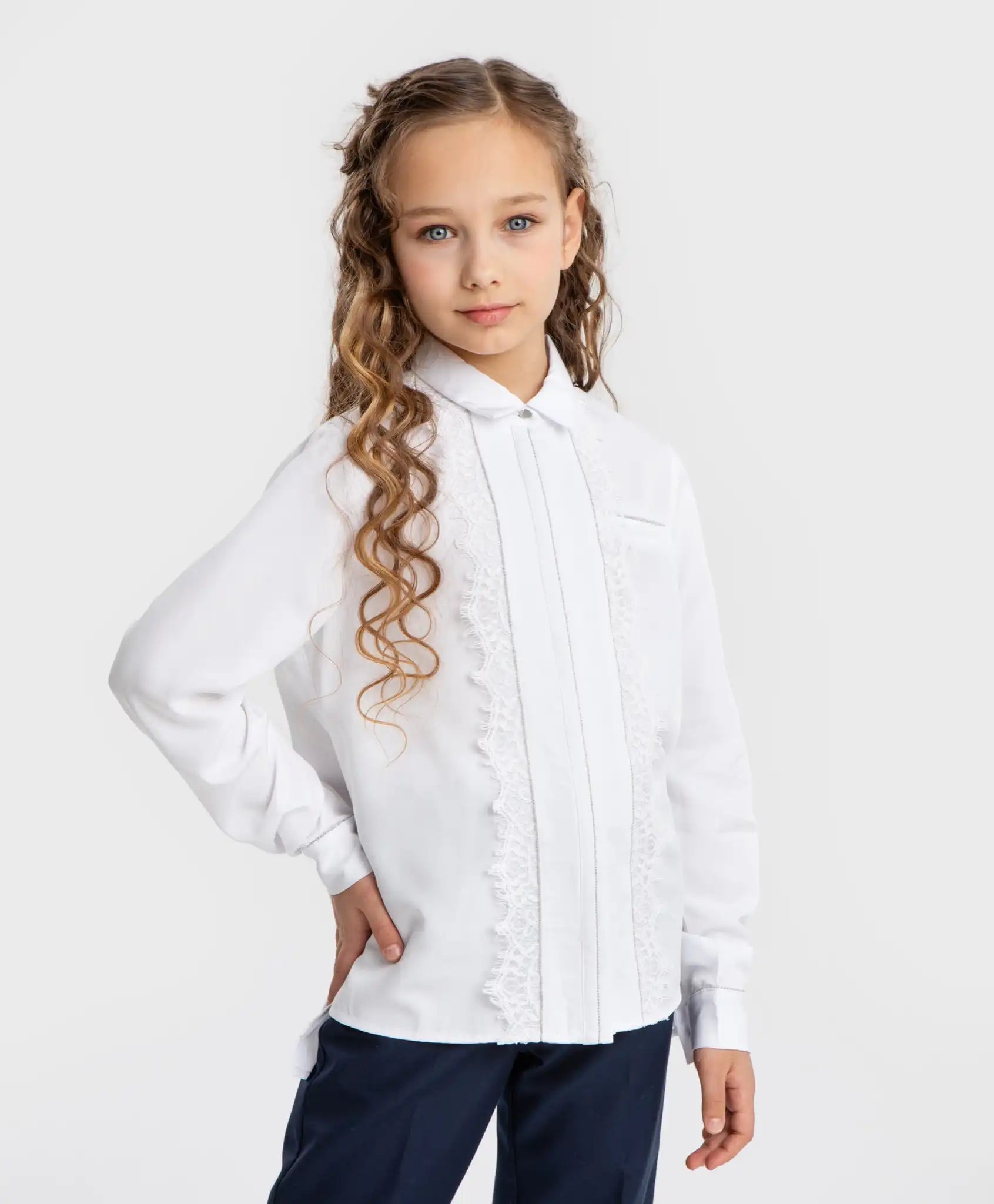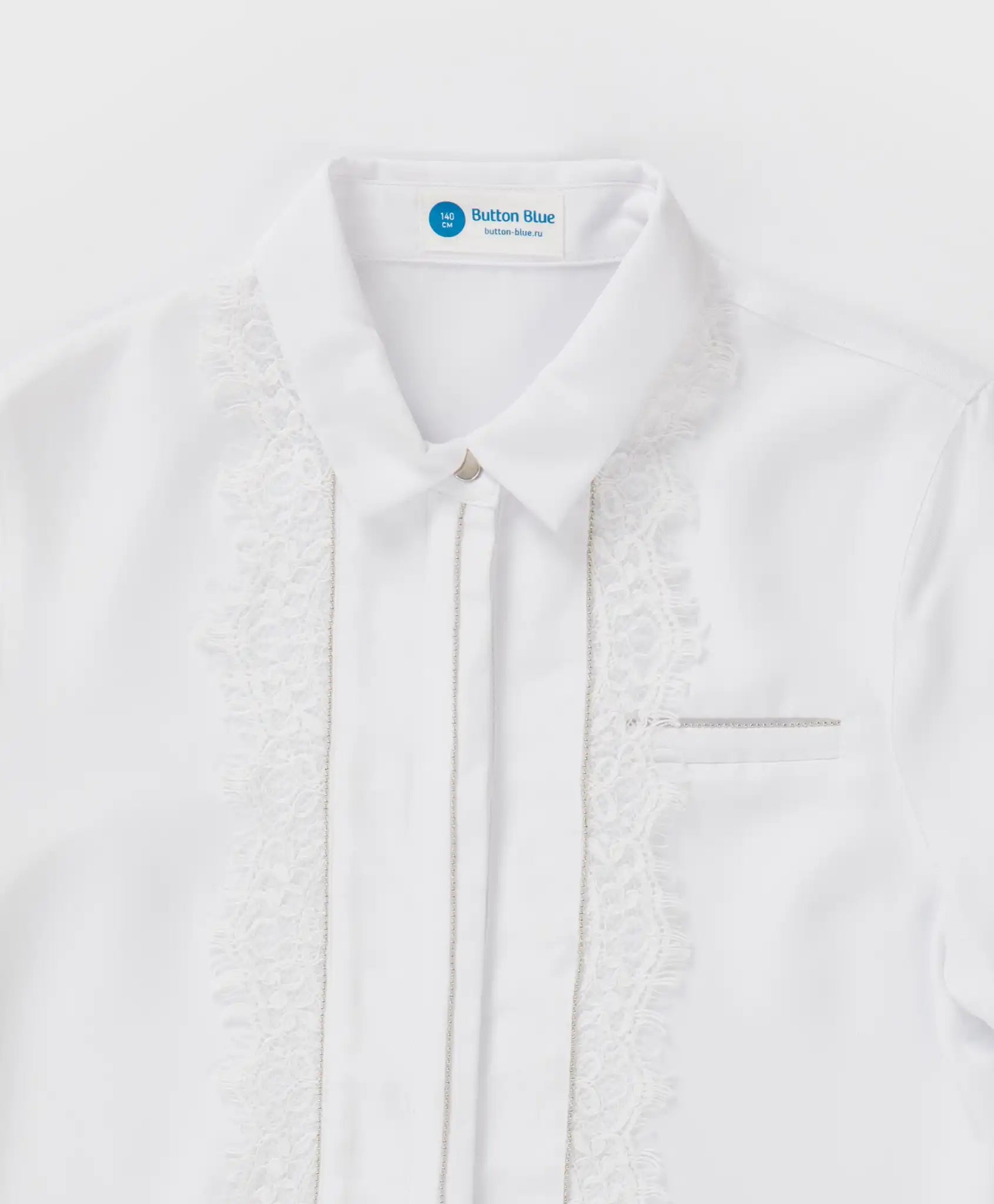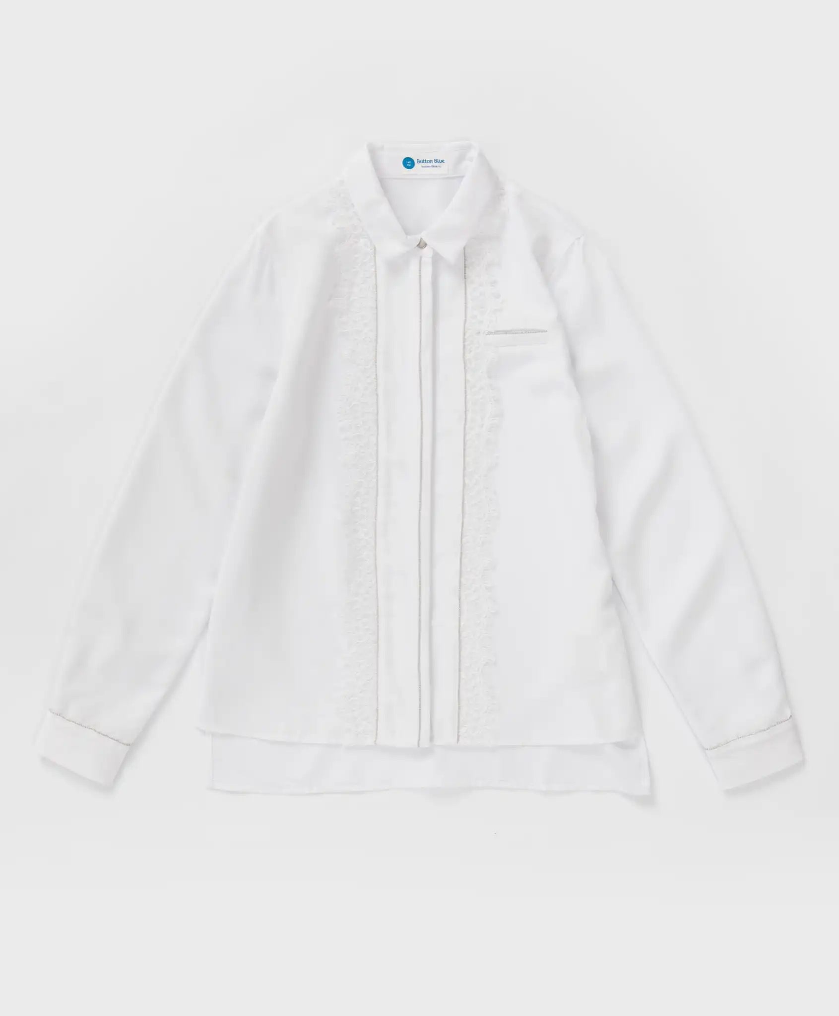 Bluză albă cu mâneci lungi și dantelă pentru fată de la Button Blue. Realizată din vâscoză, bluza este extrem de fină, moale și plăcută la atingere. Modelul are o densitate medie și o croială dreaptă, fiind confortabilă atât purtată băgată în pantaloni, cât și lăsată lejer. Nu strânge și nu limitează mișcările. Bluza cu guler întors se închide cu nasturi ton în ton, ascunși sub o platcă elegantă. Pe partea centrală a modelului este aplicată o dantelă albă delicată, decorată cu mici perle argintii. Aceleași perle sunt folosite pentru decorarea unui buzunar fals și a manșetelor, care se închid cu nasturi argintii. Toate aceste detalii conferă un aer festiv modelului, făcându-l ideal atât pentru mediul școlar, cât și pentru ocazii speciale. Spatele este ușor prelungit. Cu această bluză se pot crea numeroase ținute stilate, fie purtată individual, fie sub sacouri, jachete, pulovere sau veste. Urmați instrucțiunile de îngrijire indicate pe eticheta interioară.