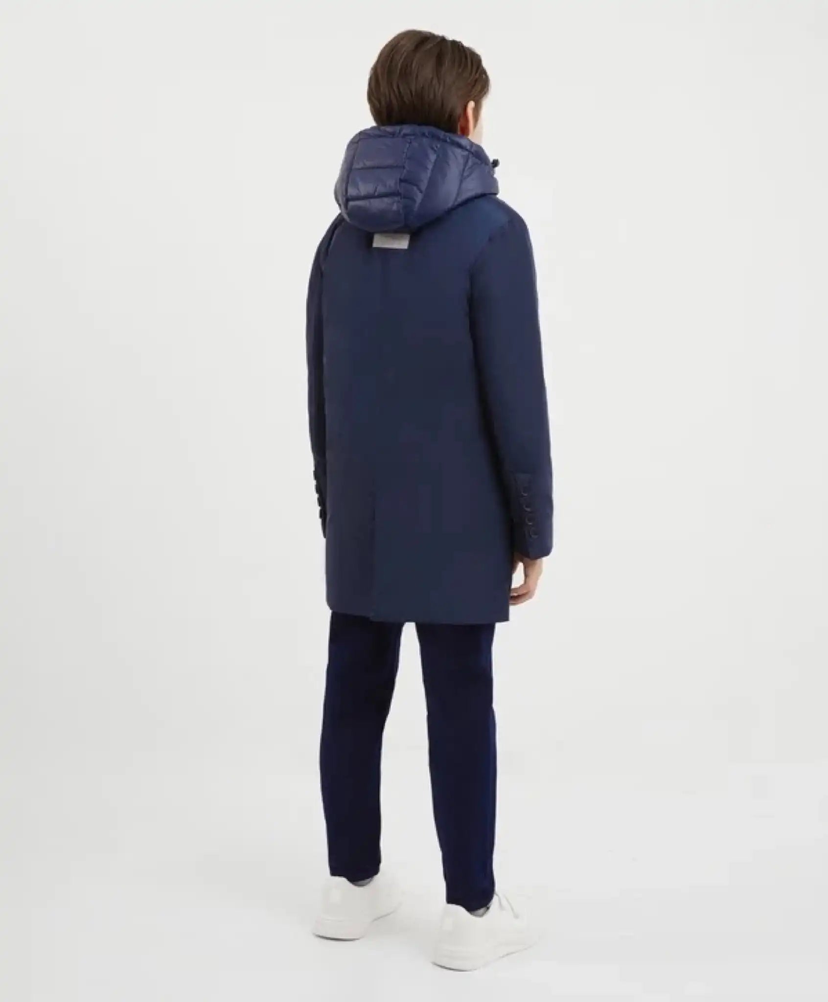 Geaca de tranziție albastră cu siluetă dreaptă și liberă va deveni un element indispensabil din garderoba băiatului. Este realizată din material tehnologic cu proprietăți de respingere a apei și izolație, care își menține forma foarte bine. Geaca este completată cu un strat de ploaie cu glugă, care se atașează de produs prin fermoare. Acest element funcțional permite purtarea prelungită a gecii și adaugă un aspect interesant și expresiv datorită jocului de texturi.