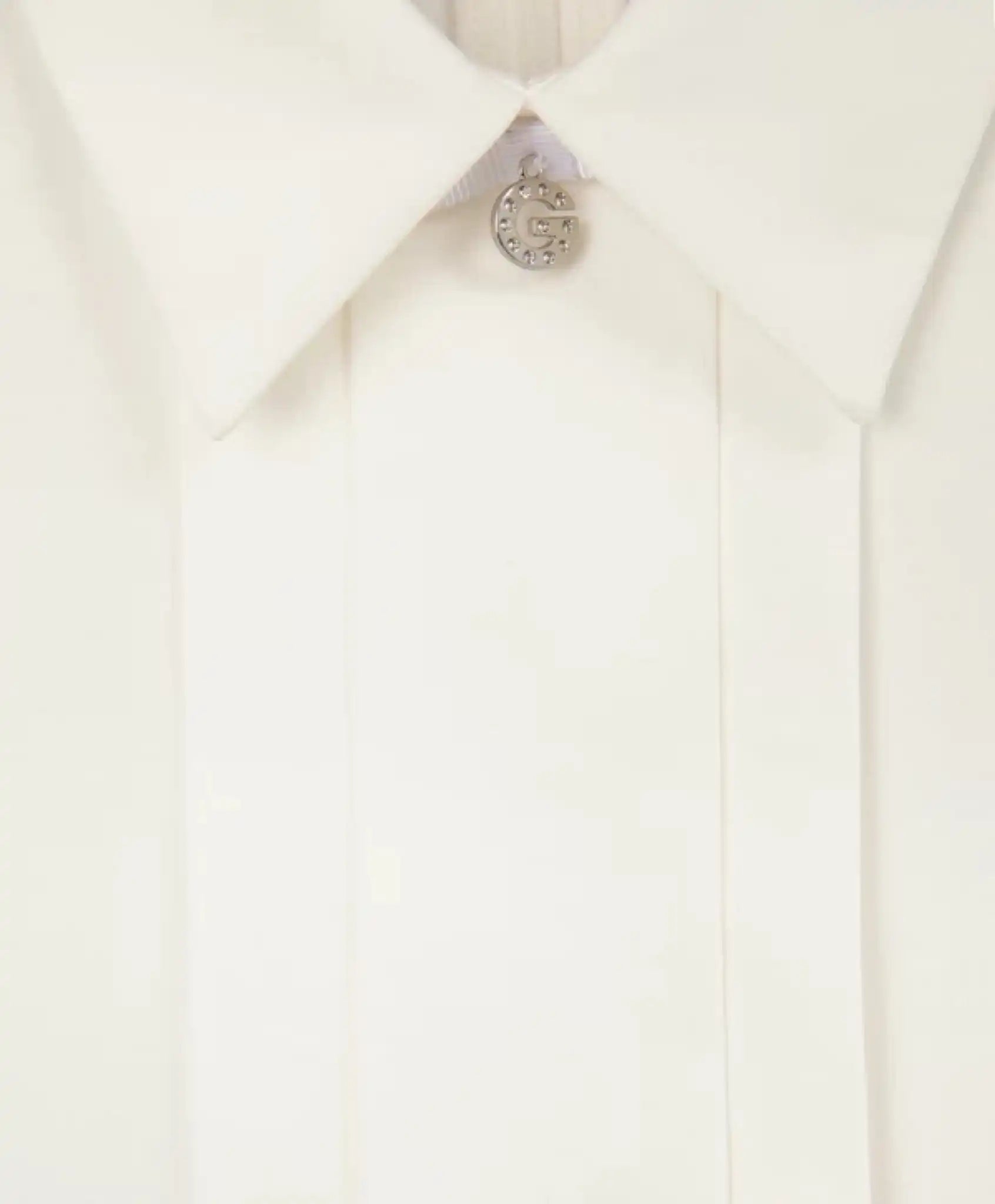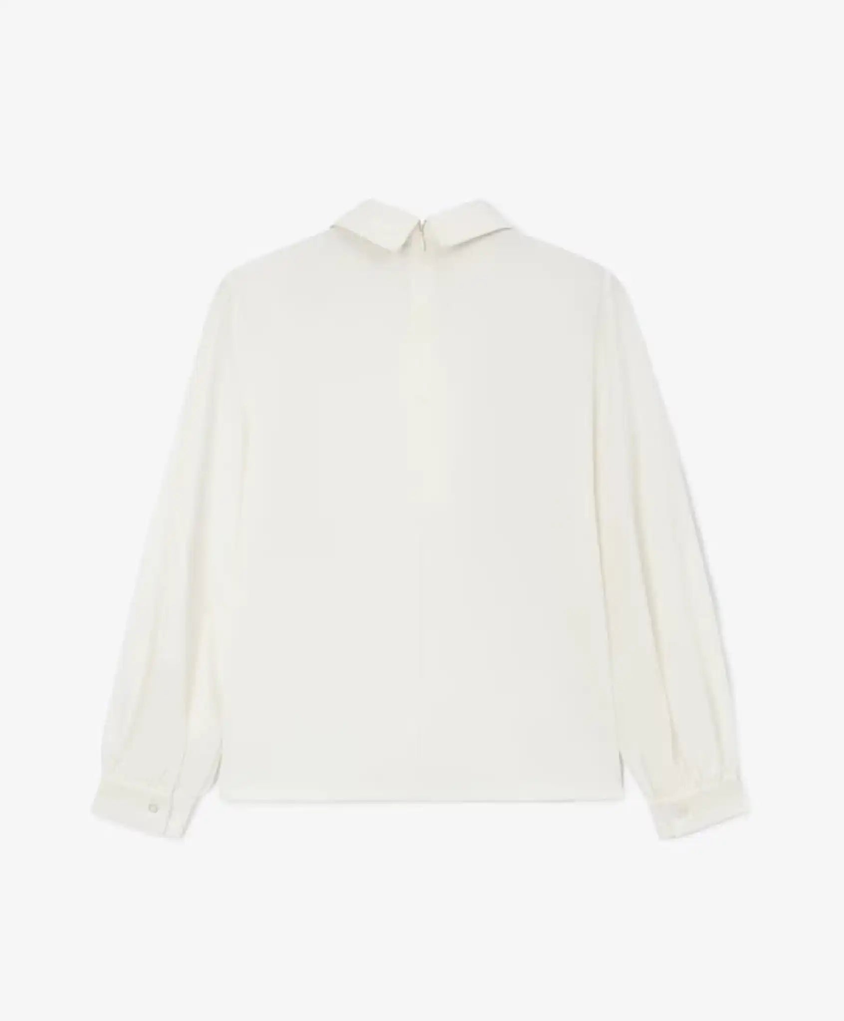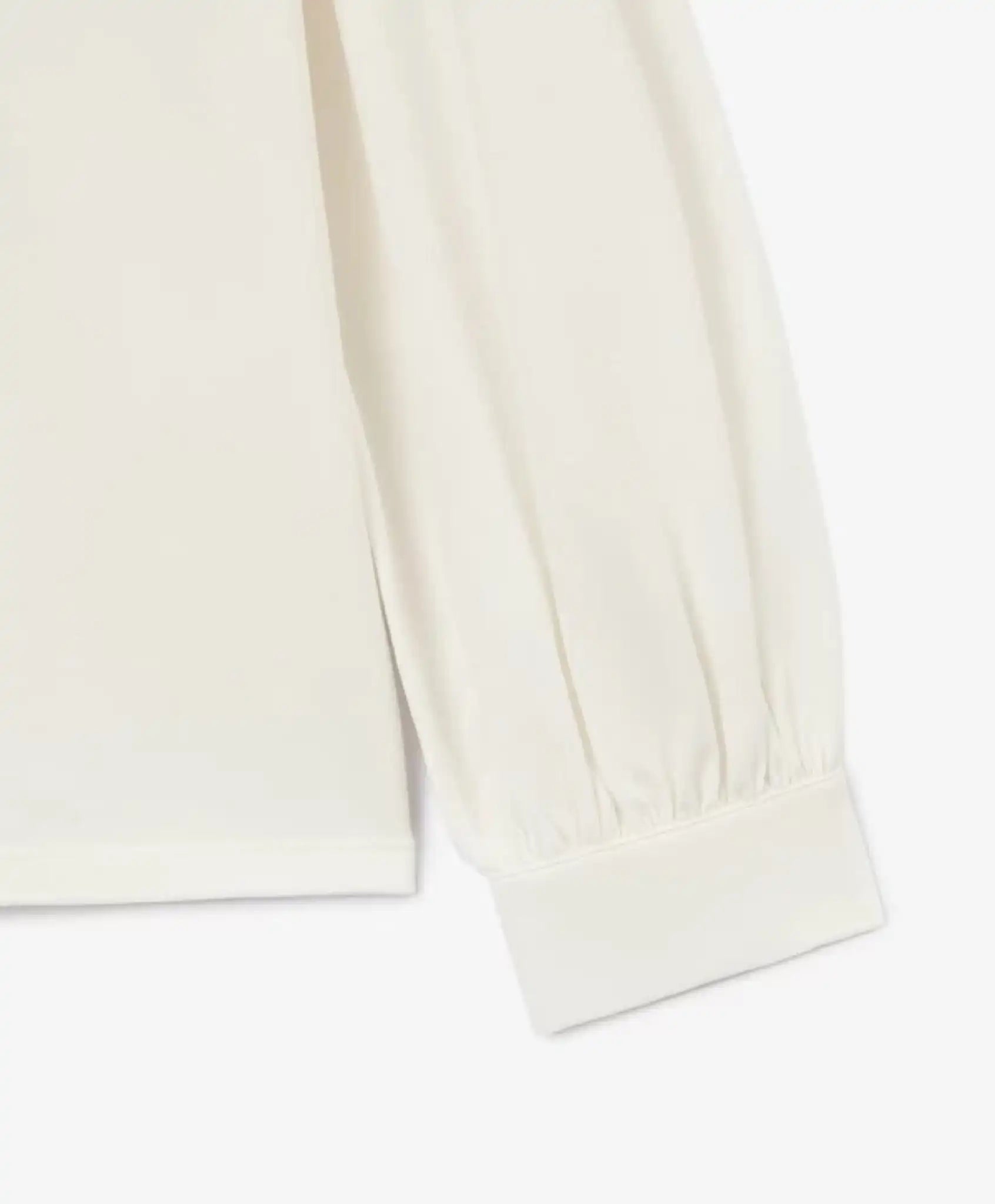Bluză tricotată lăptoasă, cu siluetă moderat lejeră, o alternativă excelentă la cămășile și bluzele clasice din material textil. Moale, elastică, plăcută la atingere, își păstrează bine forma și este ușor de purtat și întreținut. Modelul are un guler întors, completat de o panglică din reps, cu o literă metalică suspendată. În partea centrală a bluzei se află un pliu moale dublu, adăugând un plus de eleganță. Bluza se închide cu fermoar la spate.