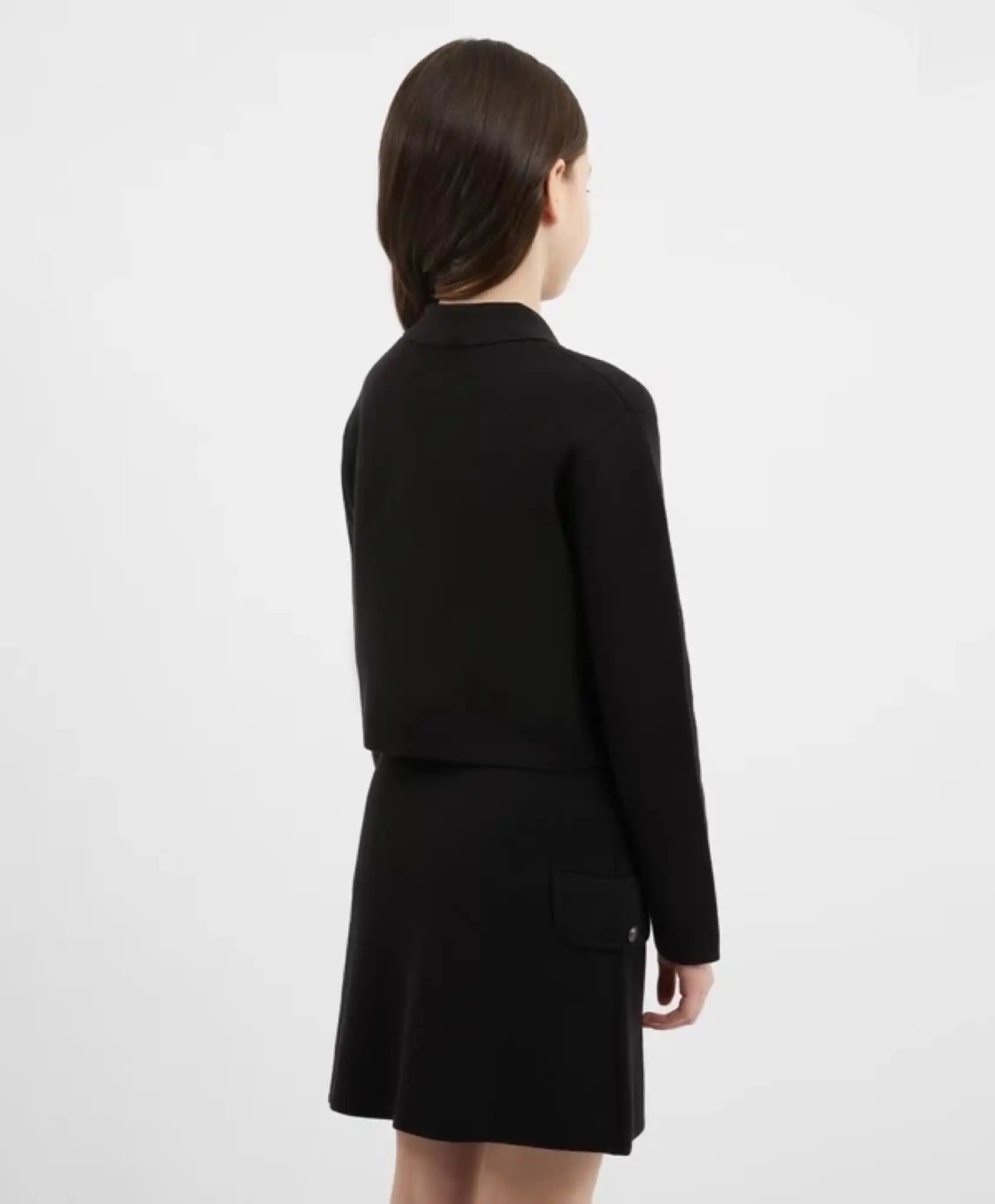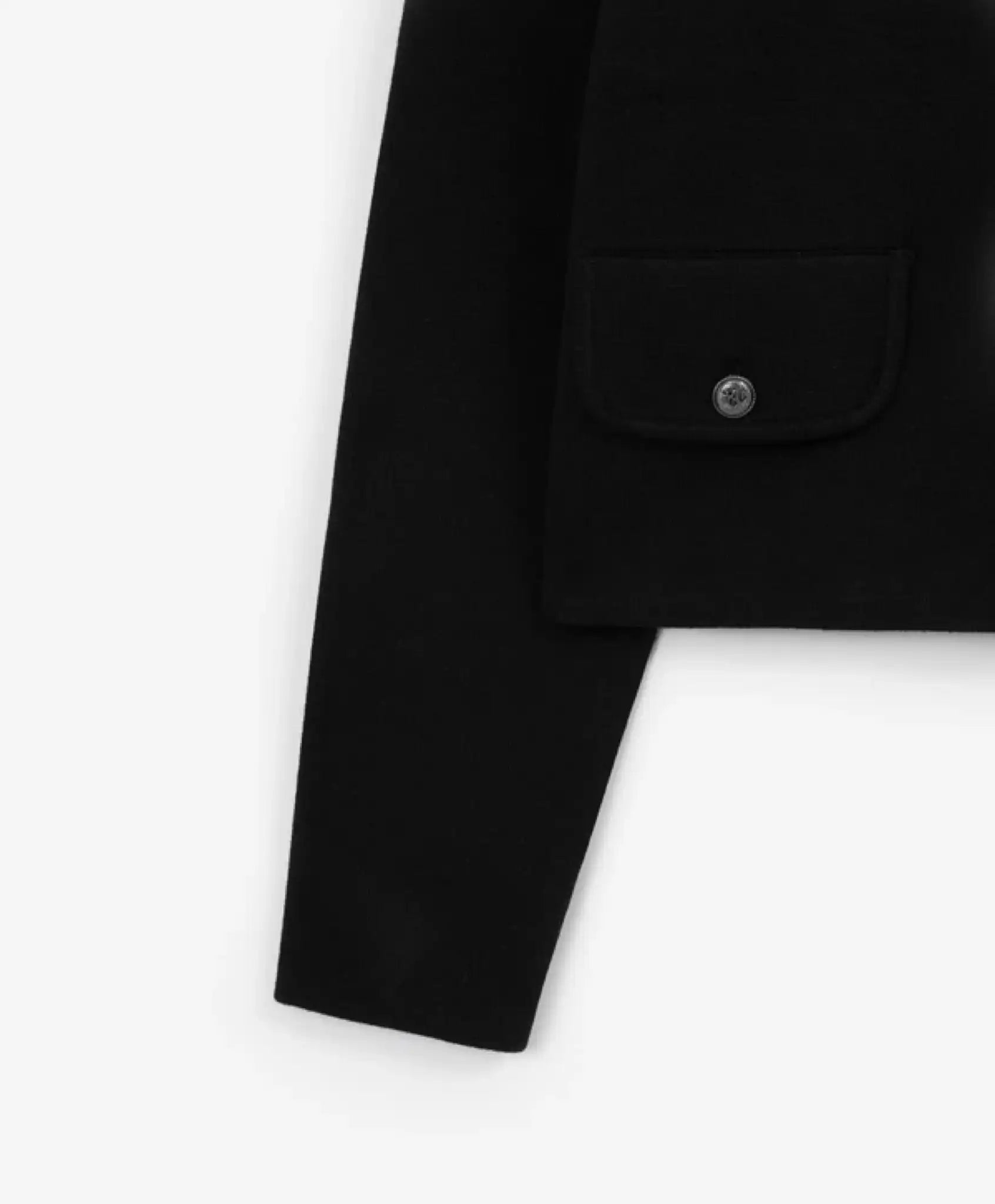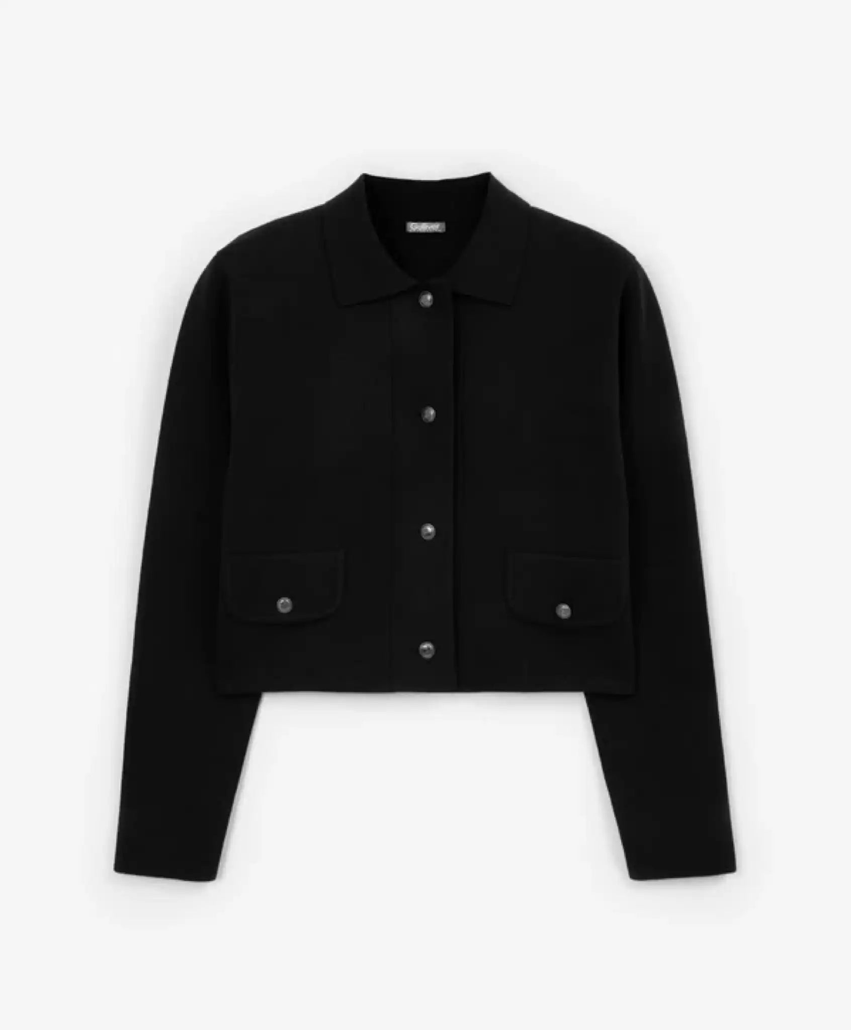 Sacou tricotat negru – un exemplu de eleganță, simplitate și rafinament în construirea unui look. Designul său sobru și stilat, precum și croiala perfectă, amintesc de modelul legendar al lui Coco Chanel, făcând din acest sacou o piesă ideală pentru o garderobă elegantă și confortabilă, în stil business. Datorită densității ridicate, tricotajul cu împletitură combinată dublă oferă o excelentă rezistență a formei, nu se deformează, nu se șifonează și își păstrează aspectul inițial pentru mult timp. Modelul se închide cu nasturi metalici cu gravură elegantă. Clapele false joacă un rol decorativ important, oferind modelului un aspect sofisticat. Sacoul nu are buzunare.