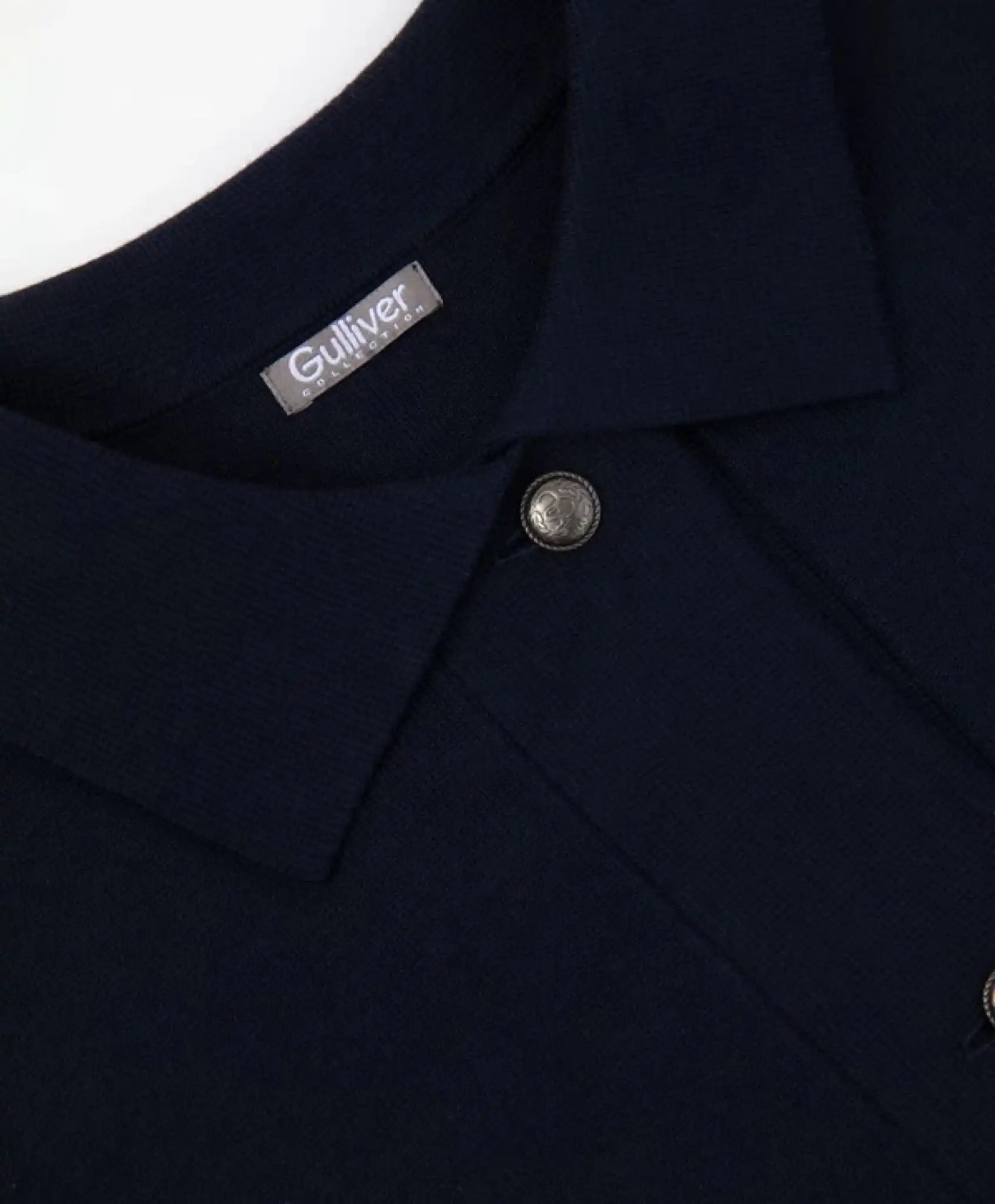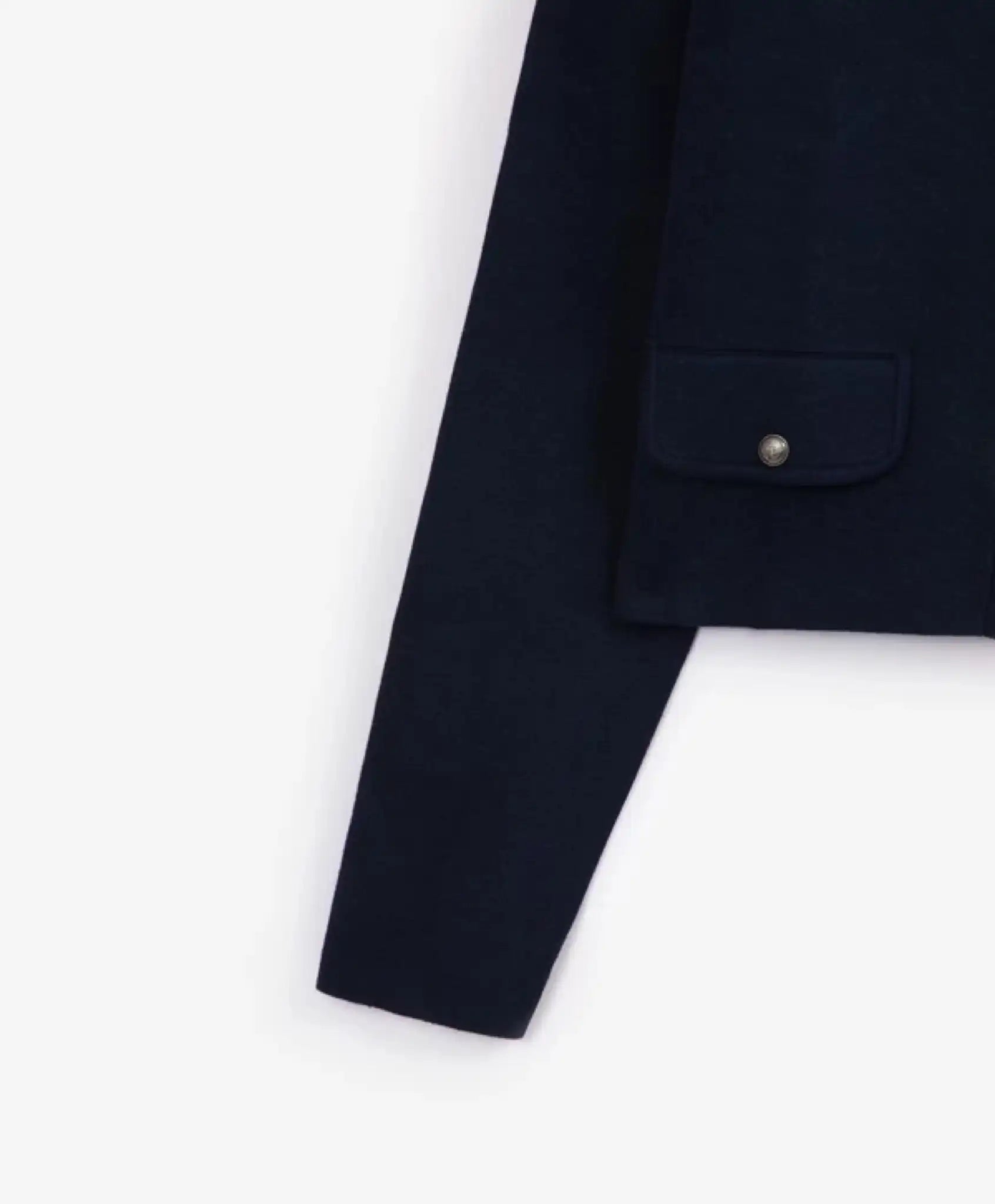 Jachetă tricotată albastră – un exemplu de eleganță, simplitate și rafinament în crearea unui look. Designul său sobru și stilat, împreună cu croiala precisă, amintesc de modelul legendar al lui Coco Chanel, făcând din această jachetă un element ideal pentru o garderobă elegantă și confortabilă în stil business. Datorită densității ridicate, jacheta tricotată cu împletitură combinată dublă își menține bine forma, nu se deformează, nu se șifonează și își păstrează aspectul inițial pentru mult timp. Modelul se închide cu nasturi metalici cu gravură elegantă. Clapele decorative joacă un rol important în aspectul sofisticat al modelului. Jacheta nu are buzunare.