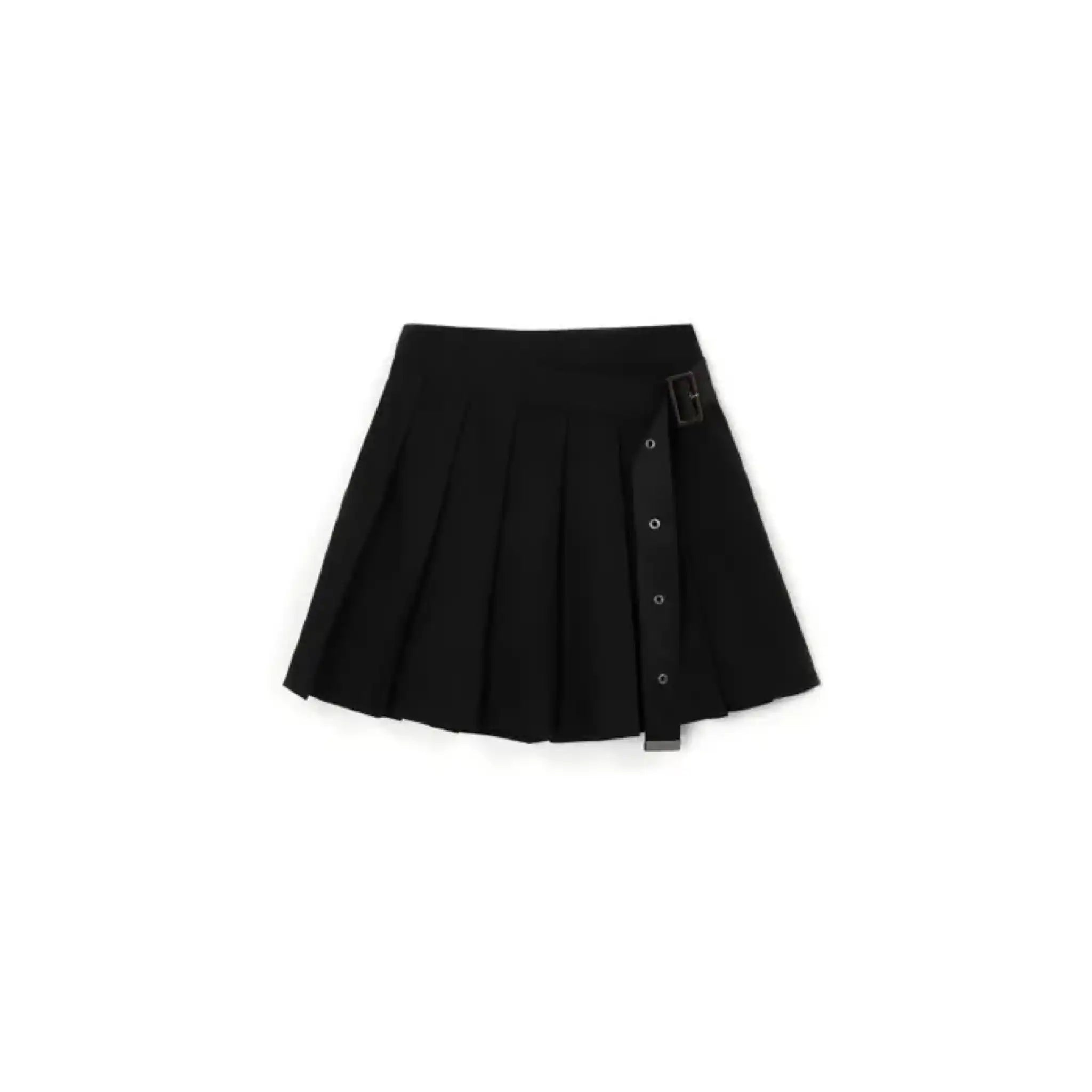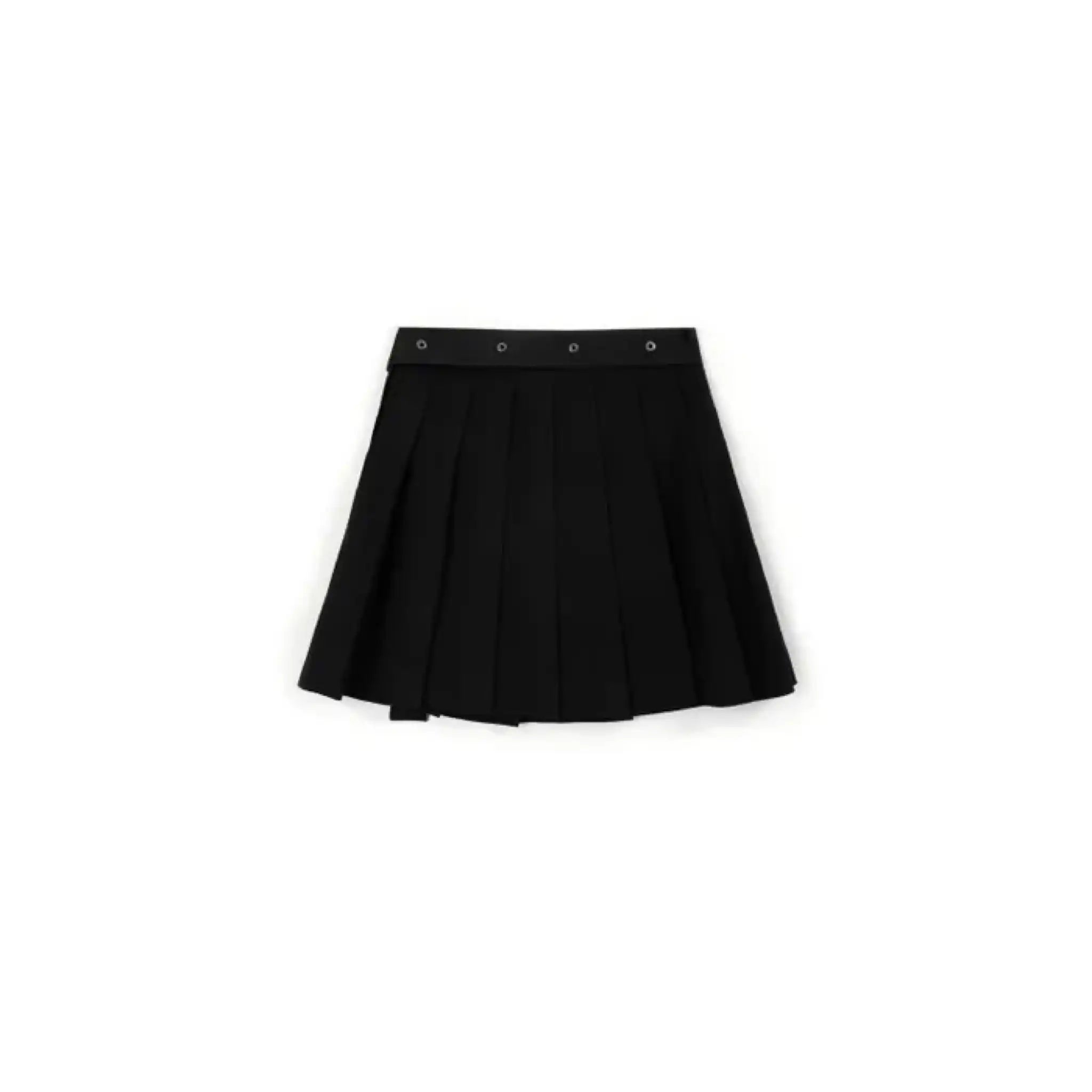 Fustă școlară neagră pentru adolescentă. Detaliul atașat este fixat cu ajutorul unei curele cu găuri metalice. Această soluție de design, ce imită stratificarea, diferențiază fusta de modelele clasice și permite diversificarea ținutelor școlare. Piesa se închide cu un fermoar ascuns în cusătura laterală. Se potrivește perfect cu o cămașă cu decupaje la guler din colecția școlară Gulliver.
