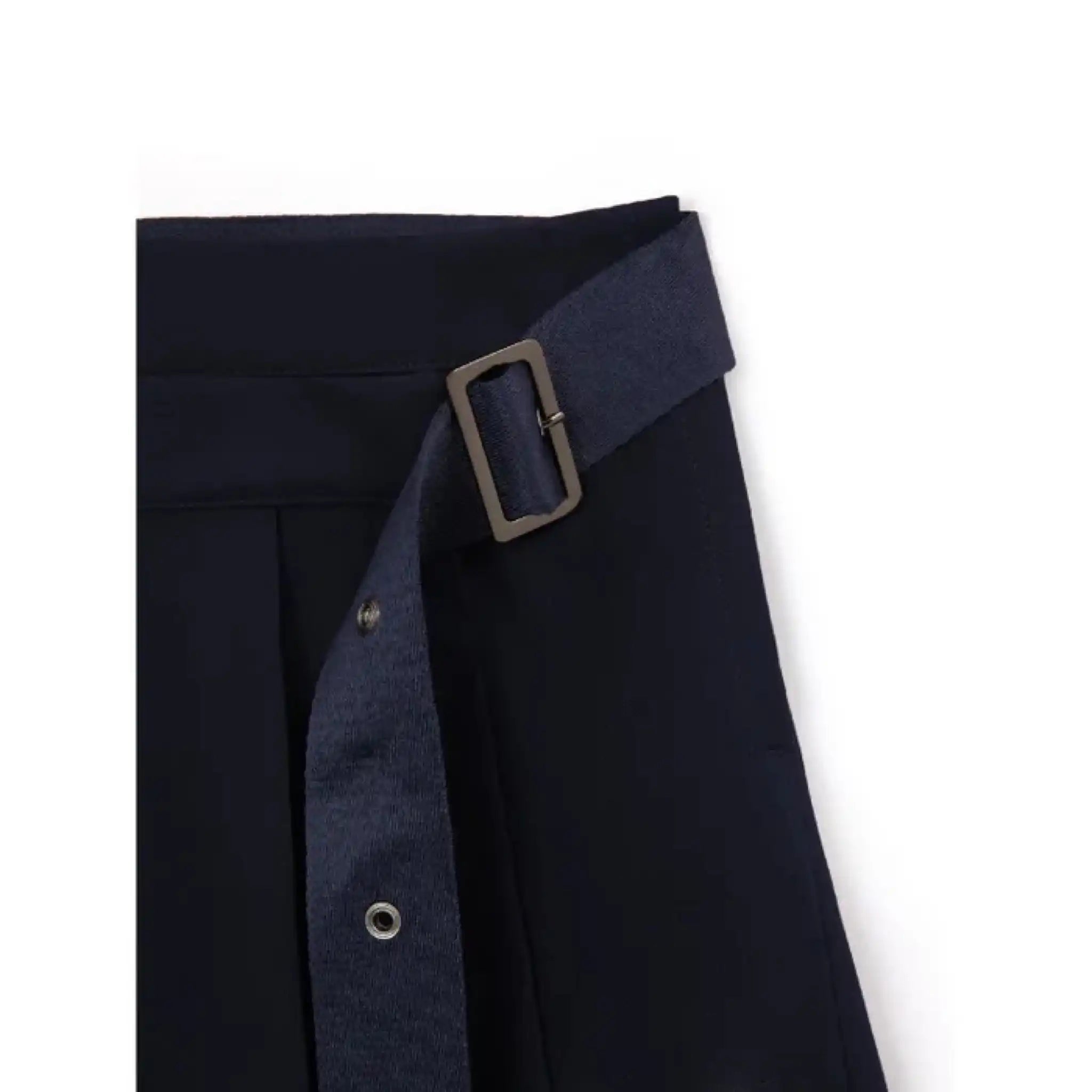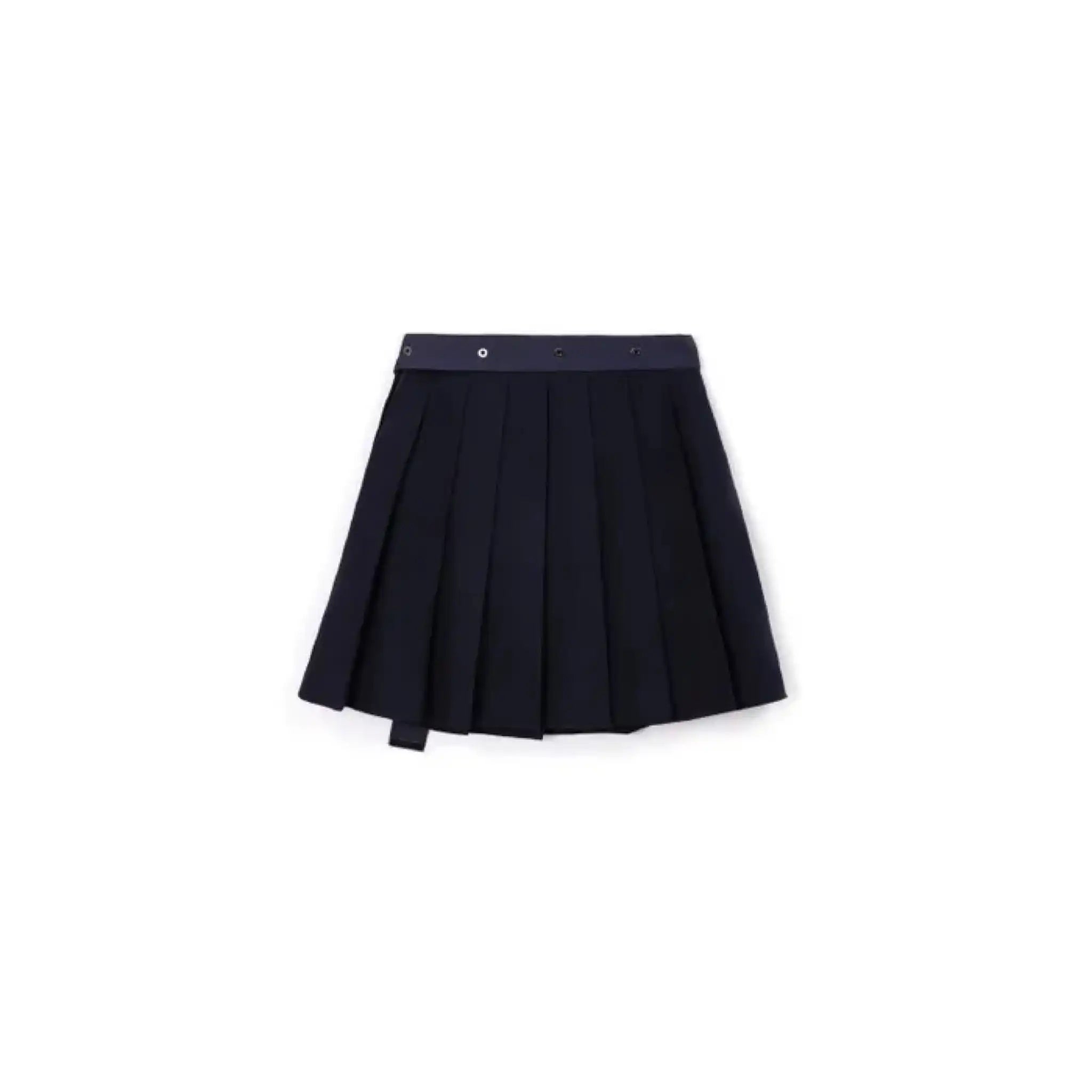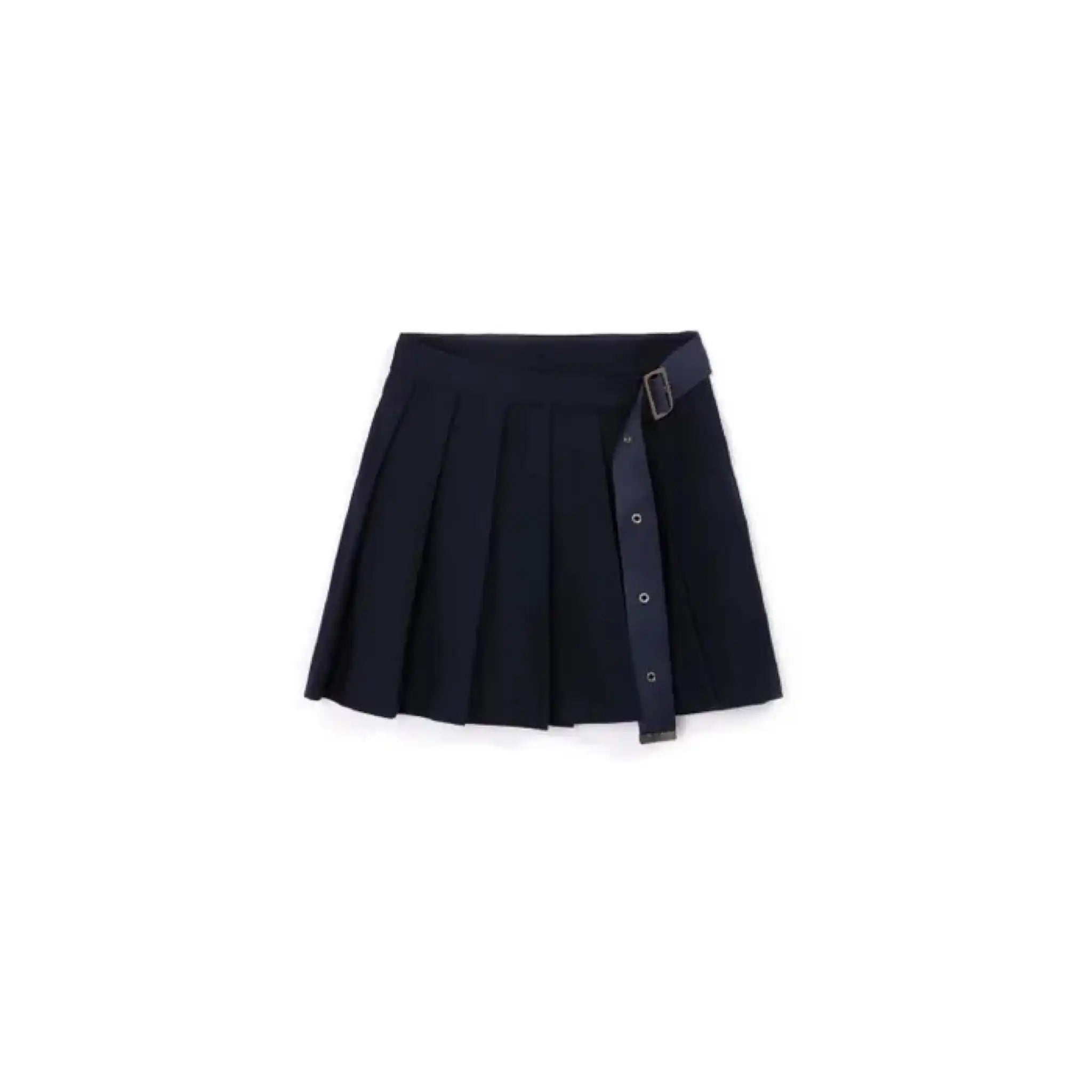 Fustă școlară albastră pentru fete. Model pentru adolescentă cu detaliu atașat în față. Detaliul este fixat cu ajutorul unei curele cu găuri metalice. Această soluție de design, ce imită stratificarea, diferențiază fusta de modelele clasice și permite diversificarea ținutelor școlare. Piesa se închide cu un fermoar ascuns în cusătura laterală. Se potrivește perfect cu o cămașă cu decupaje la guler din colecția școlară Gulliver.