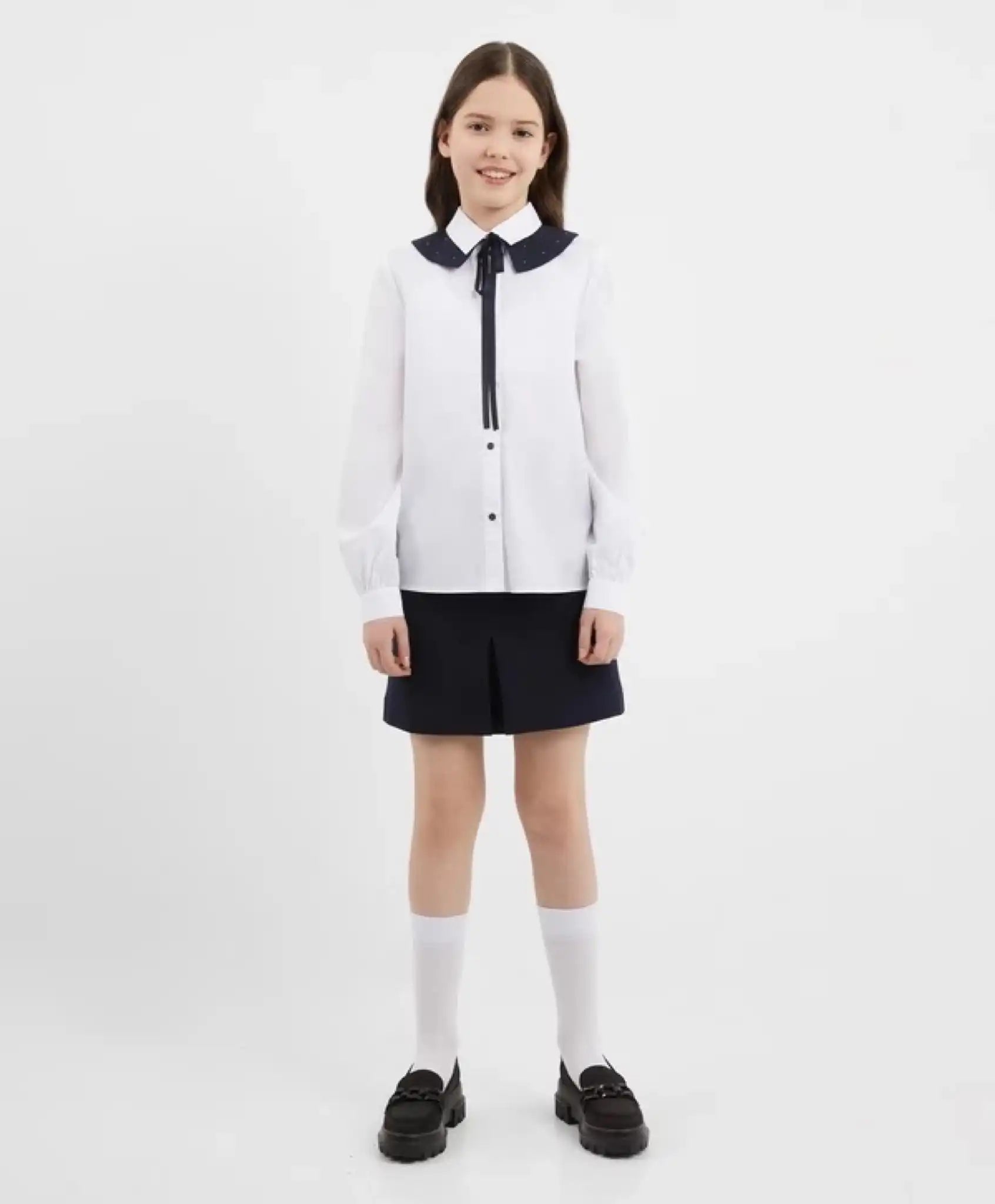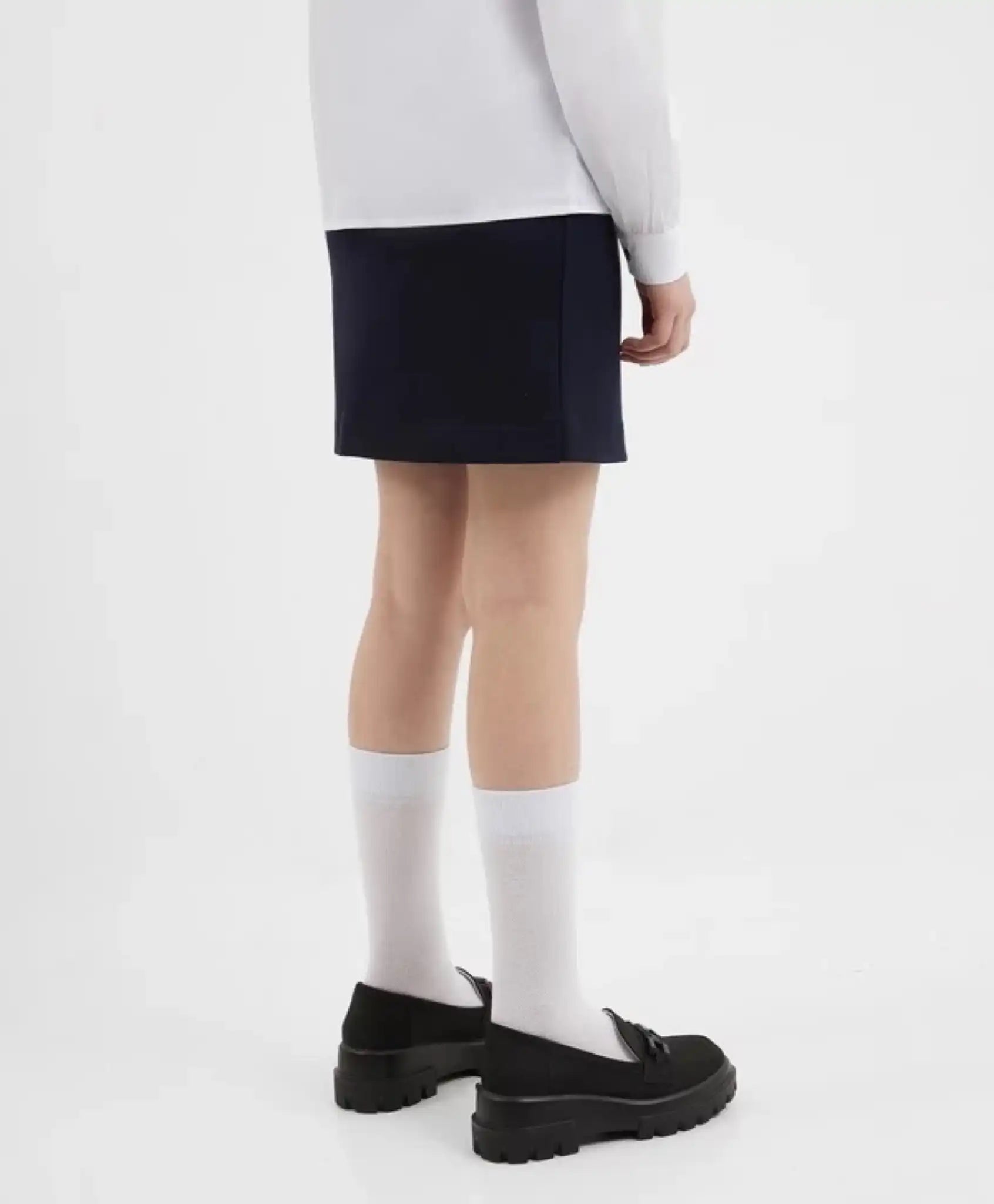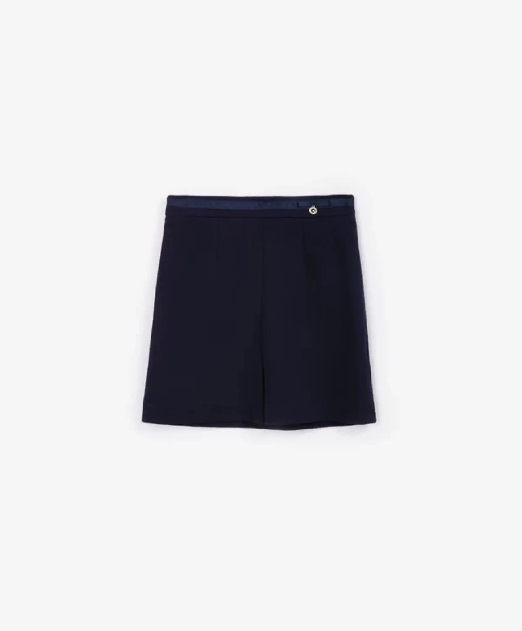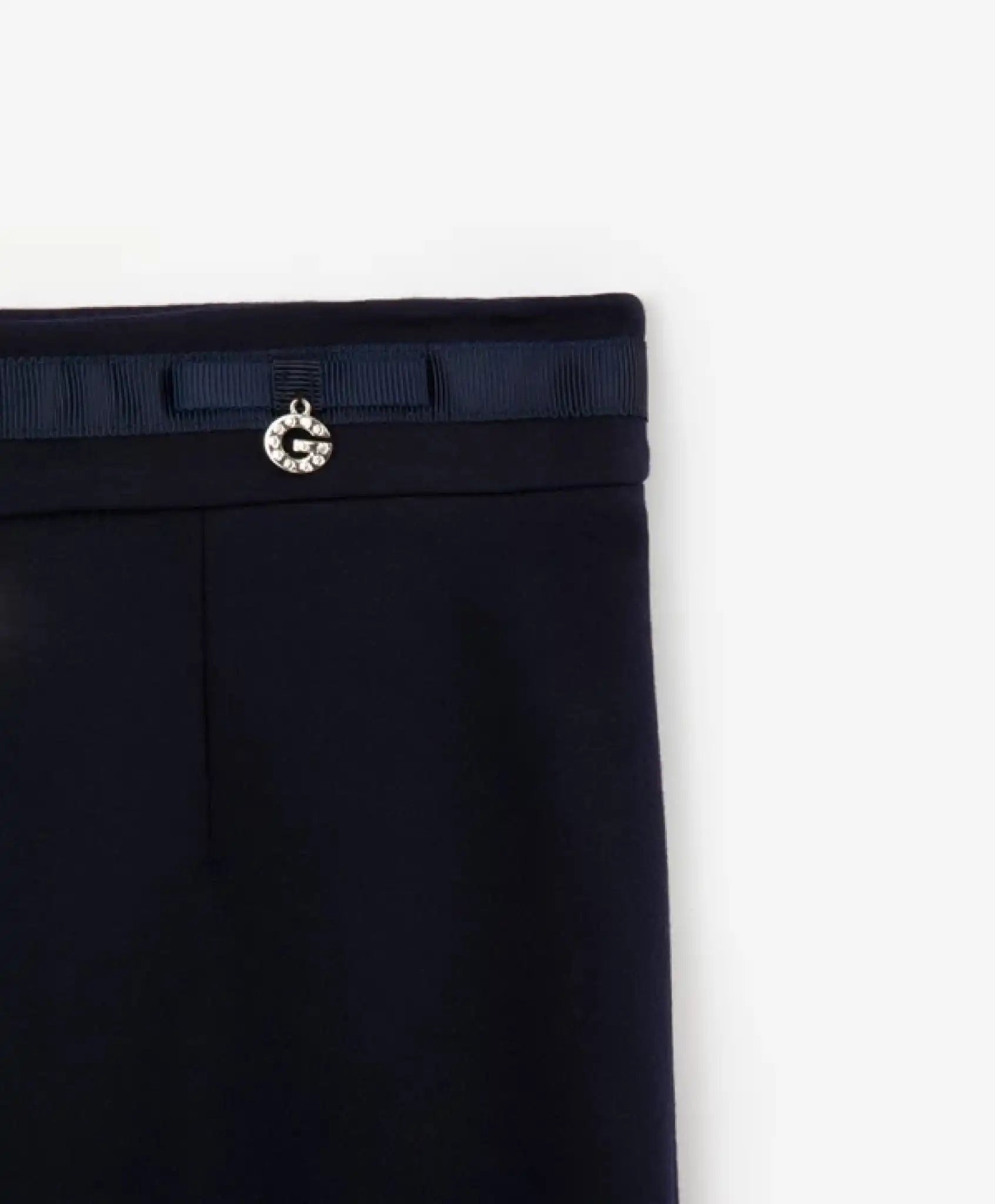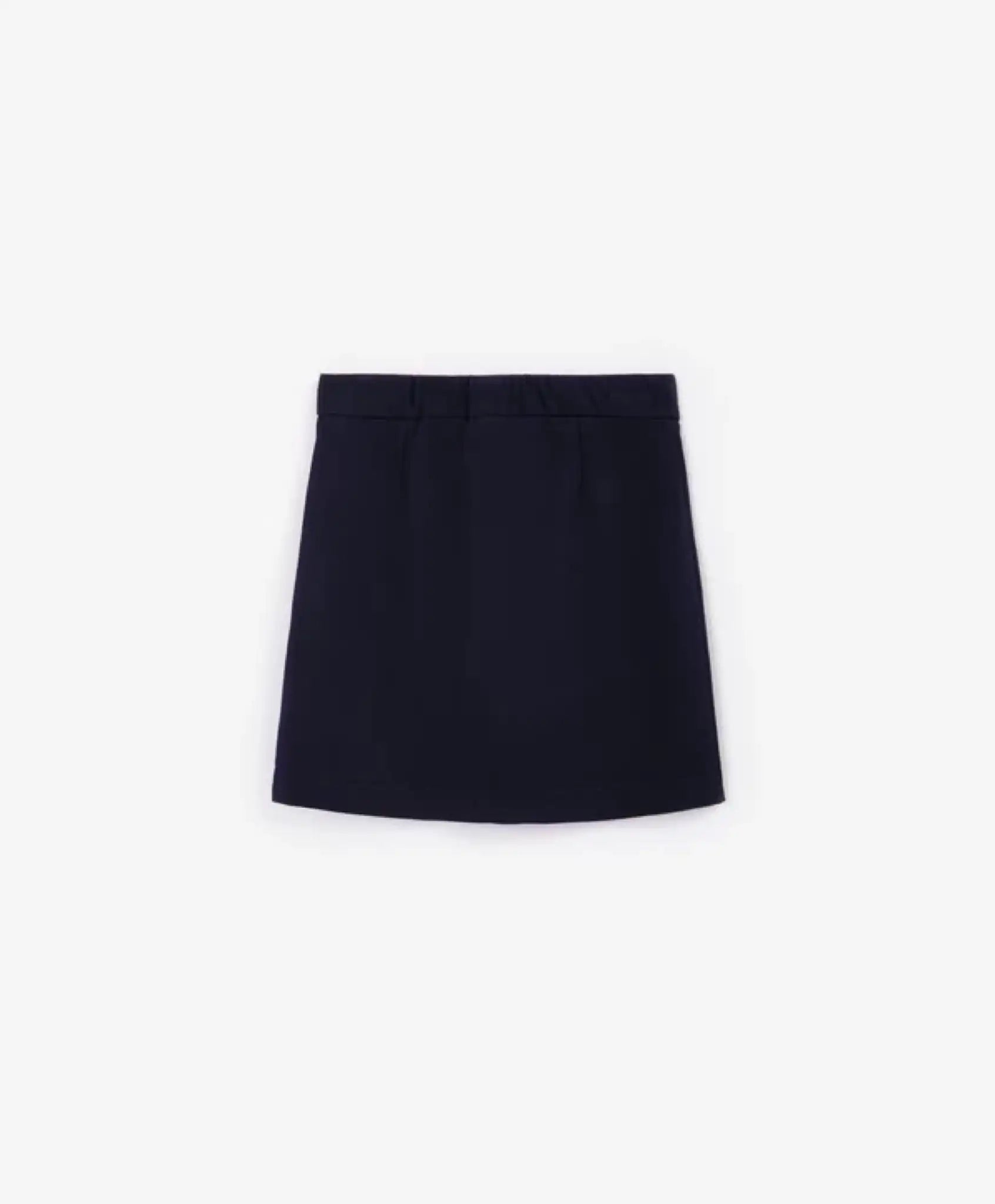 Fustă albastră cu croială trapezoidală și betelie elastică – o alegere excelentă pentru cele care vor să arate impecabil cu efort minim, deoarece modelul nu are sistem de închidere! Este realizată dintr-un material moale și stabil, cu un conținut ridicat de vâscoză. Datorită fibrelor elastice din compoziție, fusta se întinde bine și nu restricționează mișcările copilului. Modelul este completat de detalii decorative stilate, care îi oferă un farmec aparte: o panglică reps ce imită buzunarele și o fundiță mică, decorată cu o literă metalică și cristale.